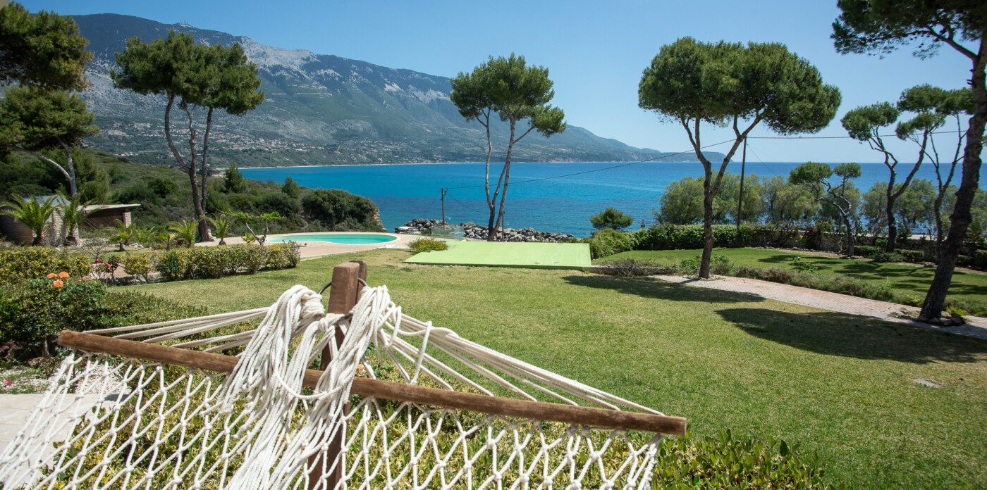 Οι εξωτερικοί χώροι περιλαμβάνουν χώρους με ώριμα δέντρα και καταπράσινο γκαζόν. Μια ιδιόμορφη εξαγωνική πέργκολα σας προσκαλεί να χαλαρώσετε στη σκιά της, ενώ μια αιώρα σας καλεί για χαλαρές σιέστες. Απολαύστε μαγευτική θέα στη θάλασσα και το βουνό από την ελκυστική πισίνα ή χαλαρώστε στη βεράντα της σουίτας lounge. Οι κλιμακωτοί κήποι σε επίπεδο και μια κοντινή προβλήτα ολοκληρώνουν αυτό το ειδυλλιακό σκηνικό.