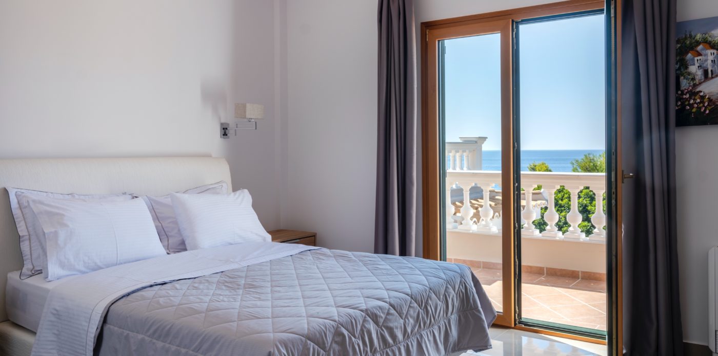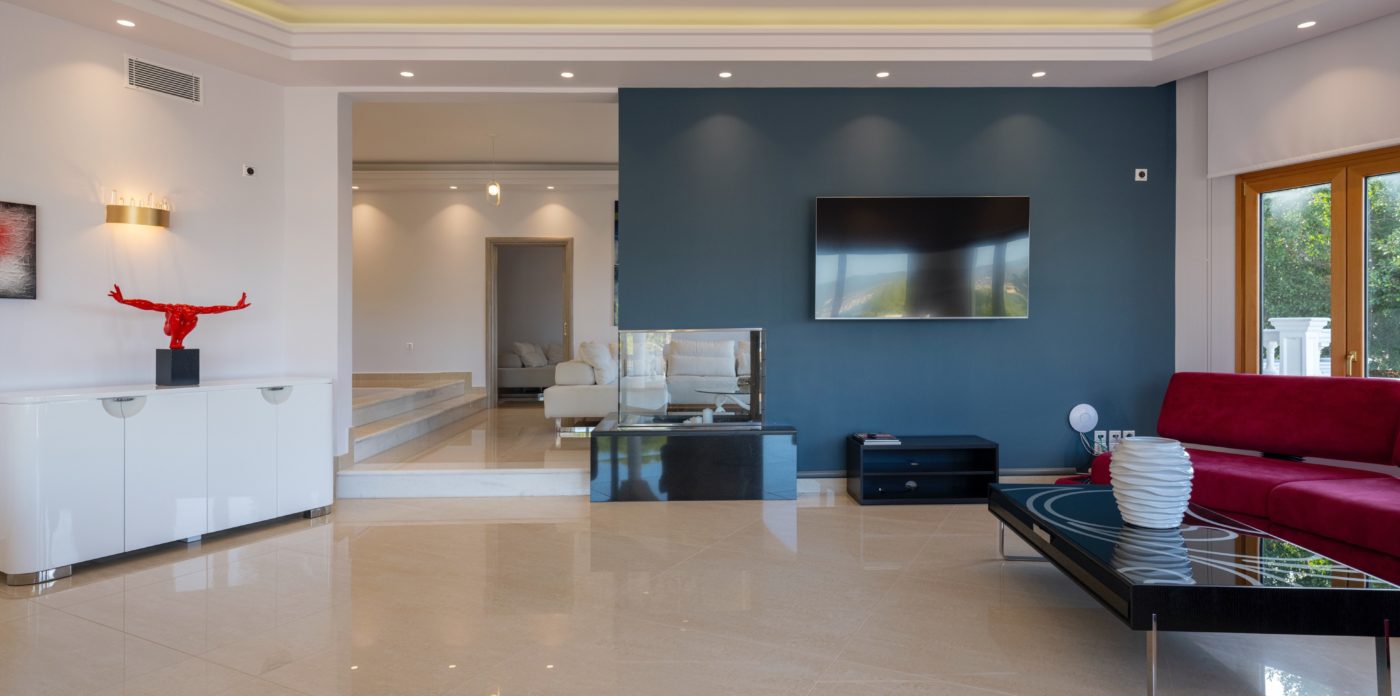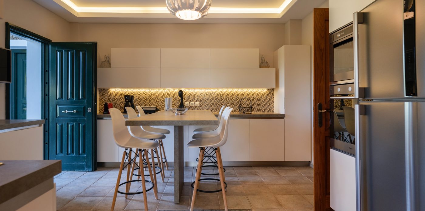 Οι εσωτερικοί χώροι της κύριας κατοικίας είναι παρθένοι και λιτοί, δημιουργώντας μια ανέμελη και χαλαρή ατμόσφαιρα. Μέσα στα 1000 τ.μ. ζωτικού χώρου ενσωματώνονται δύο ανεξάρτητοι ξενώνες 60 τ.μ. και 120 τ.μ., οι οποίοι μοιράζονται την ίδια εκπληκτική θέα.