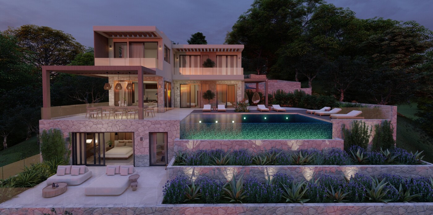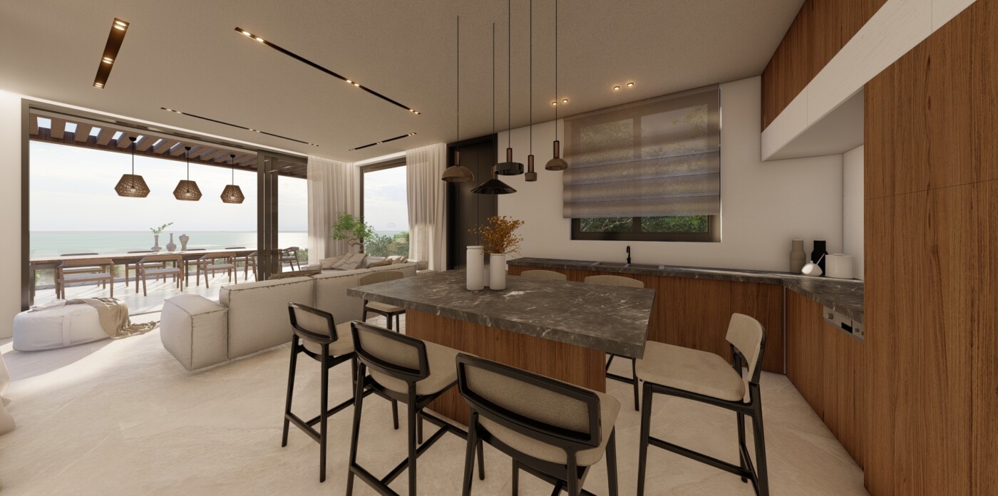 Η κομψή, μοντέρνα κουζίνα, που διαθέτει ένα κεντρικό νησί με θέσεις για οκτώ άτομα, θα έχει θέα σε ατελείωτες γαλάζιες προοπτικές με φόντο τα καλύτερα έργα τέχνης της φύσης. Η βίλα θα διαθέτει πέντε κομψά υπνοδωμάτια με ιδιωτικό μπάνιο, το καθένα από τα οποία προσφέρει ιδιωτικό πανόραμα στη θάλασσα.