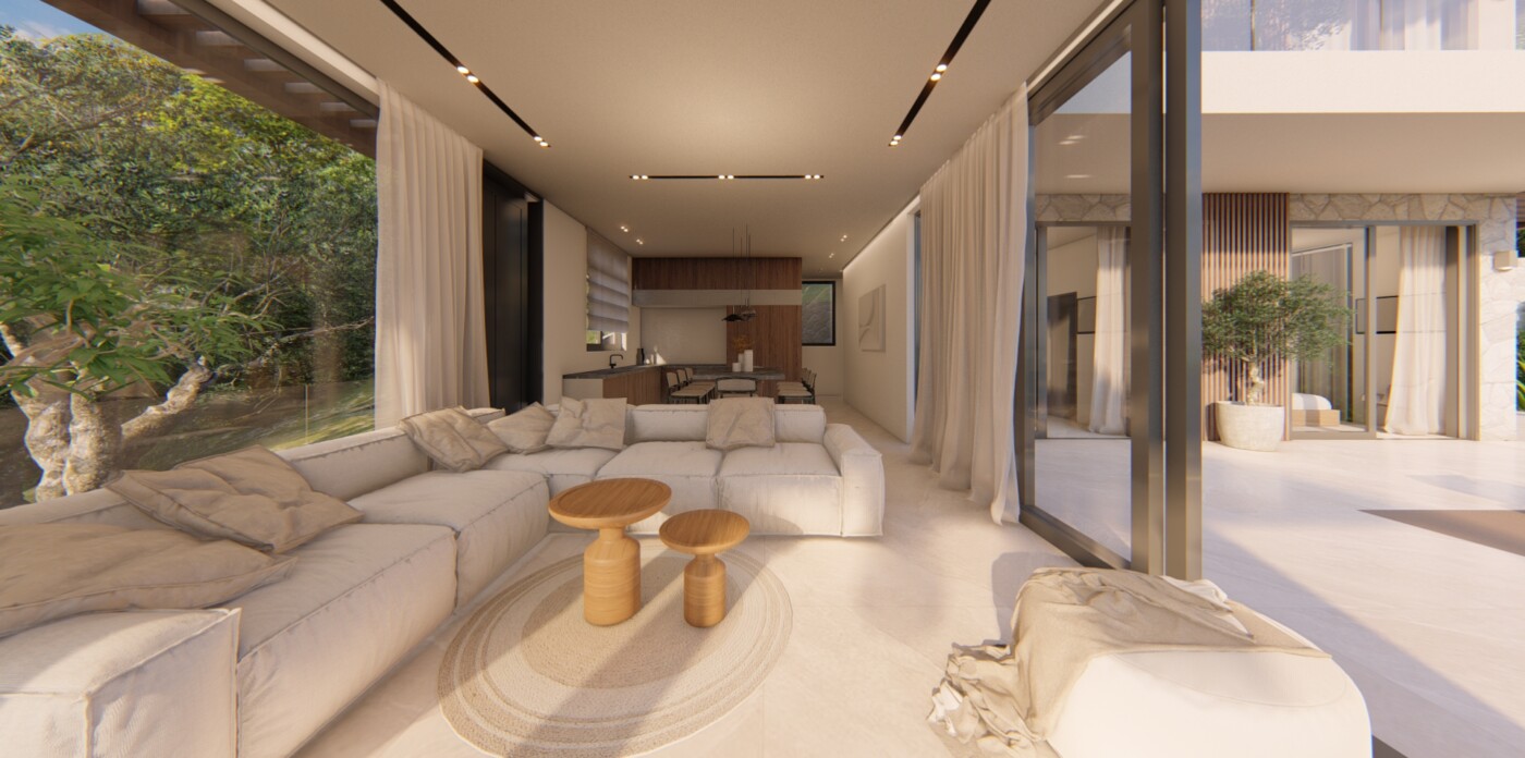 Μπείτε σε ένα φωτεινό και ευάερο καταφύγιο με έναν ενιαίο χώρο καθιστικού, όπου ο κομψός μοντέρνος σχεδιασμός τονίζεται από μεγάλα παράθυρα σε μήκος τοίχου που προσφέρουν θέα στον κήπο και συρόμενες πόρτες που ανοίγουν στην πισίνα και τη βεράντα.