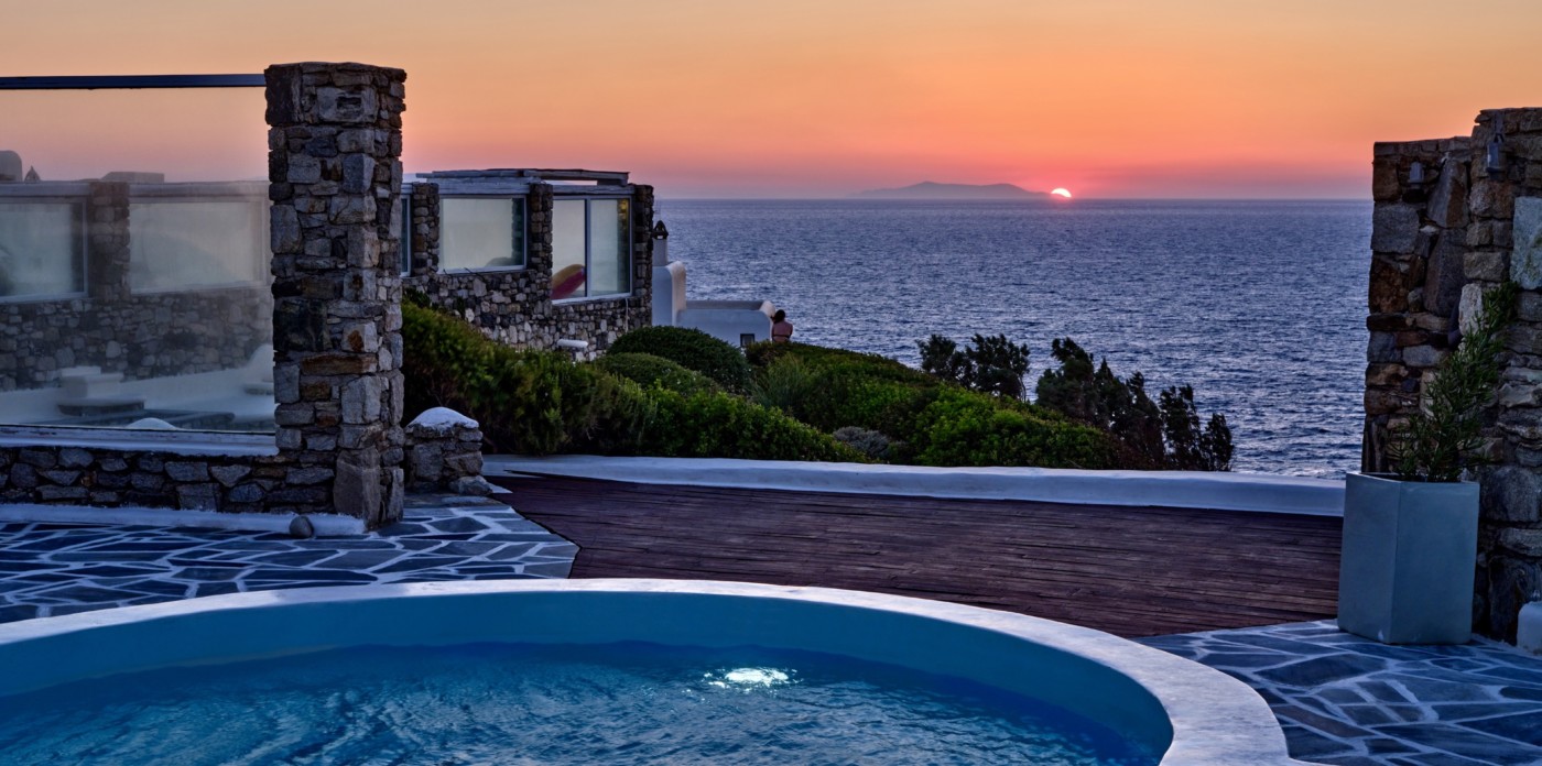 Η βίλα Άνεμος, ριζωμένη στην κλασική κυκλαδίτικη γοητεία, προσφέρει εκπληκτική πανοραμική θέα στη μυκονιάτικη ομορφιά.