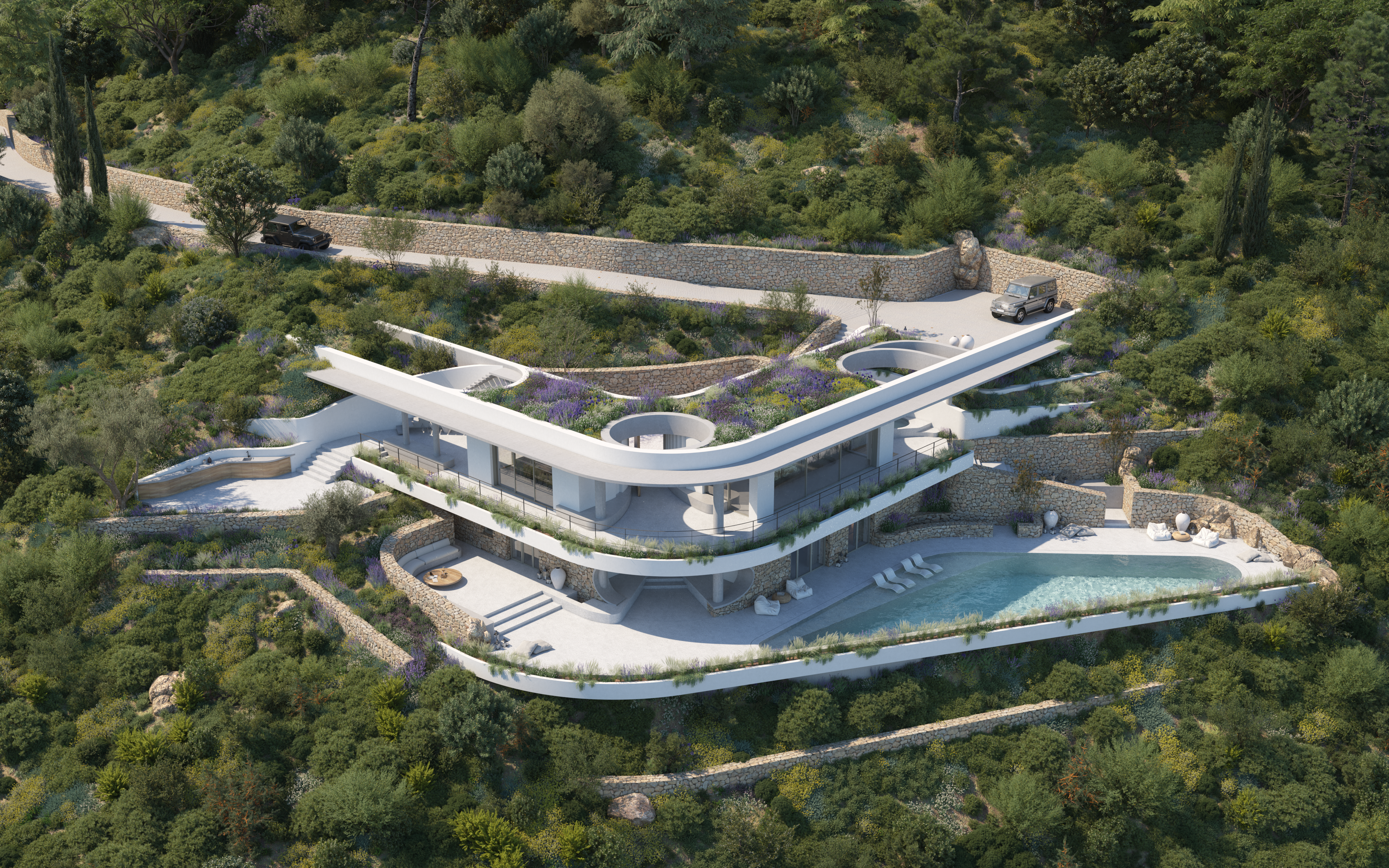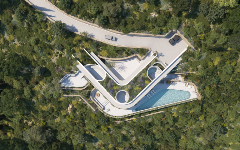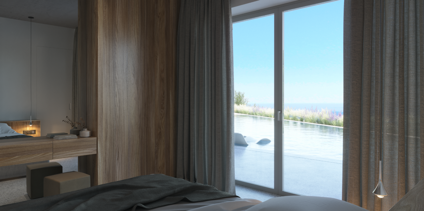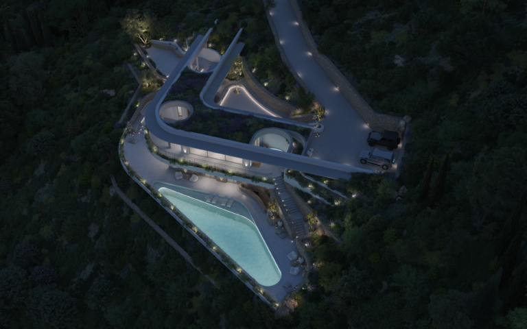 Το κατώτερο επίπεδο είναι αφιερωμένο στην κύρια κρεβατοκάμαρα με ιδιωτικό μπάνιο και σε ένα δωμάτιο ευεξίας, δημιουργώντας έναν ιδιωτικό χώρο αναψυχής και αναζωογόνησης. Η περιμετρική διαμόρφωση της βίλας εξασφαλίζει μέγιστη ιδιωτικότητα. Μια τριγωνική πισίνα υπερχείλισης έχει θέα στο πανοραμικό τοπίο, προσφέροντας την ευκαιρία να απολαύσετε την ομορφιά του περιβάλλοντος.
