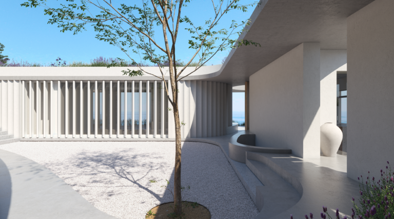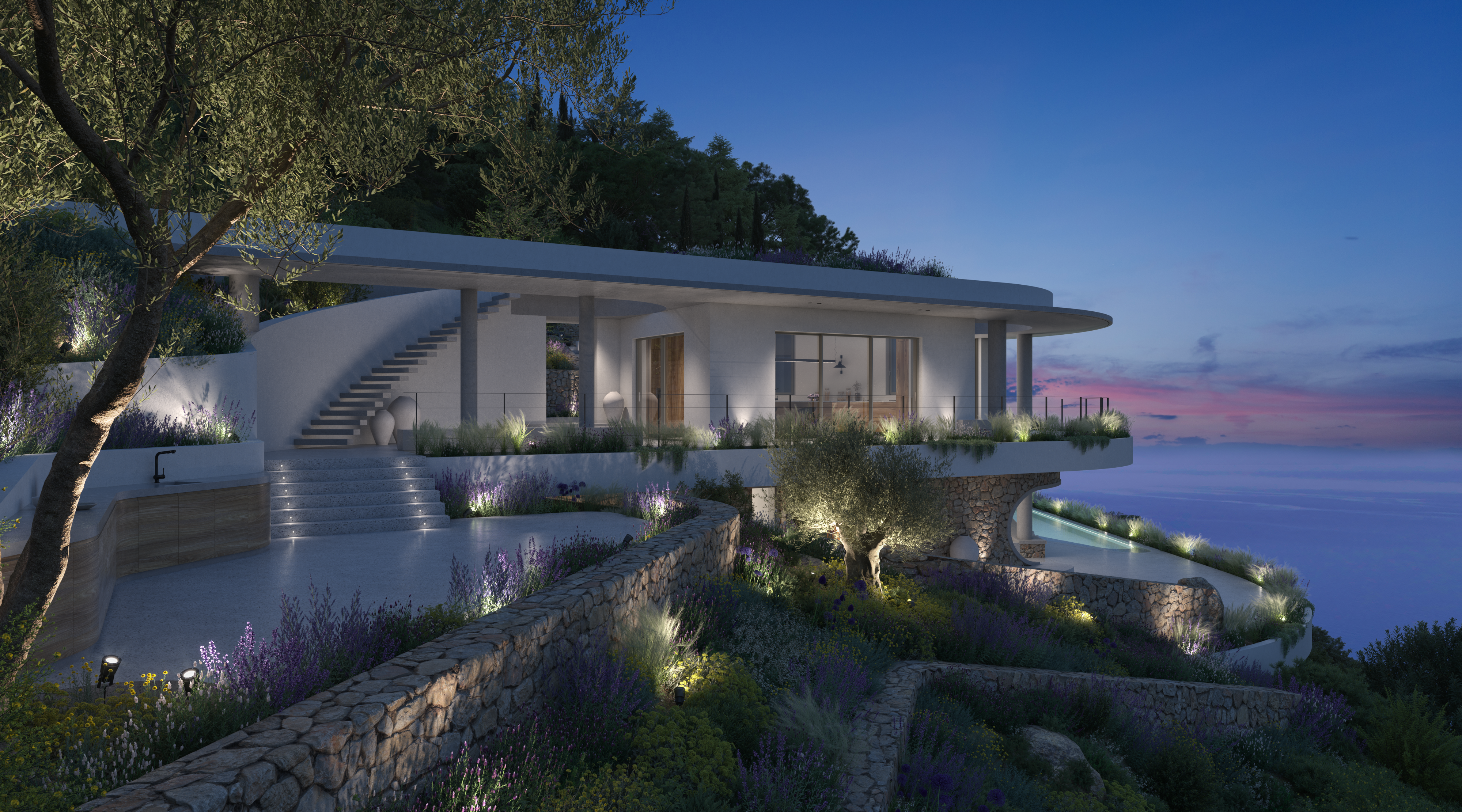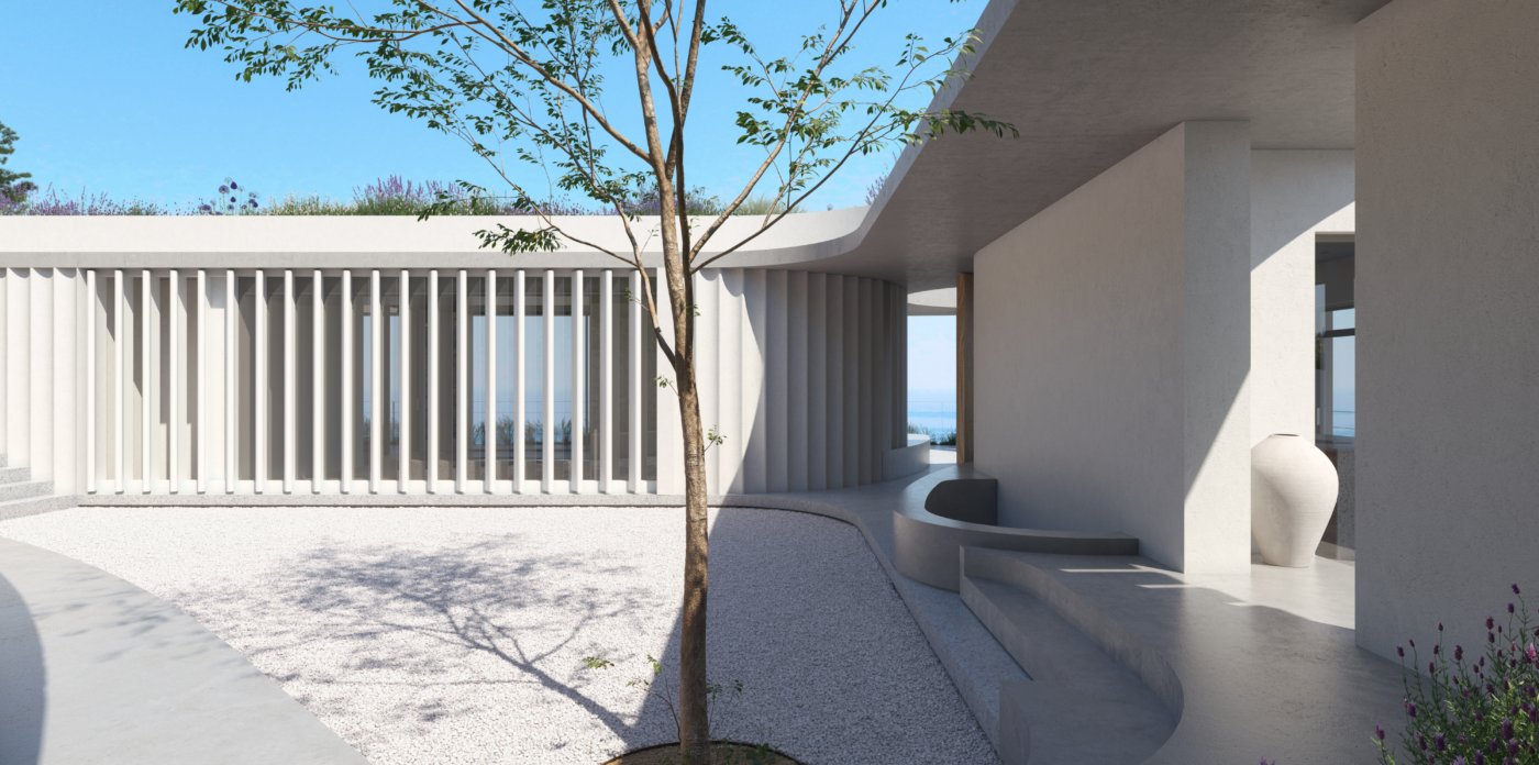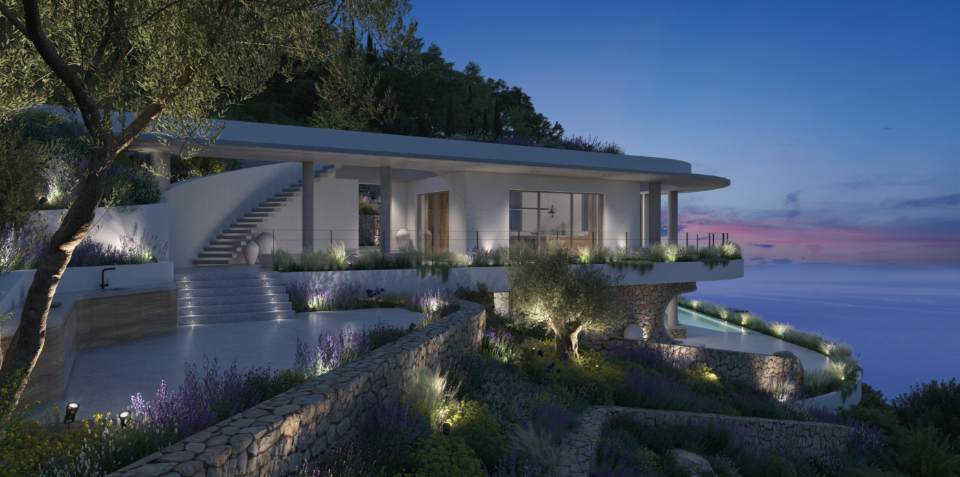 Το κατώτερο επίπεδο είναι αφιερωμένο στην κύρια κρεβατοκάμαρα με ιδιωτικό μπάνιο και σε ένα δωμάτιο ευεξίας, δημιουργώντας έναν ιδιωτικό χώρο αναψυχής και αναζωογόνησης. Η περιμετρική διαμόρφωση της βίλας εξασφαλίζει μέγιστη ιδιωτικότητα. Μια τριγωνική πισίνα υπερχείλισης έχει θέα στο πανοραμικό τοπίο, προσφέροντας την ευκαιρία να απολαύσετε την ομορφιά του περιβάλλοντος.