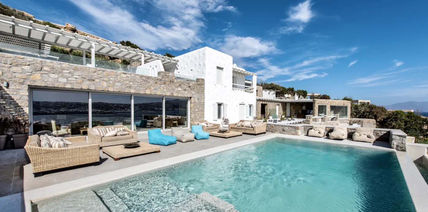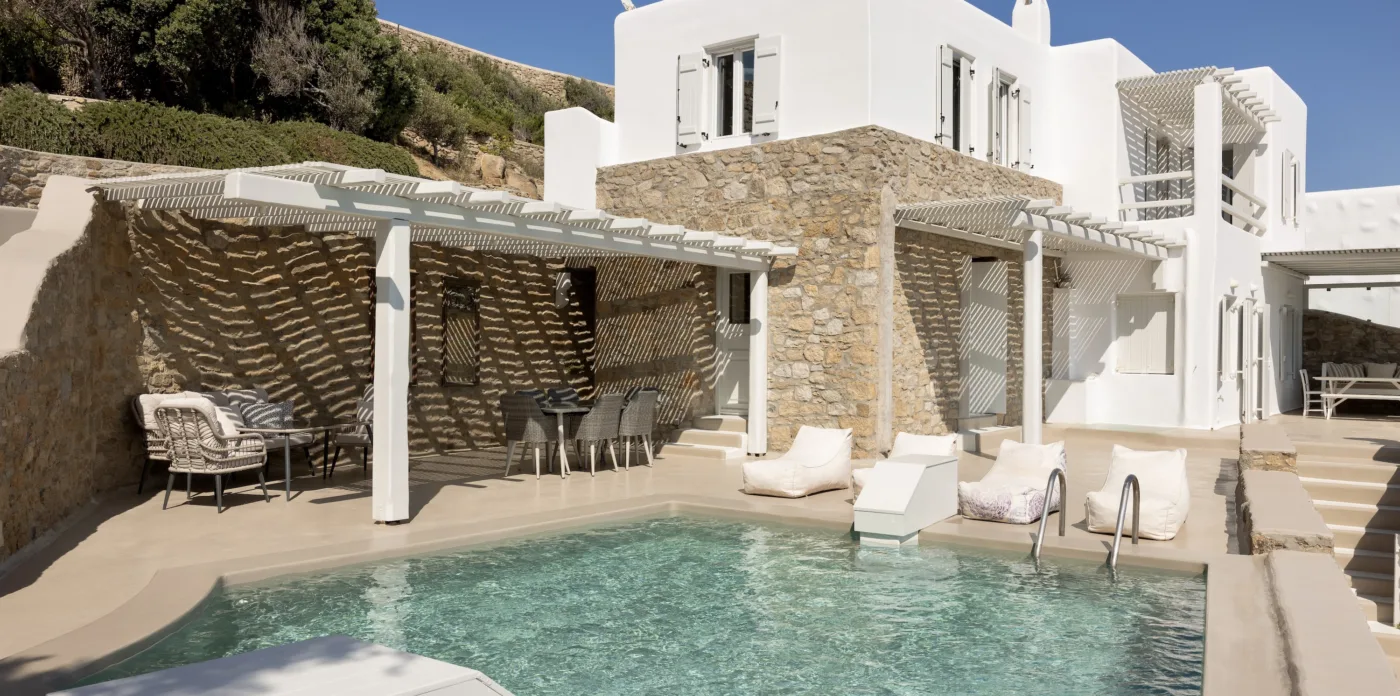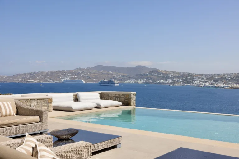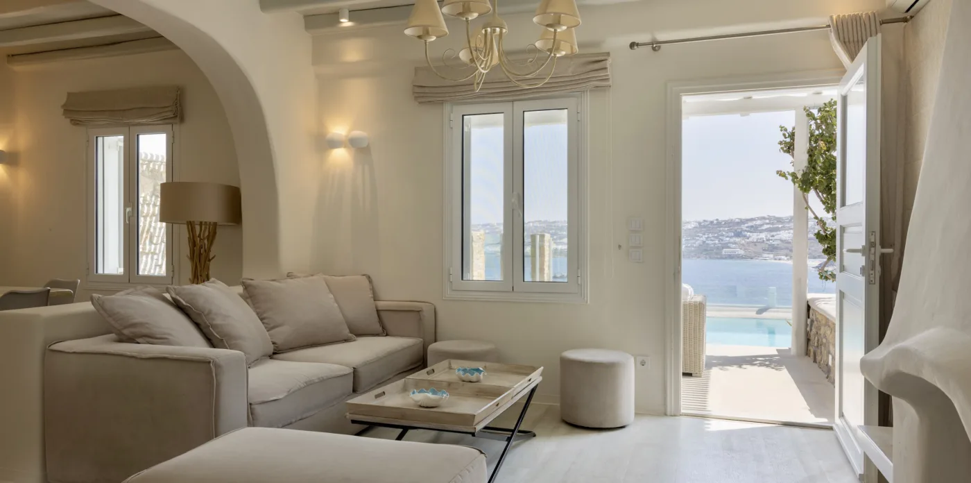 Η γοητευτική γοητεία της θάλασσας συγκλίνει με την αισθητική αυτών των μυκονιάτικων κατοικιών, που βρίσκονται μέσα σε έναν αιγαιοπελαγίτικο παράδεισο. Η έπαυλη Astra συλλαμβάνει την ουσία της μεσογειακής ζωής, με τον κομψό σχεδιασμό, την πανοραμική θέα στη θάλασσα και το άψογο συνδυασμό εσωτερικών και εξωτερικών χώρων.