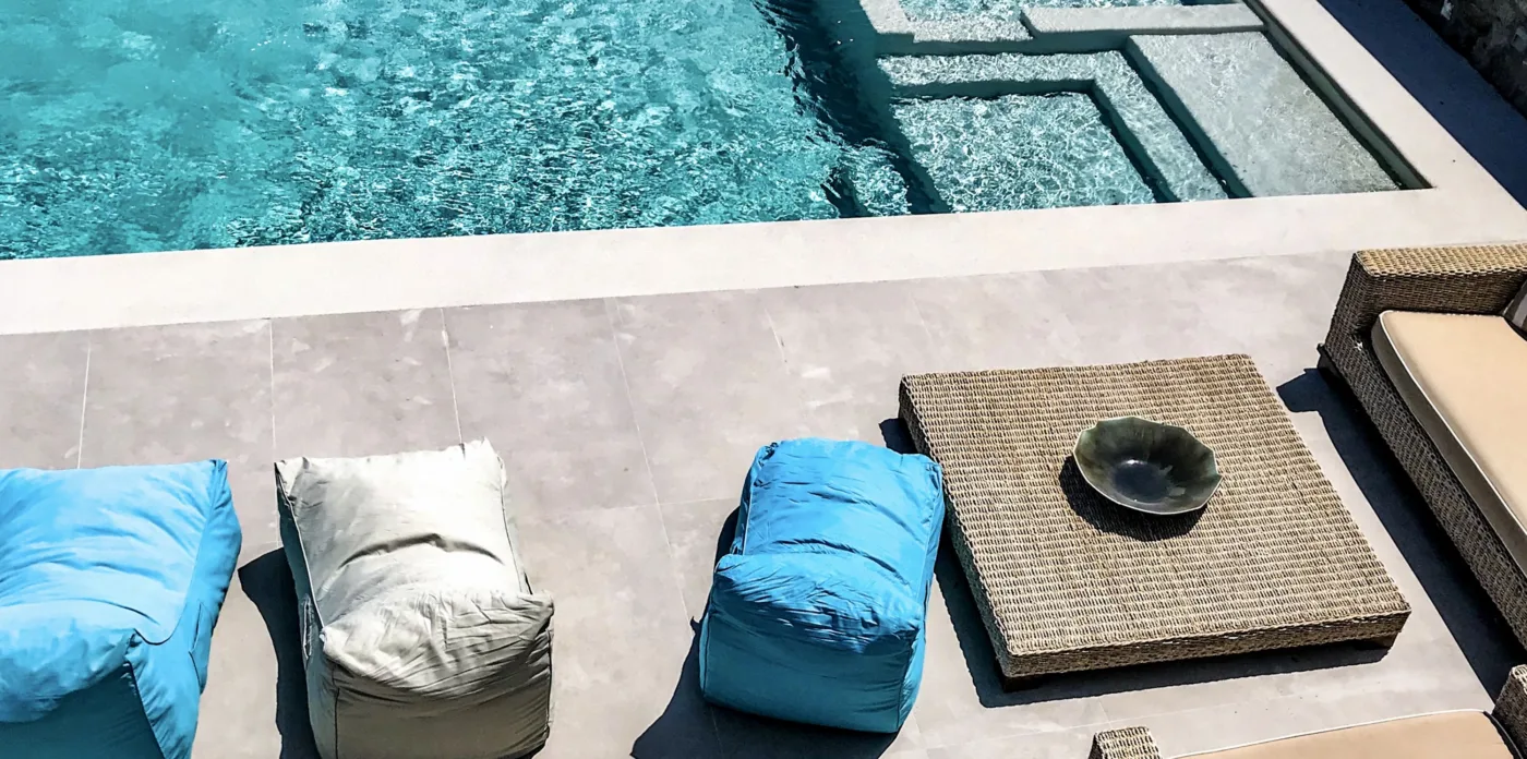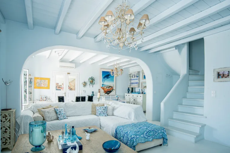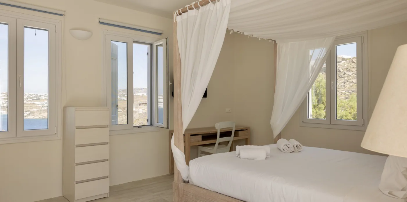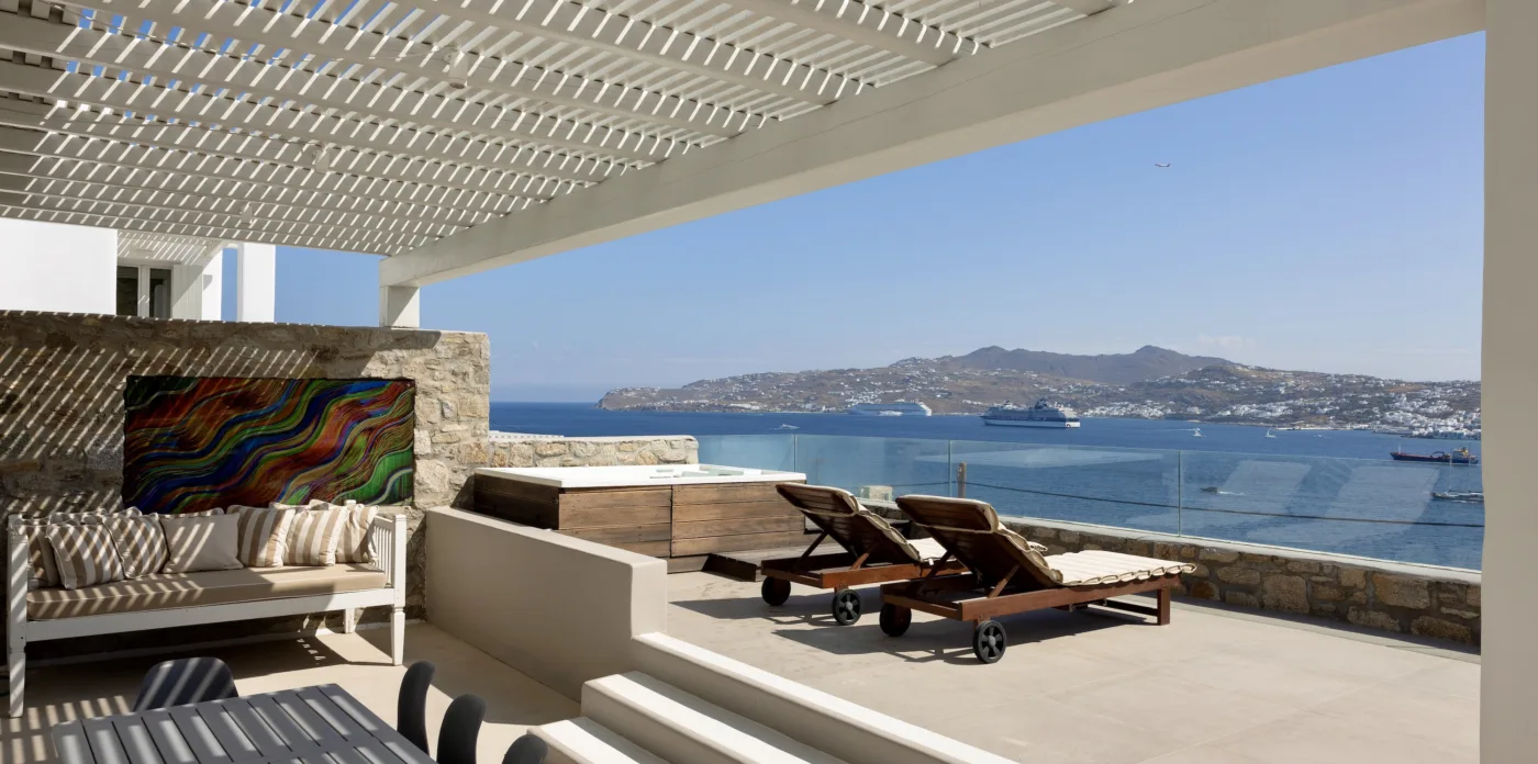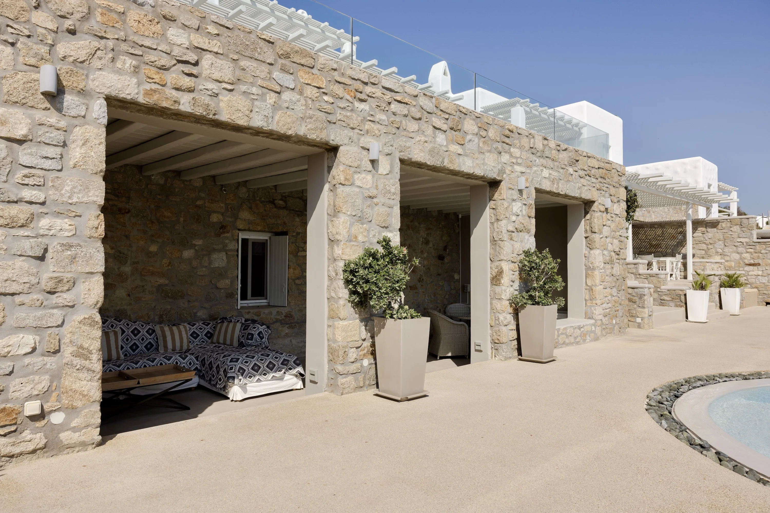Κάθε λεπτομέρεια έχει μελετηθεί προσεκτικά για να δημιουργηθεί ένας αρμονικός χώρος που ενσαρκώνει το πνεύμα της Μυκόνου, που βρίσκεται ανάμεσα στον Ορνό και τα Κανάλια, μόλις 4 χιλιόμετρα από την καρδιά της πόλης της Μυκόνου.