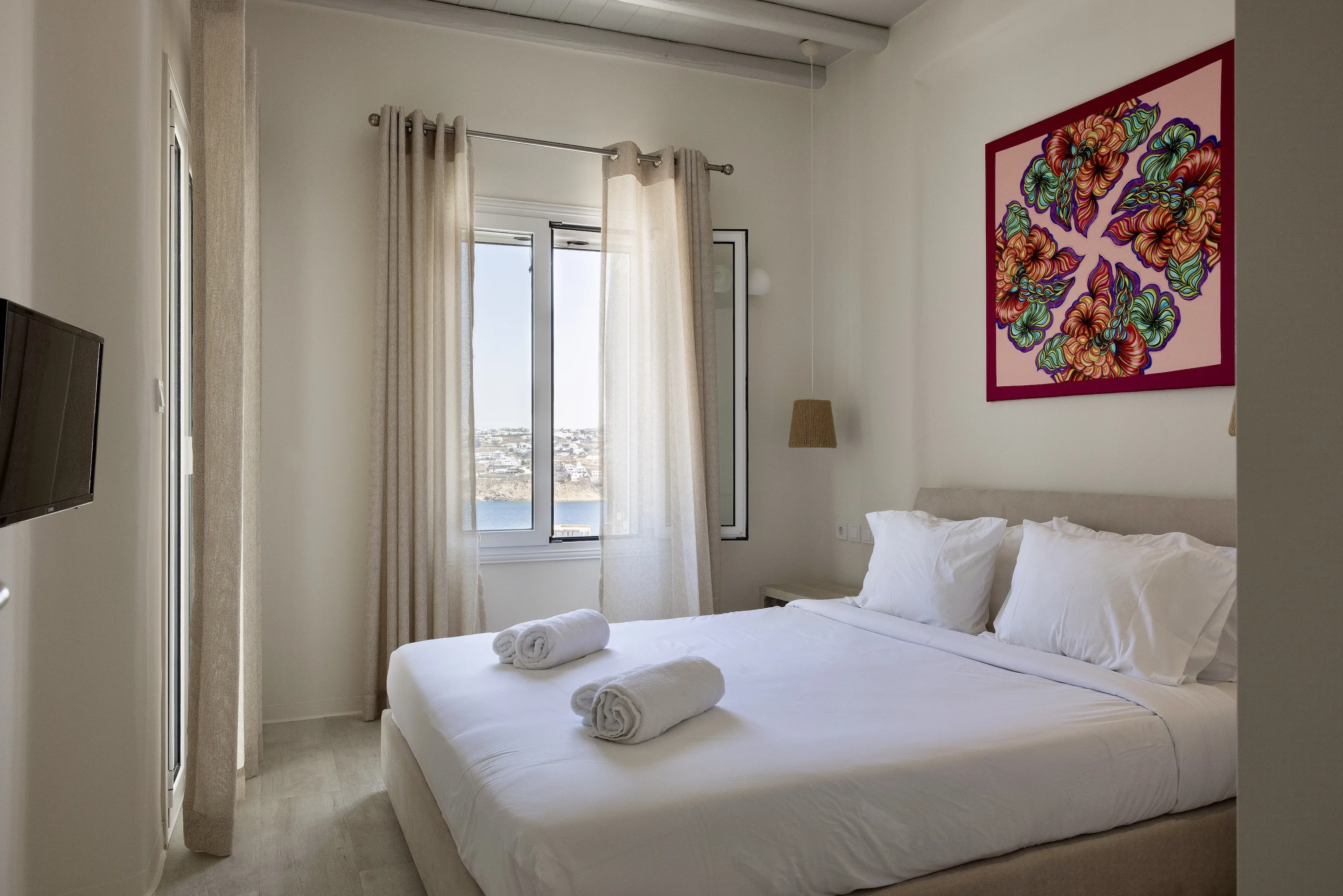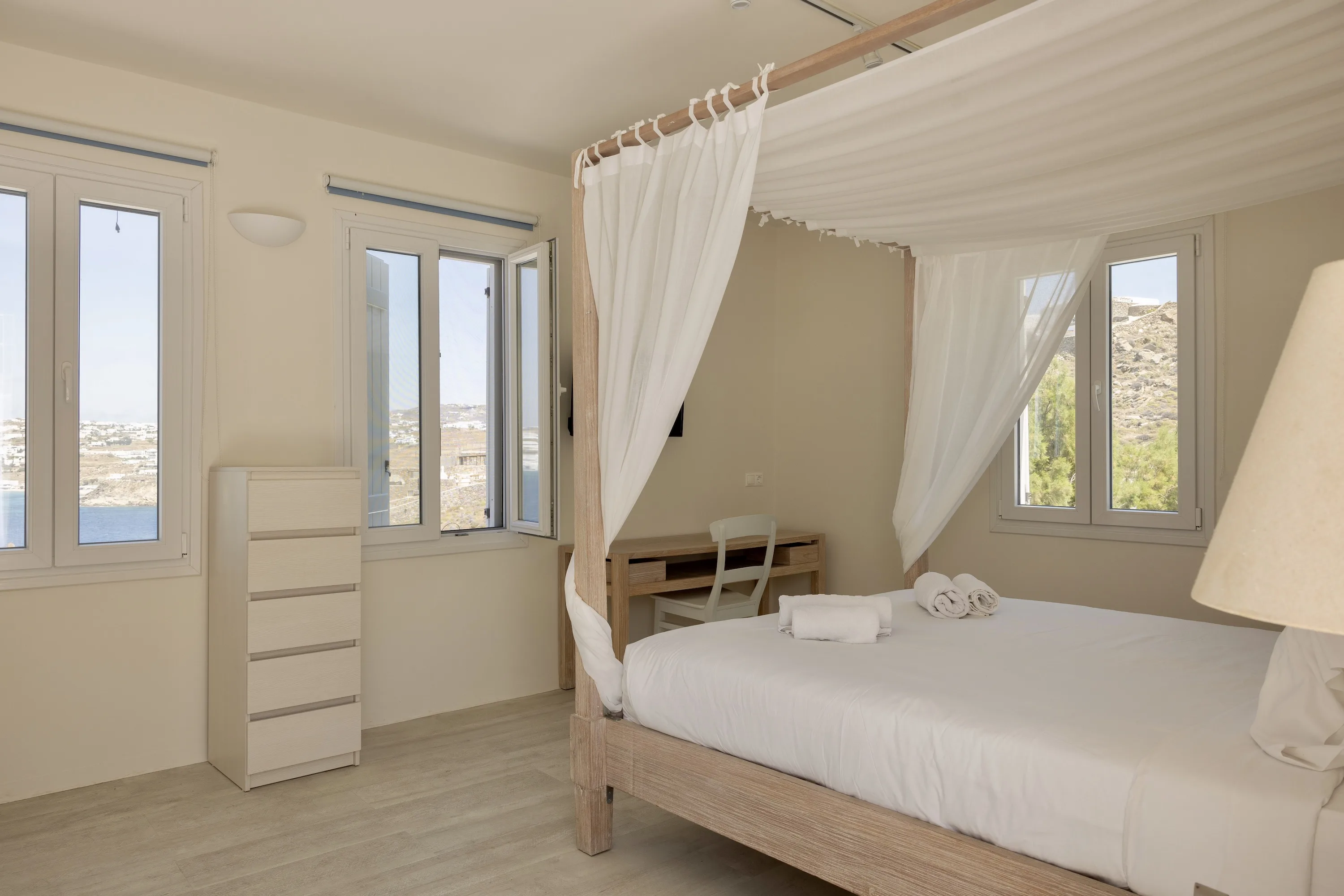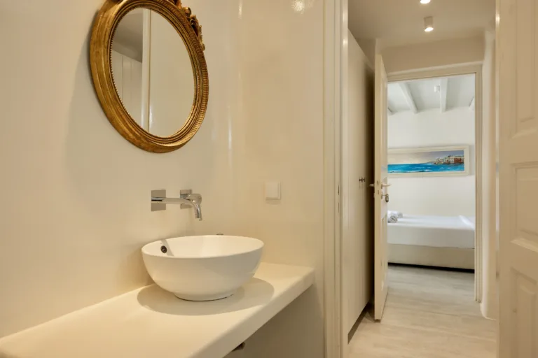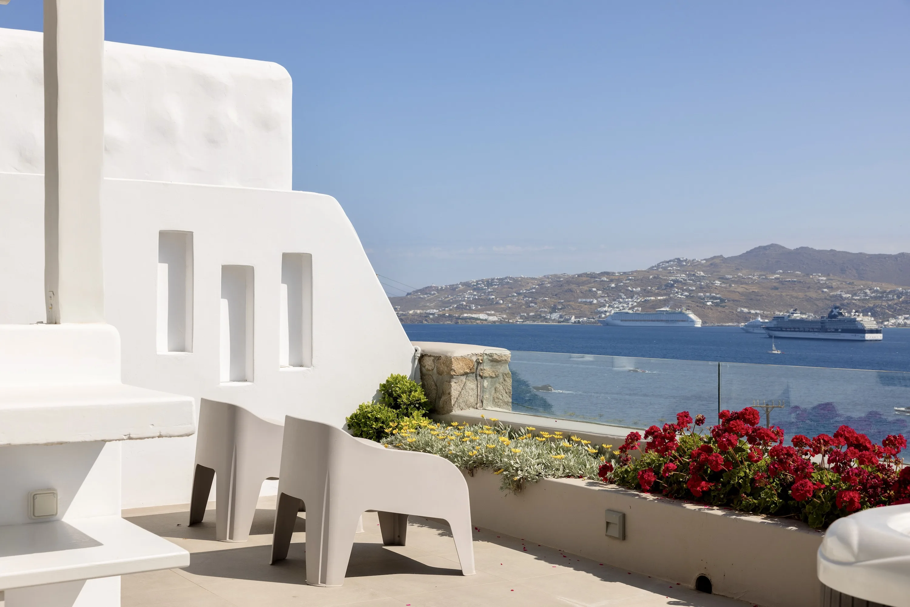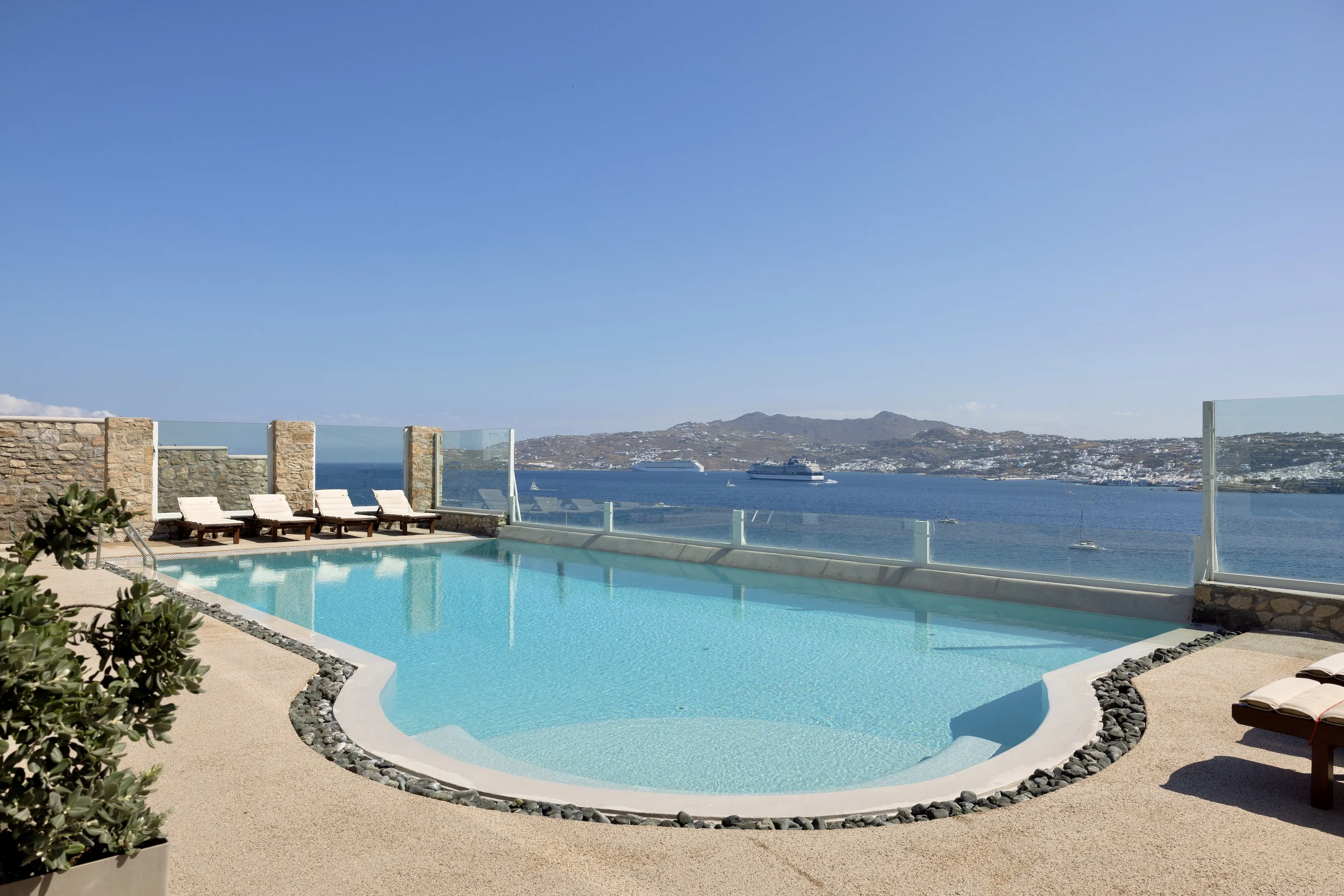 Κάθε λεπτομέρεια έχει μελετηθεί προσεκτικά για να δημιουργηθεί ένας αρμονικός χώρος που ενσαρκώνει το πνεύμα της Μυκόνου, που βρίσκεται ανάμεσα στον Ορνό και τα Κανάλια, μόλις 4 χιλιόμετρα από την καρδιά της πόλης της Μυκόνου.
