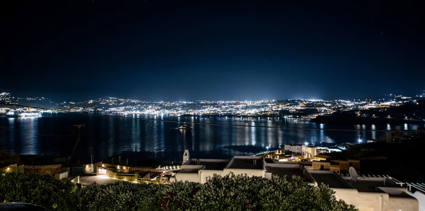 Έξι μεμονωμένες κατοικίες προσφέρουν θέα στην ακτή που περιλαμβάνει το υπέροχο πανόραμα τόσο του παλιού όσο και του νέου λιμανιού της πόλης της Μυκόνου.