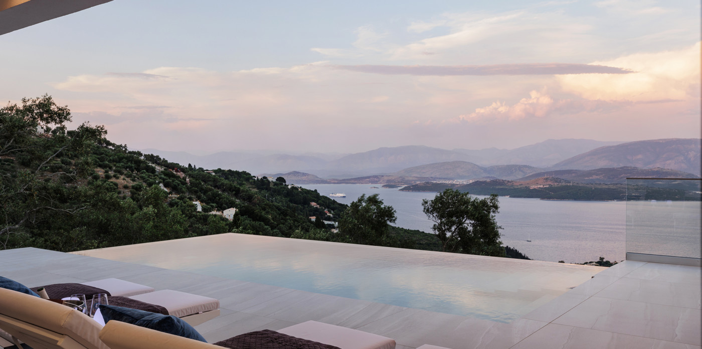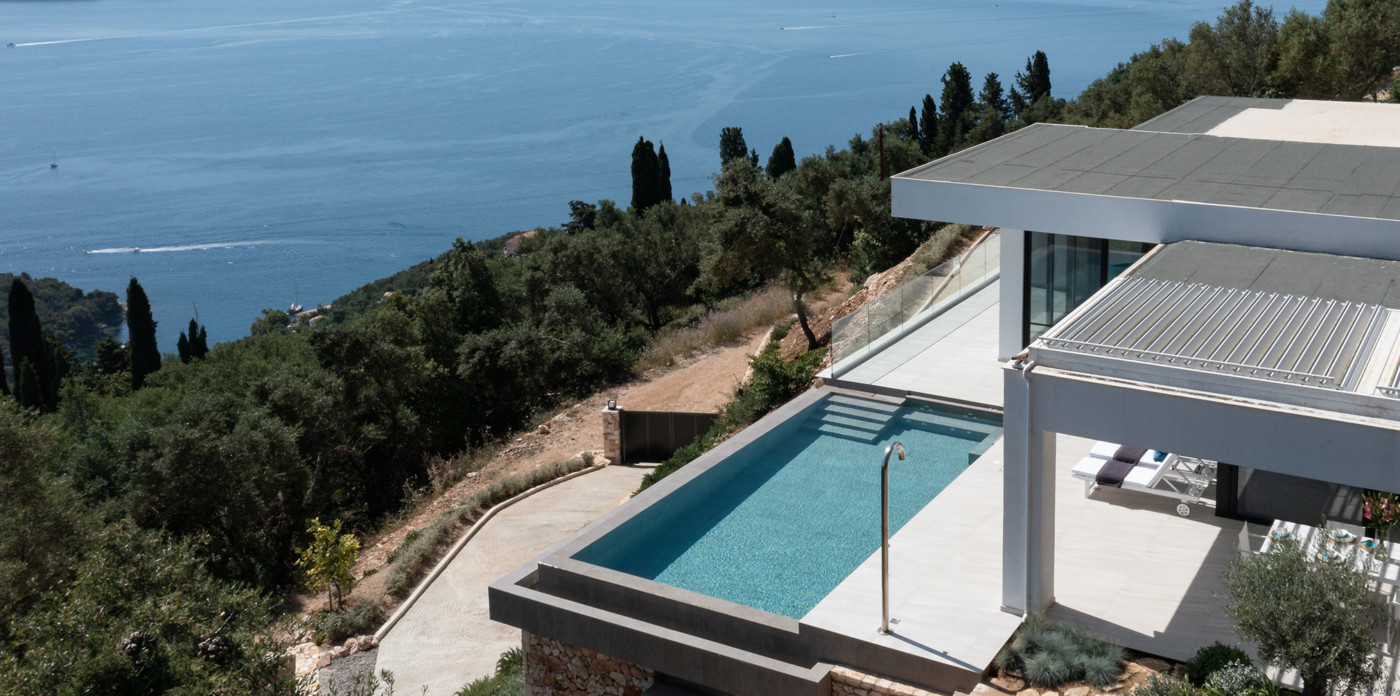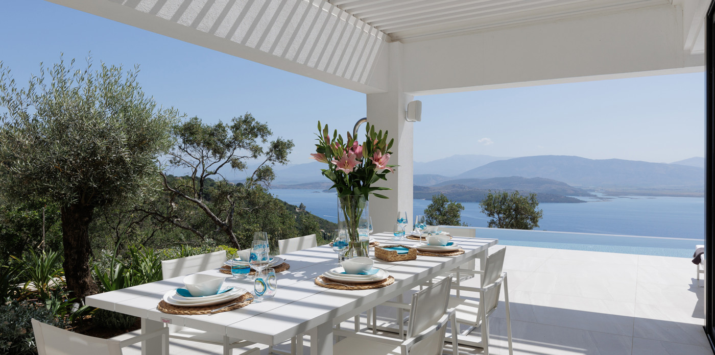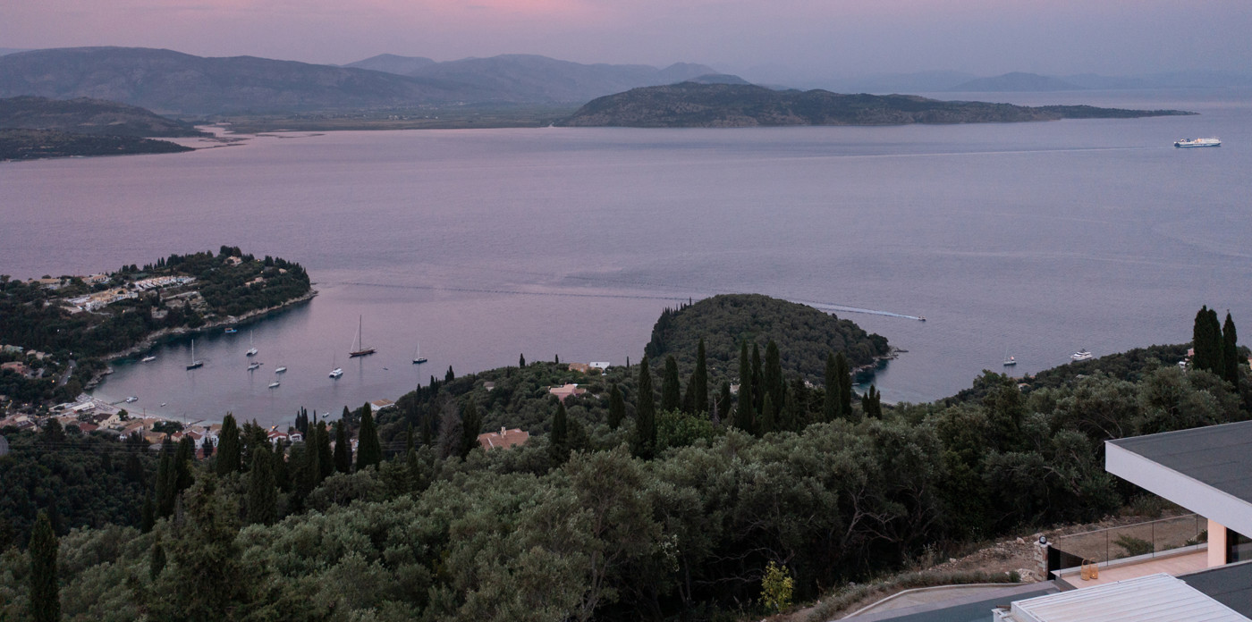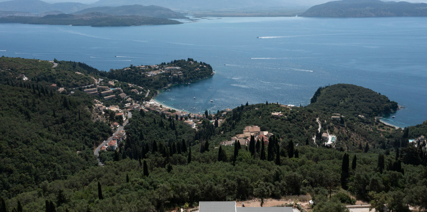 Η πανοραμική θέα του ακινήτου είναι απλά εντυπωσιακή, ενσωματώνοντας τα διάσημα σμαραγδένια νερά του Ιονίου με τα καταπράσινα τοπία της βορειοανατολικής ακτής.