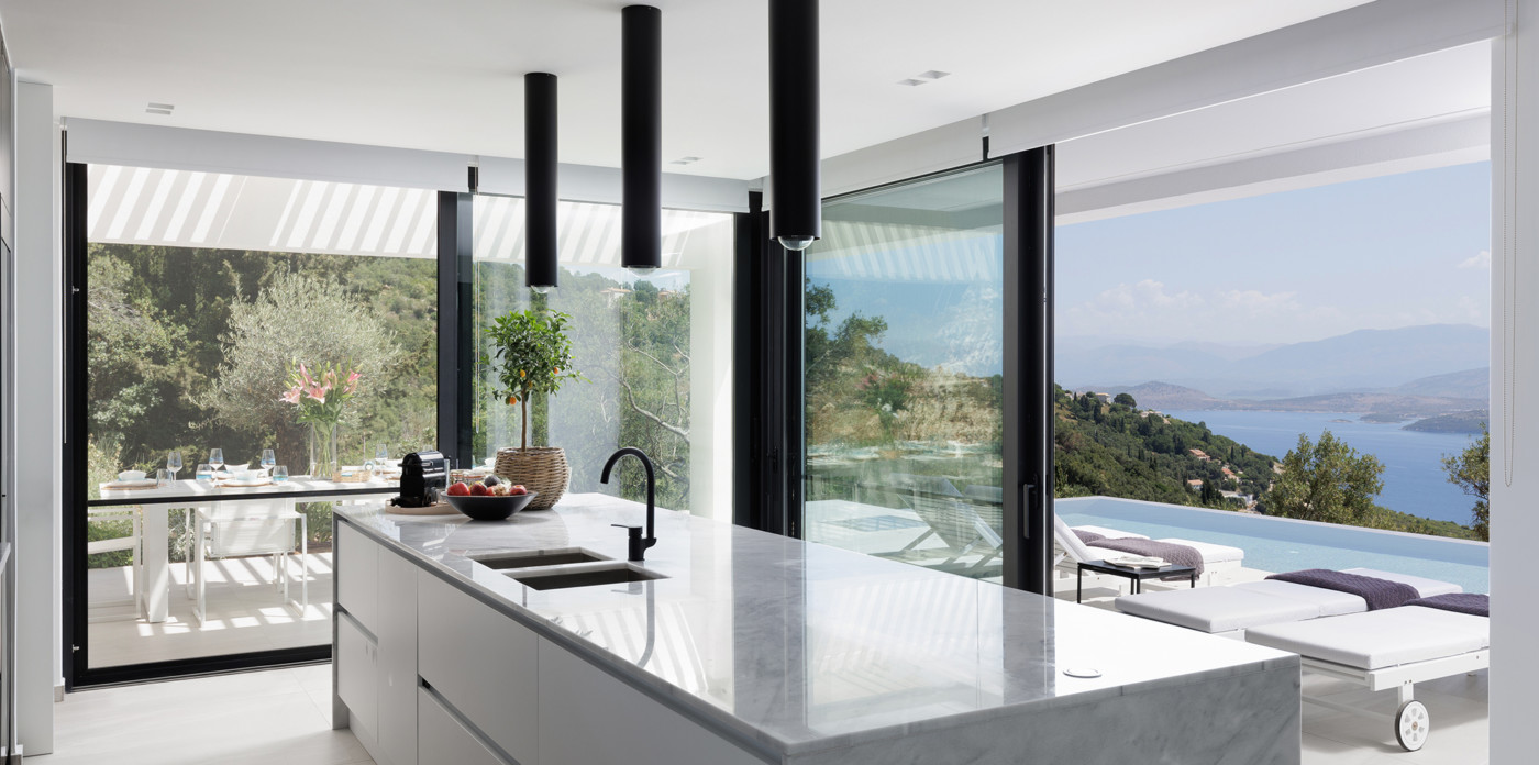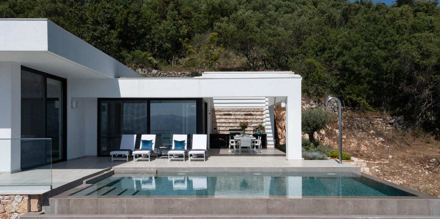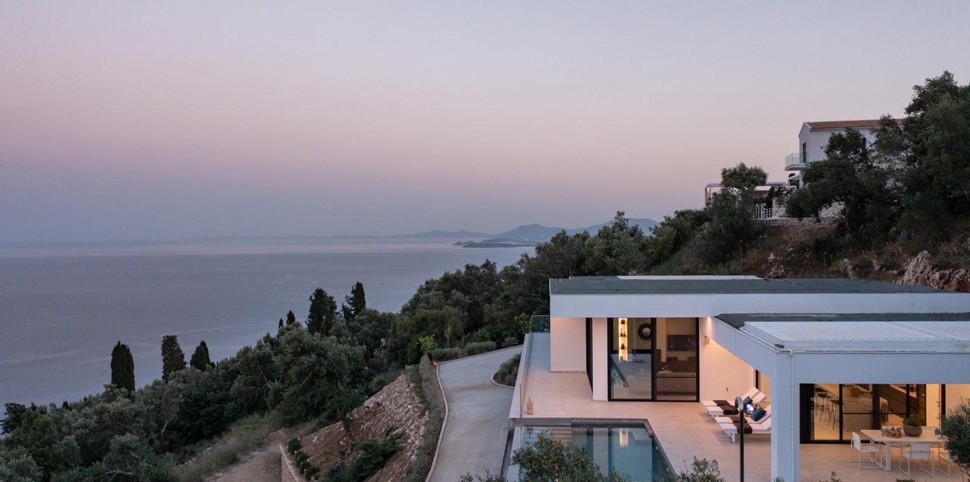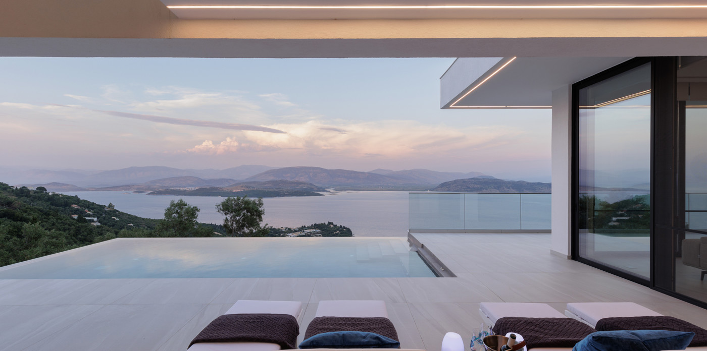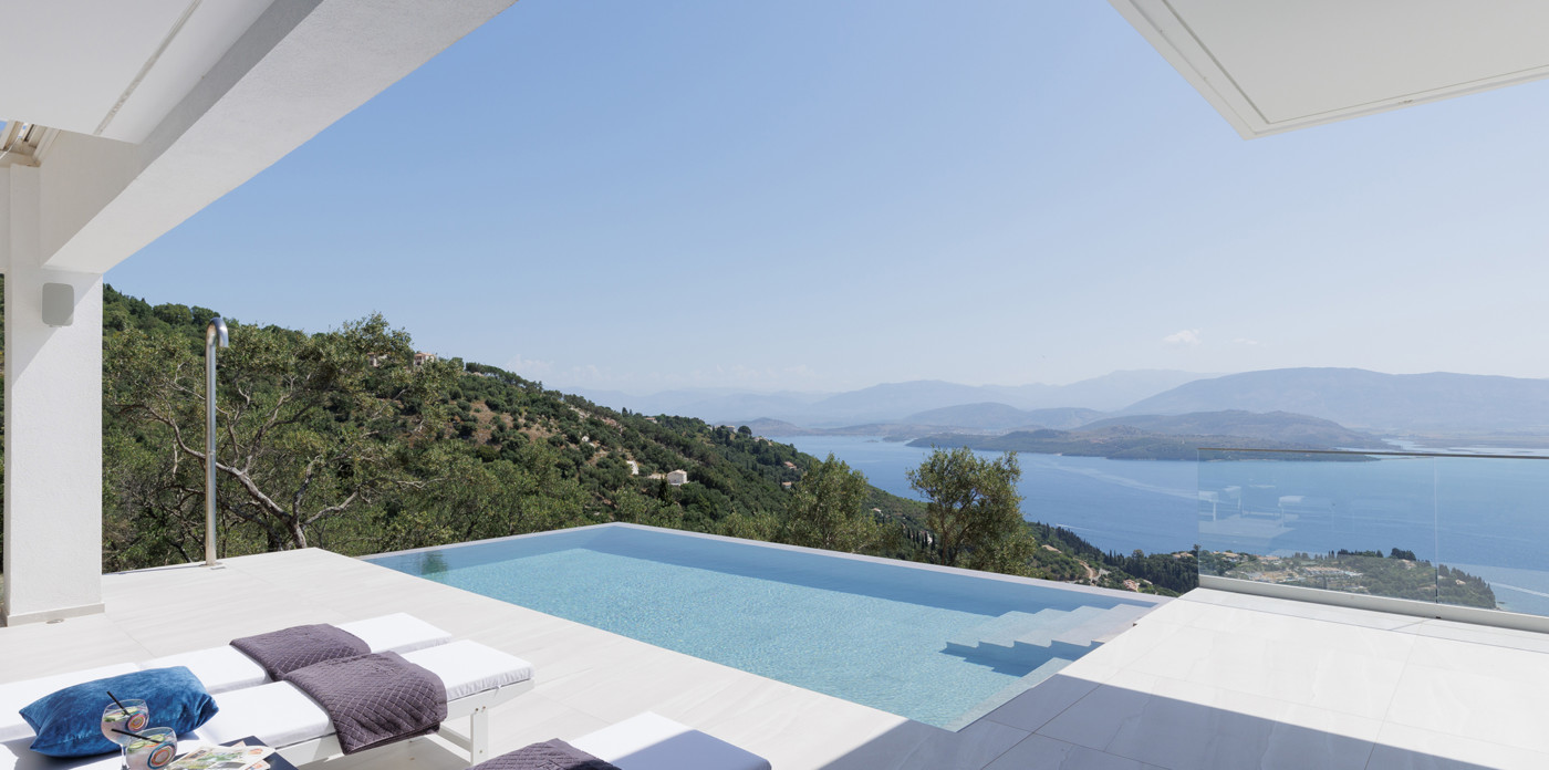 Η πανοραμική θέα του ακινήτου είναι απλά εντυπωσιακή, ενσωματώνοντας τα διάσημα σμαραγδένια νερά του Ιονίου με τα καταπράσινα τοπία της βορειοανατολικής ακτής.