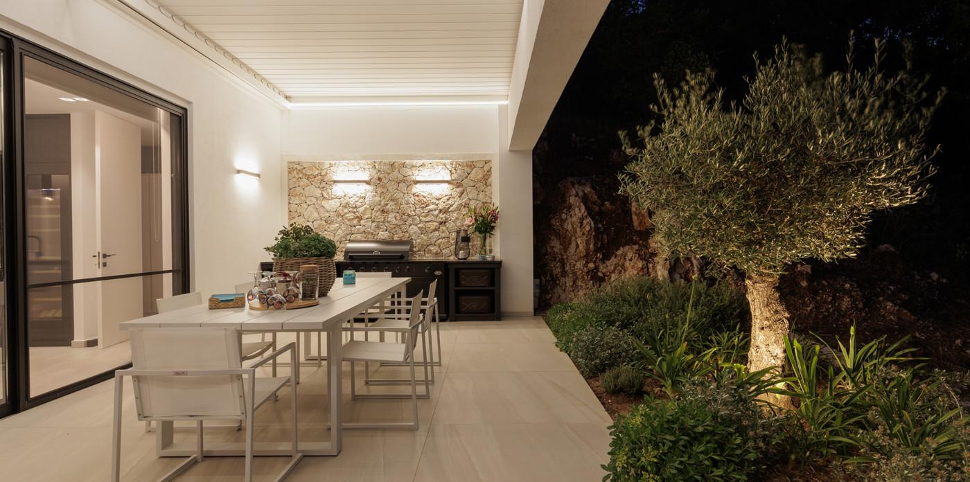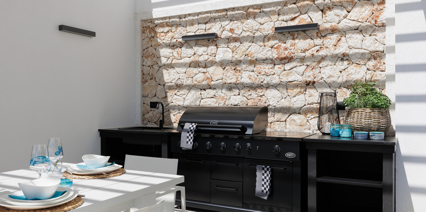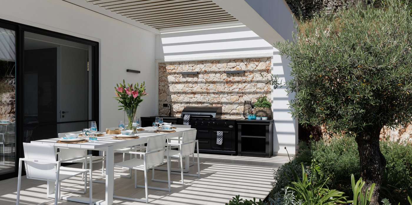 Το μπάρμπεκιου με ενσωματωμένο ψυγείο σας προσκαλεί να απολαύσετε τη θέα με ένα ξεχωριστό γεύμα στην υπαίθρια τραπεζαρία.