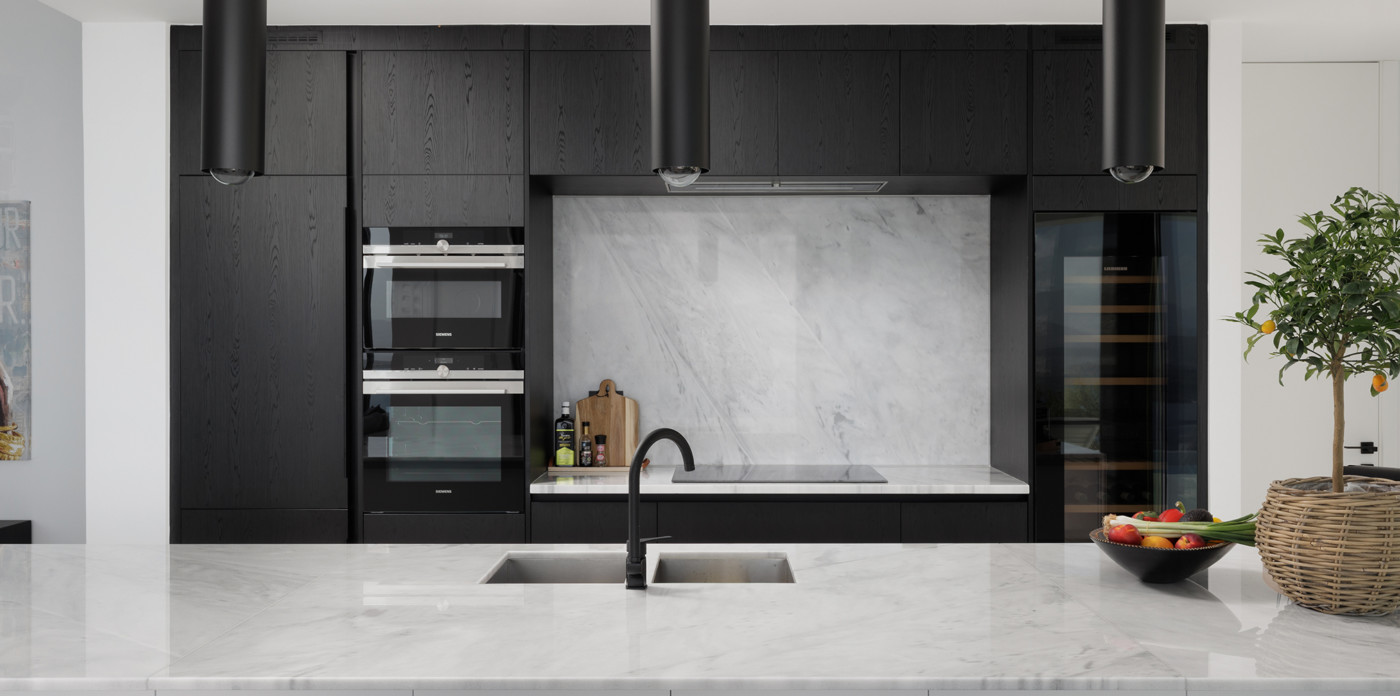 Επιπλωμένη με γνώμονα την κομψότητα και τη λειτουργικότητα, μια εκλεπτυσμένη κουζίνα με μαρμάρινους πάγκους και backsplash βρίσκεται σε ιδανική τοποθεσία για να εξυπηρετεί τόσο εξωτερικούς όσο και εσωτερικούς χώρους τραπεζαρίας.