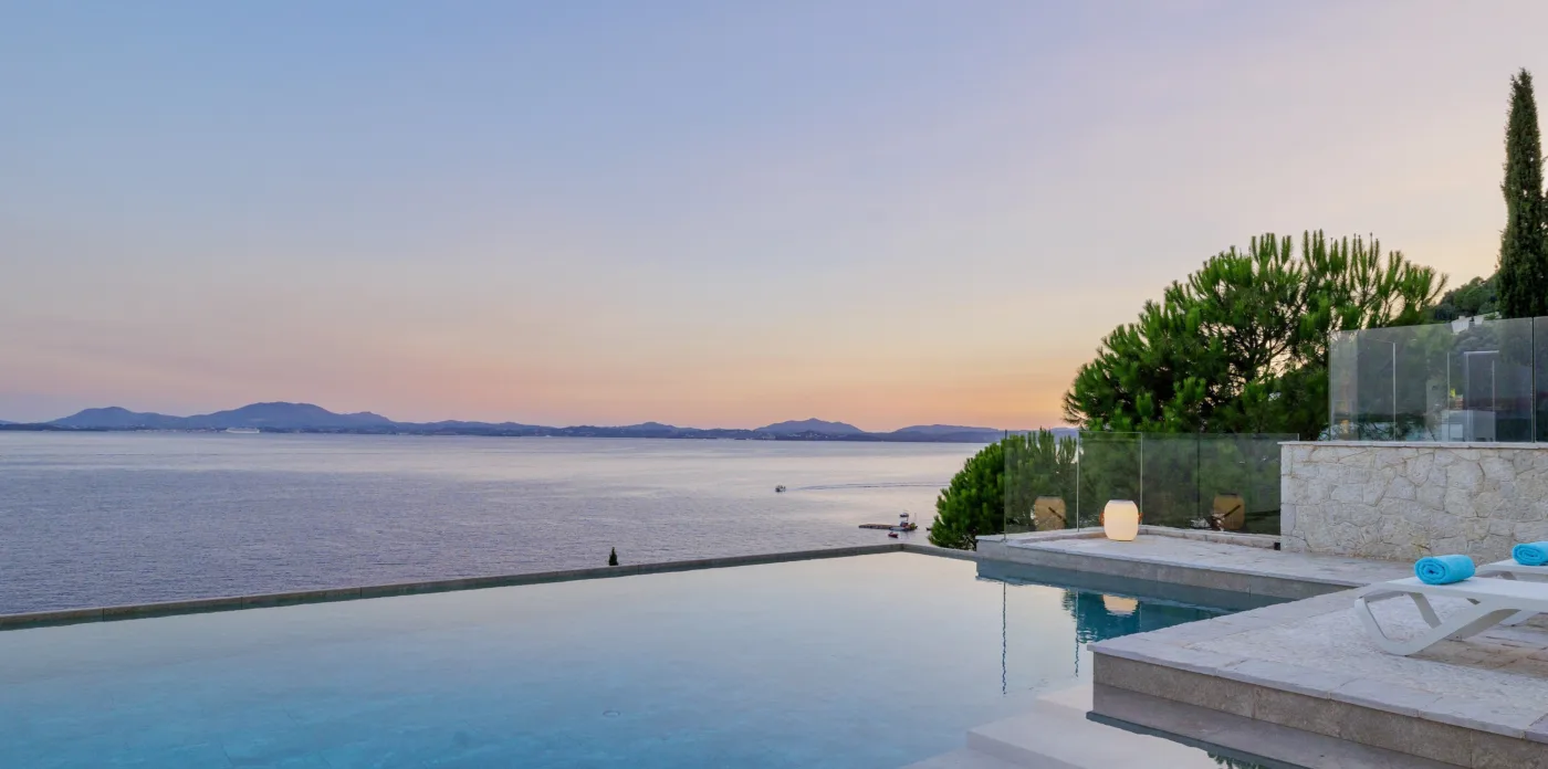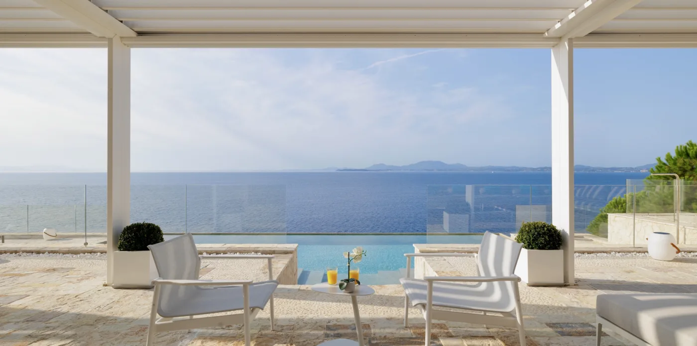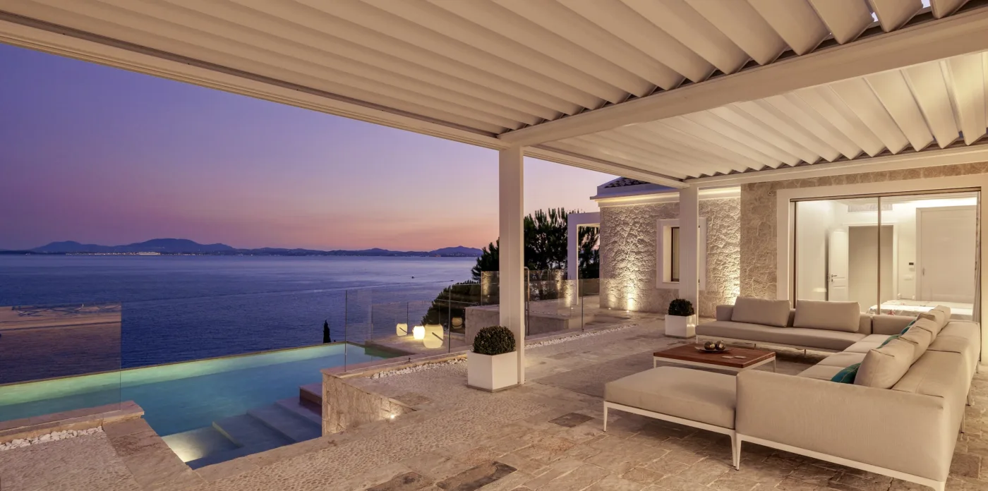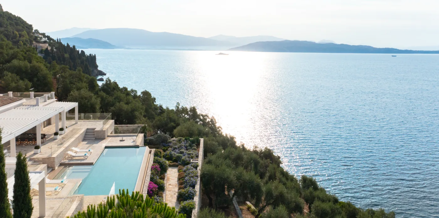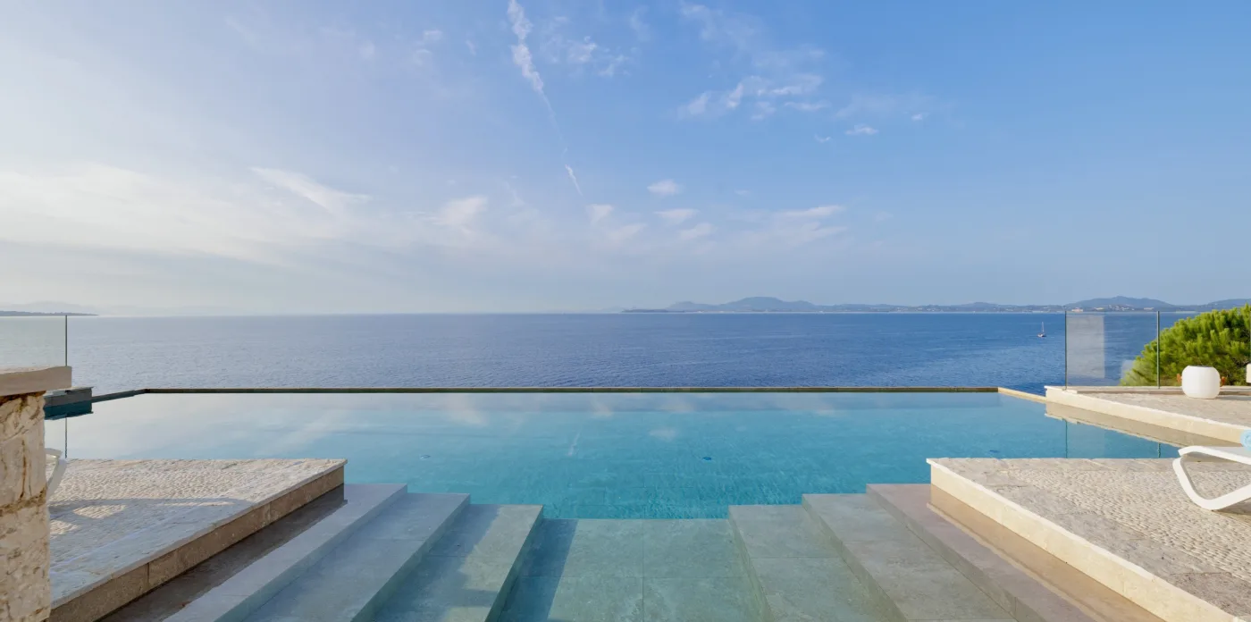 Η πισίνα υπερχείλισης, στρατηγικά τοποθετημένη, δίνει την ψευδαίσθηση ότι συγχωνεύεται με τη θάλασσα, προσφέροντας την αίσθηση του άπειρου χώρου. Τα σκαλοπάτια από τον χώρο της πισίνας οδηγούν πρώτα σε ένα σημείο γιόγκα και διαλογισμού με πανοραμική θέα στη θάλασσα, και στη συνέχεια σε ένα παραθαλάσσιο κατάστρωμα σχεδιασμένο για ξαπλώστρες και πρόσβαση στην προβλήτα σκαφών.