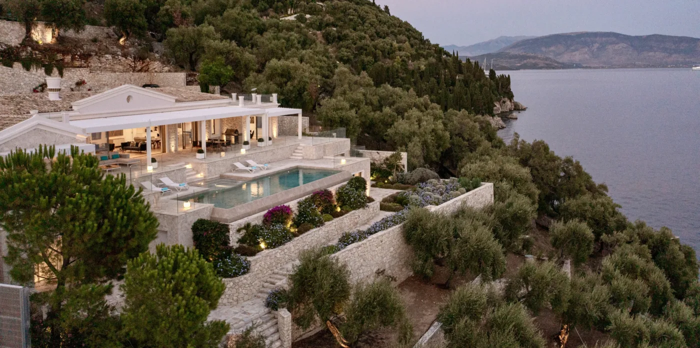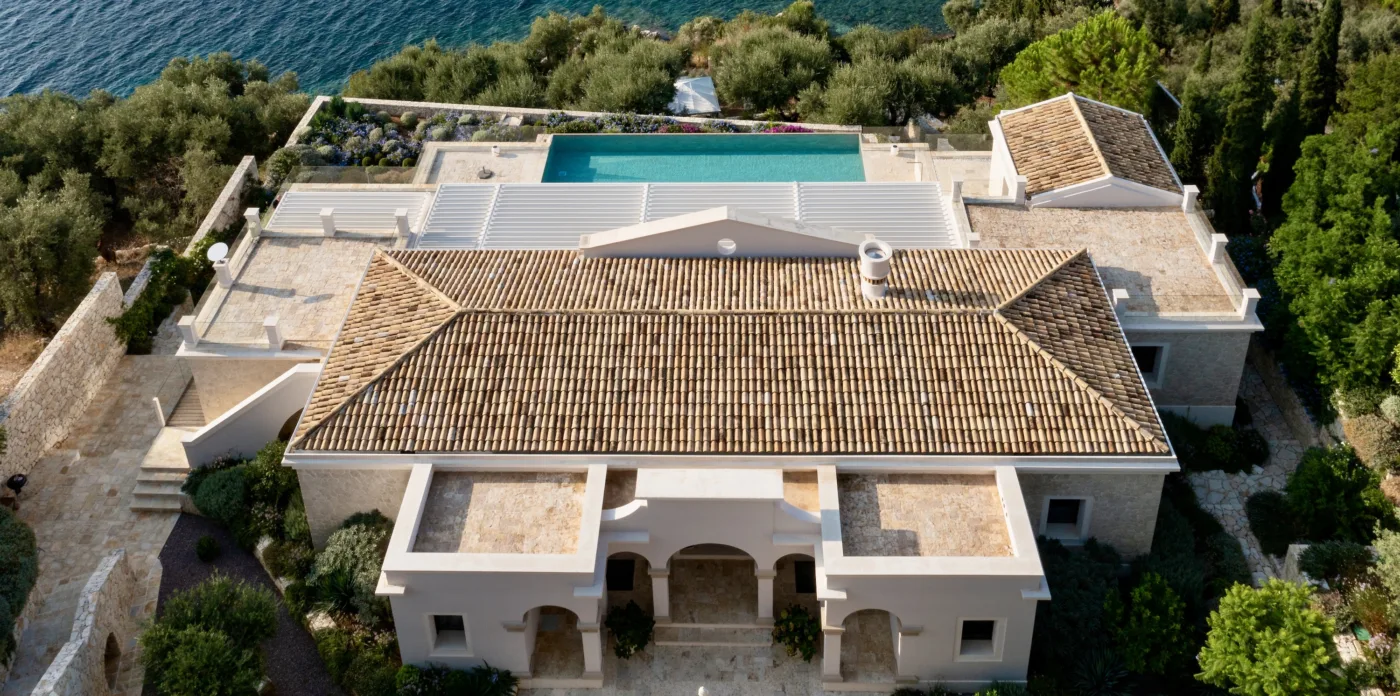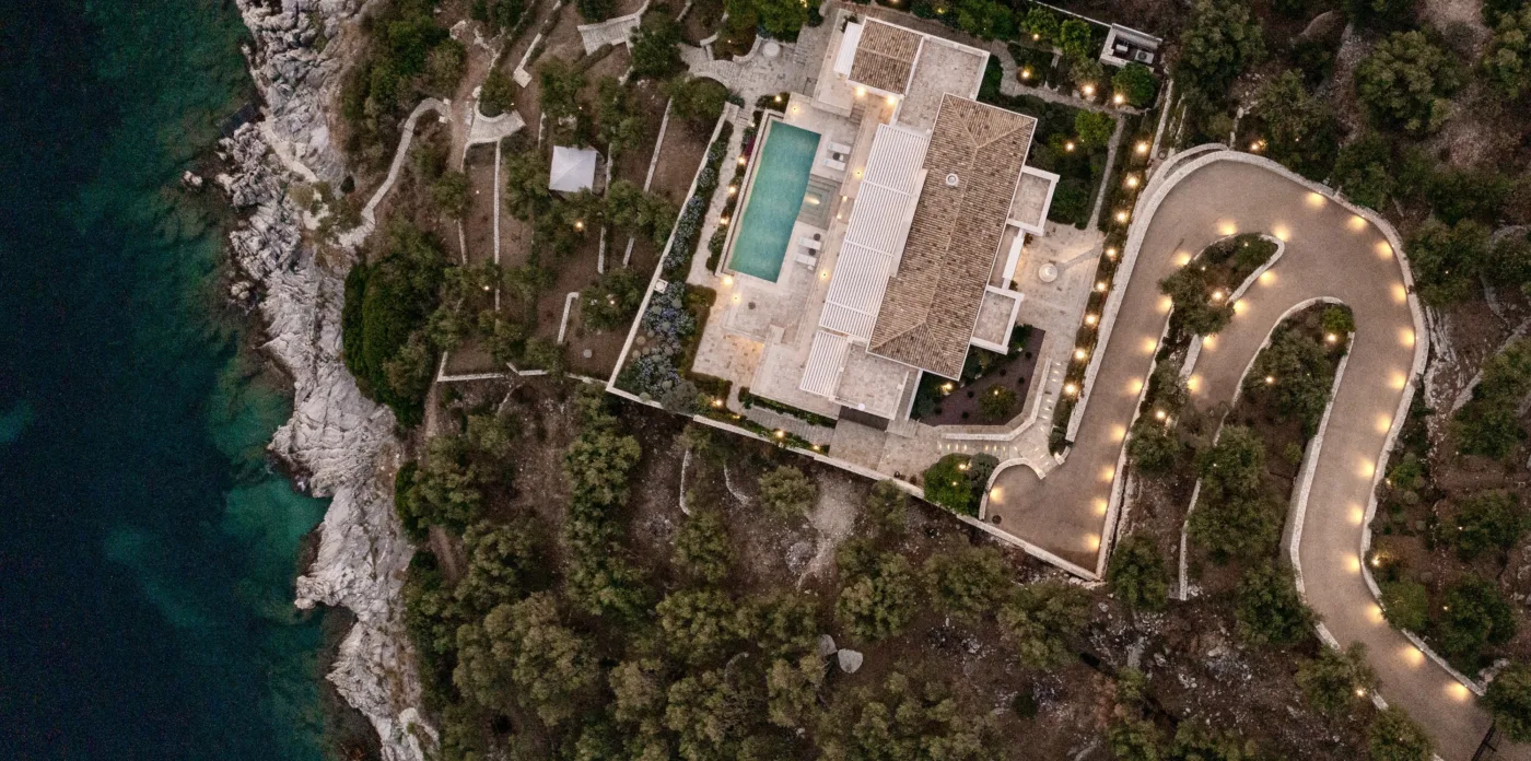 Το Ayline βρίσκεται στην Αγνή, σε μικρή απόσταση με τα πόδια από τον γραφικό κόλπο και τα διάσημα παραθαλάσσια εστιατόρια. Η βίλα παρουσιάζει ένα μοναδικό μείγμα κερκυραϊκών και βενετσιάνικων αρχιτεκτονικών επιρροών που συνδυάζονται με μοντέρνα αισθητική. Δύο ξεχωριστά χαρακτηριστικά είναι τα παράθυρα που ενισχύουν την πανοραμική θέα και η πέτρα που χρησιμοποιήθηκε στην πρόσοψη και τους εξωτερικούς τοίχους, η οποία προήλθε απευθείας από τους χώρους του ακινήτου. Κάθε πέτρα διαμορφώθηκε σχολαστικά στο χέρι από έναν εξειδικευμένο τεχνίτη και συναρμολογήθηκε μεταξύ τους σαν κομμάτια ενός περίπλοκου παζλ.