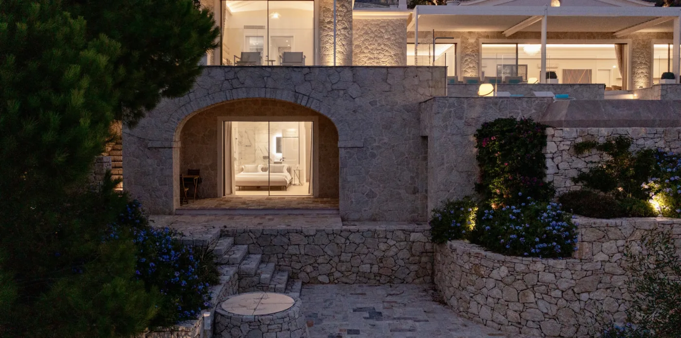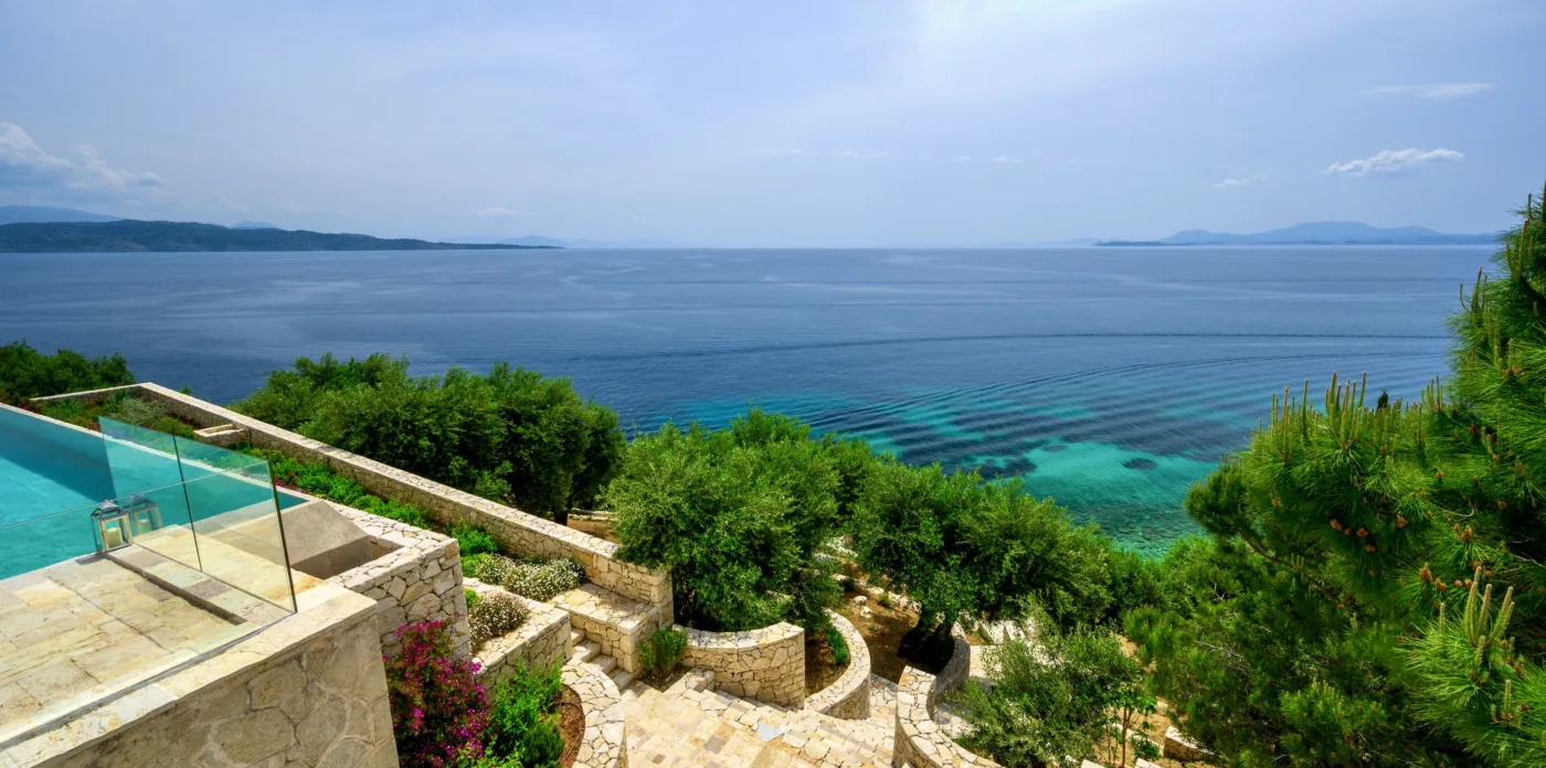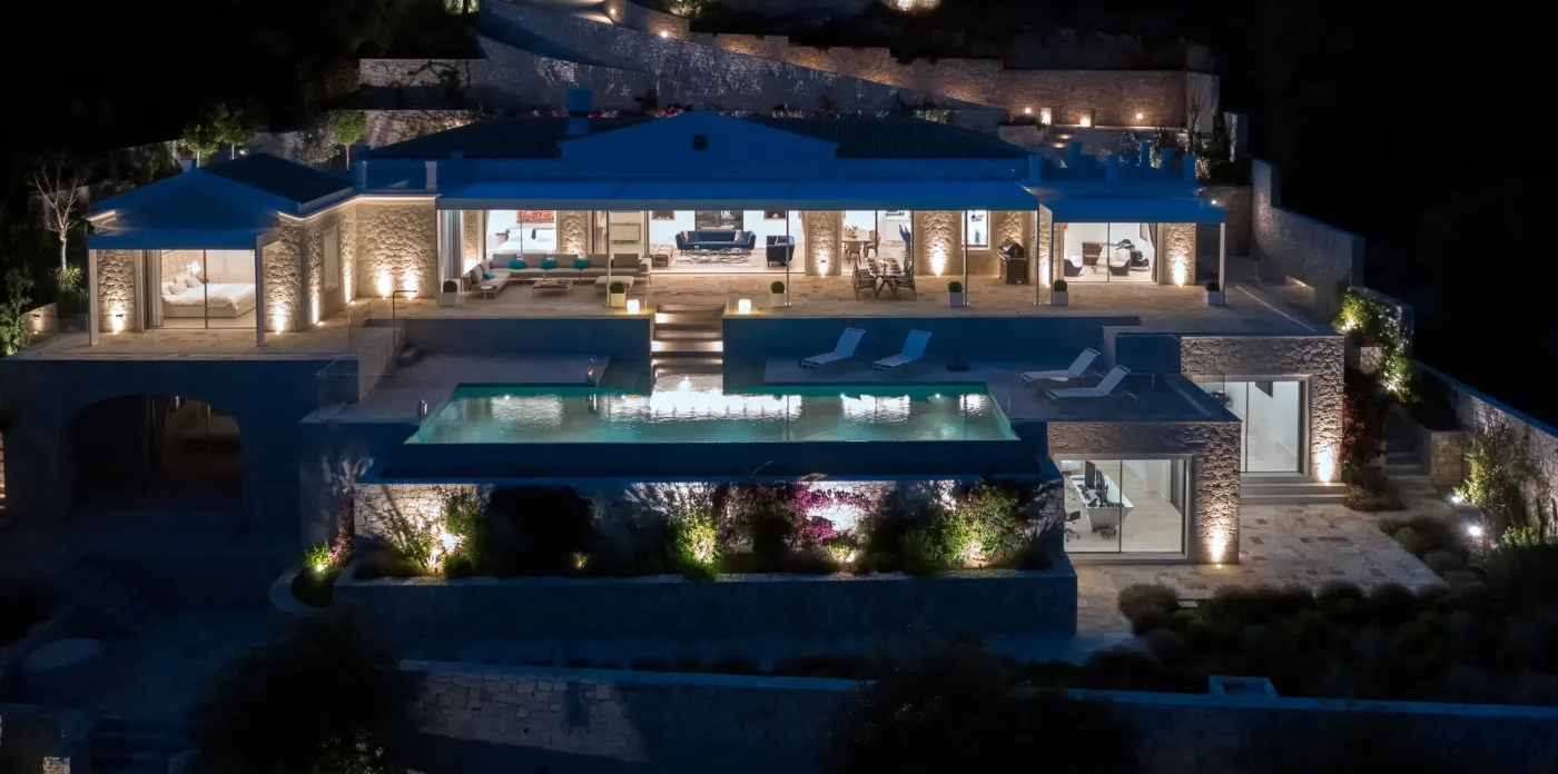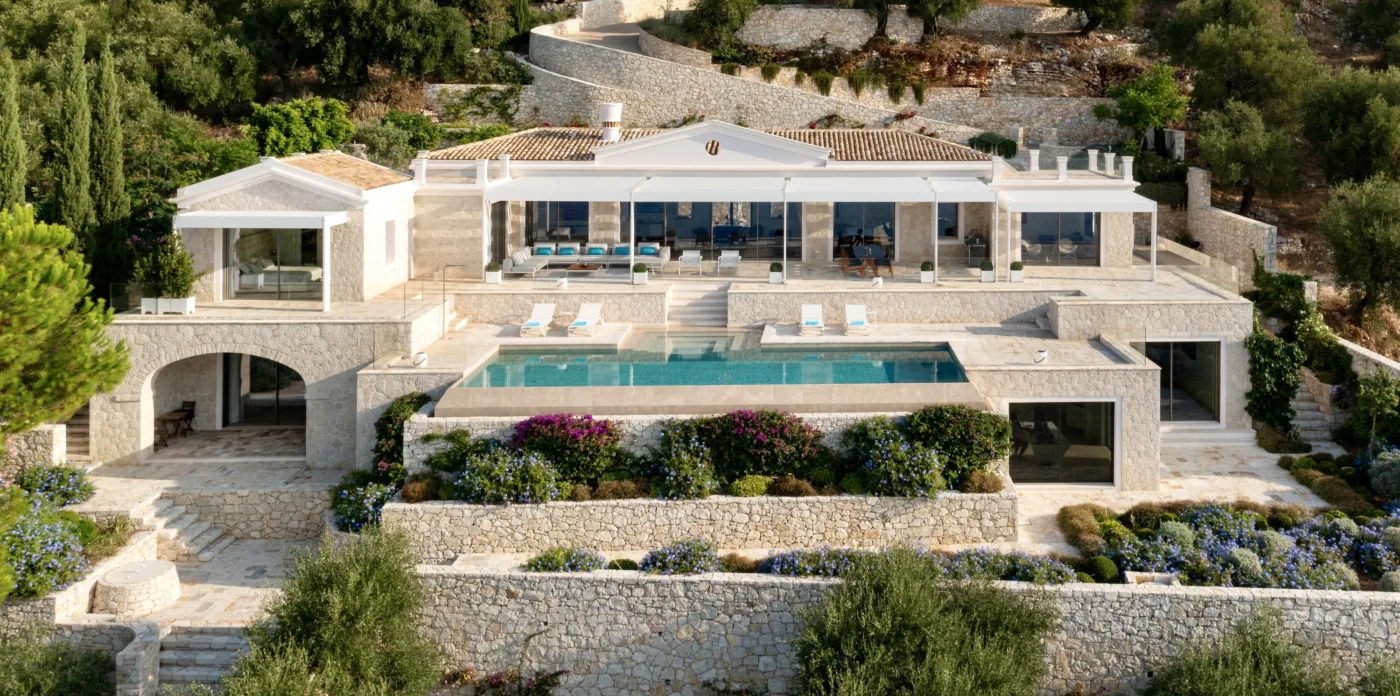 Το Ayline βρίσκεται στην Αγνή, σε μικρή απόσταση με τα πόδια από τον γραφικό κόλπο και τα διάσημα παραθαλάσσια εστιατόρια. Η βίλα παρουσιάζει ένα μοναδικό μείγμα κερκυραϊκών και βενετσιάνικων αρχιτεκτονικών επιρροών που συνδυάζονται με μοντέρνα αισθητική. Δύο ξεχωριστά χαρακτηριστικά είναι τα παράθυρα που ενισχύουν την πανοραμική θέα και η πέτρα που χρησιμοποιήθηκε στην πρόσοψη και τους εξωτερικούς τοίχους, η οποία προήλθε απευθείας από τους χώρους του ακινήτου. Κάθε πέτρα διαμορφώθηκε σχολαστικά στο χέρι από έναν εξειδικευμένο τεχνίτη και συναρμολογήθηκε μεταξύ τους σαν κομμάτια ενός περίπλοκου παζλ.