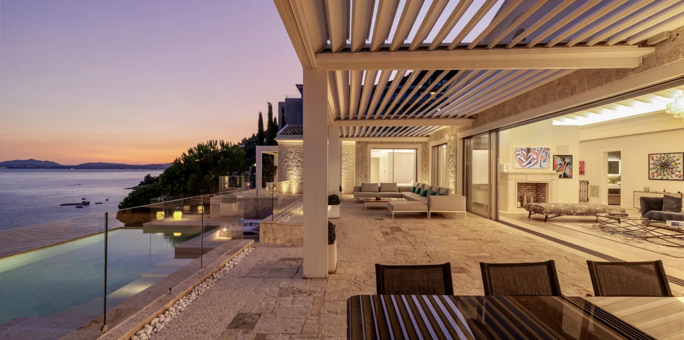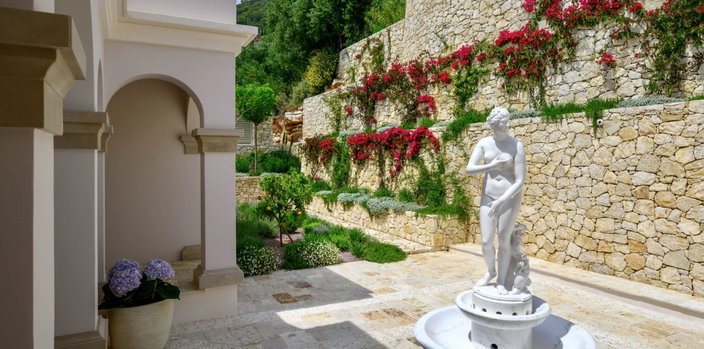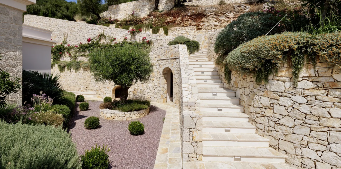 Το Ayline περιβάλλεται από έναν εκτεταμένο μεσογειακό κήπο που αποκαλύπτει μια μεγάλη ποικιλία χλωρίδας, συμπεριλαμβανομένων περισσότερων από 50 ελαιόδεντρων και περισσότερων από 100 διαφορετικών ειδών λουλουδιών, θάμνων και δέντρων, όπως σύκο, φιστίκι, πεύκο, ρόδι, τζακαράντα, λεμόνι, πορτοκάλι, ρομπίνια και κουμκουάτ. Οι άφθονες πέτρινες αναβαθμίδες σε όλο το ακίνητο παρέχουν απολαυστικούς υπαίθριους χώρους διαβίωσης. Ο χώρος της πισίνας διαθέτει 285 τ.μ. βεράντες, μέρος των οποίων καλύπτεται από αυτόματες βιοκλιματικές πέργκολες. Αυτές οι περιοχές παρέχουν ένα ιδανικό σκηνικό χαλάρωσης και υπαίθριας τραπεζαρίας, ενώ βυθίζεστε στη γραφική θέα.