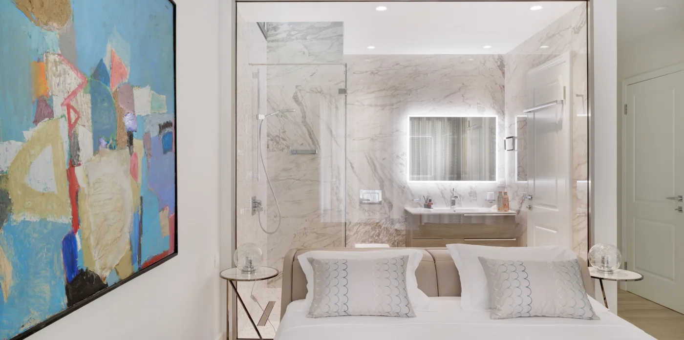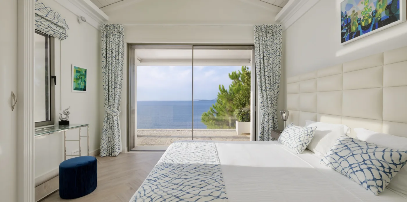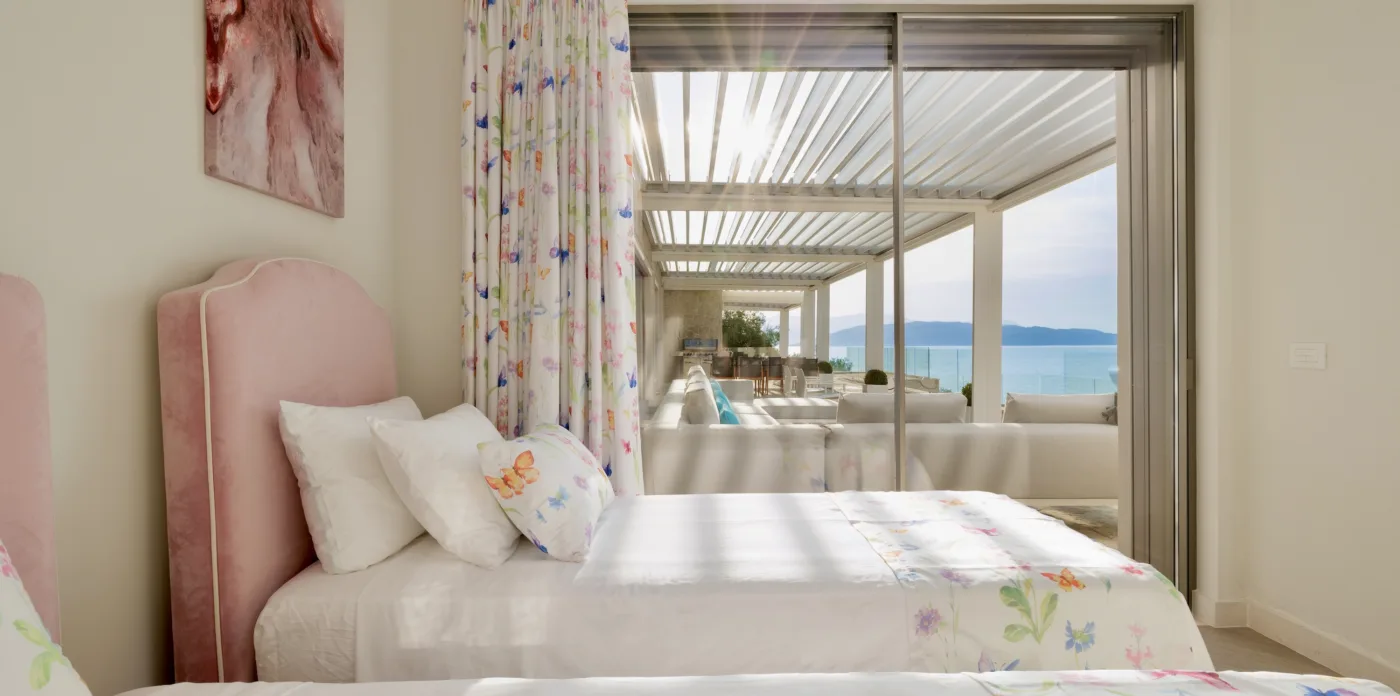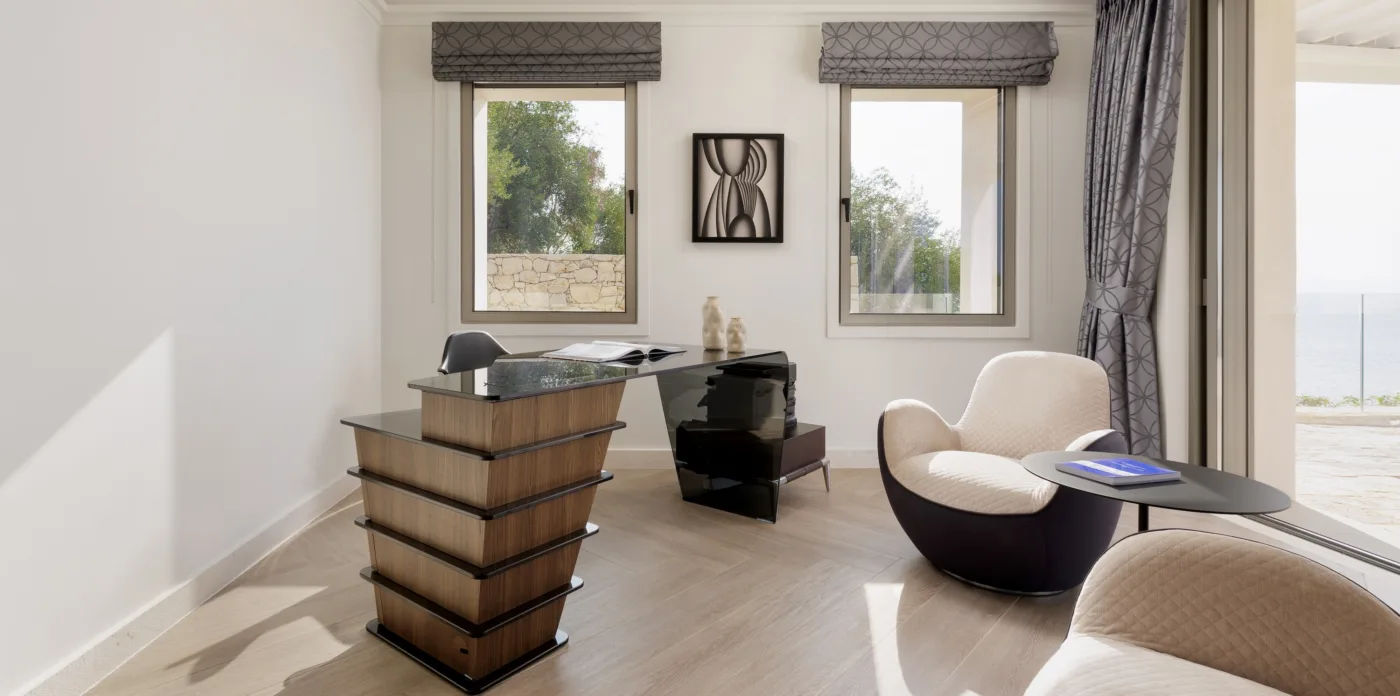 Το ακίνητο, που αρχικά είχε σχεδιαστεί για εννέα υπνοδωμάτια και επτά μπάνια, έχει τροποποιηθεί και σήμερα αποτελείται από έξι εξαιρετικά άνετα και άψογα σχεδιασμένα υπνοδωμάτια. Τα υπόλοιπα τρία δωμάτια έχουν επαναχρησιμοποιηθεί για να καλύψουν διάφορες ανάγκες. Ένα από τα δωμάτια χρησιμεύει τώρα ως ευρύχωρο γραφείο με δική του ιδιωτική είσοδο, προσφέροντας πανοραμική θέα στο περιβάλλον. Ένα άλλο δωμάτιο έχει μετατραπεί σε γυμναστήριο, με εκπληκτική θέα στη θάλασσα και, τέλος, το τρίτο δωμάτιο χρησιμεύει ως πρόσθετο γραφείο ή χώρος βιβλιοθήκης.