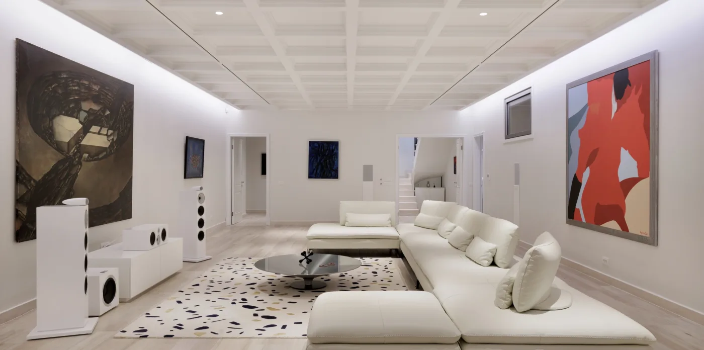 Στο κάτω ισόγειο, θα μαγευτείτε από την καλλιτεχνική ατμόσφαιρα του χώρου διπλού σκοπού - μια δυναμική γκαλερί τέχνης που έχει σχεδιαστεί σχολαστικά για να αναπαράγει την ατμόσφαιρα ενός μουσείου, επιτρέποντας την αβίαστη εναλλαγή και αλλαγή των εκθεμάτων τέχνης. Με το πάτημα ενός κουμπιού, ο χώρος μετατρέπεται σε έναν πρωτοποριακό οικιακό κινηματογράφο με υπερσύγχρονα οπτικοακουστικά συστήματα για μια κινηματογραφική εμπειρία που συναγωνίζεται εκείνη ενός επαγγελματικού κινηματογράφου.