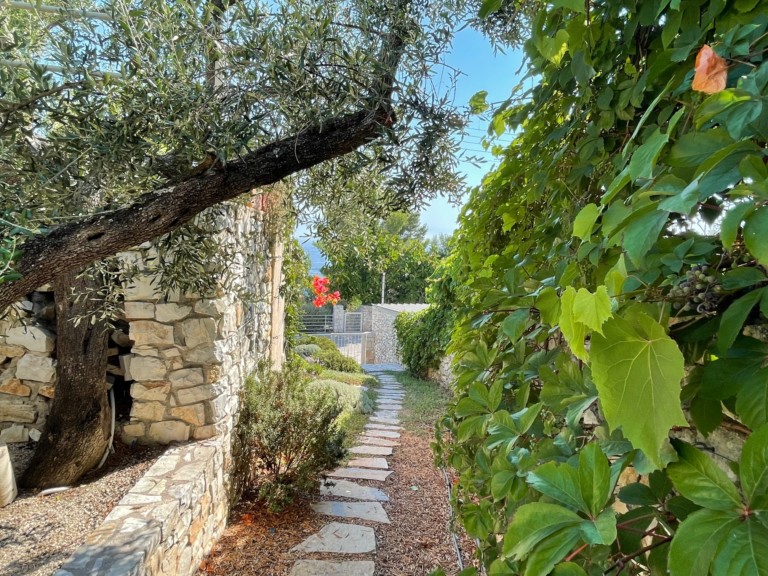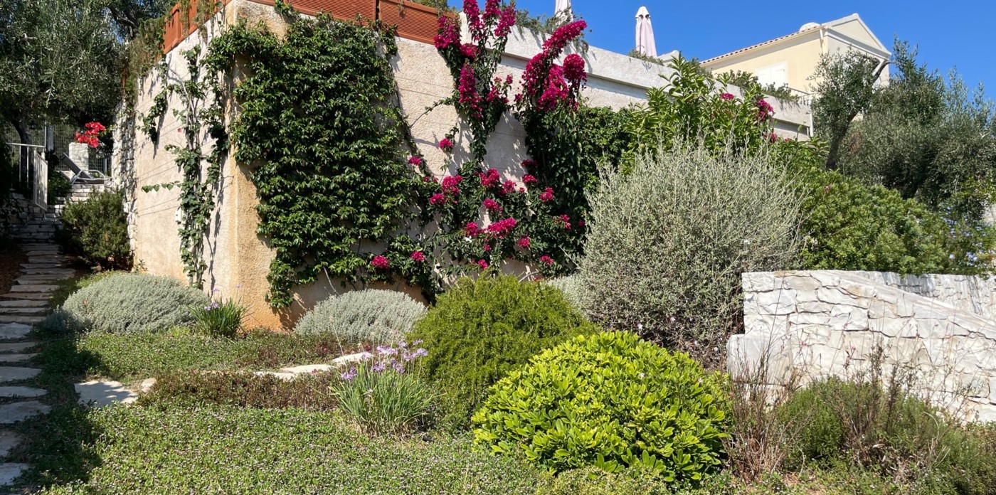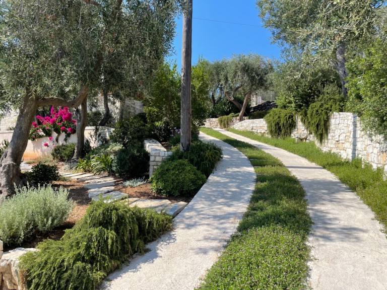 Περιτριγυρισμένοι από καταπράσινη μεσογειακή φύτευση, οι κήποι έχουν διαμορφωθεί και σχεδιαστεί σε απόλυτη αρμονία με τη φύση. Ένα μικρό πλακόστρωτο μονοπάτι οδηγεί μέσα από τους κήπους μέχρι τα γαλαζοπράσινα νερά που αγκαλιάζουν απαλά την άκρη του κήπου.