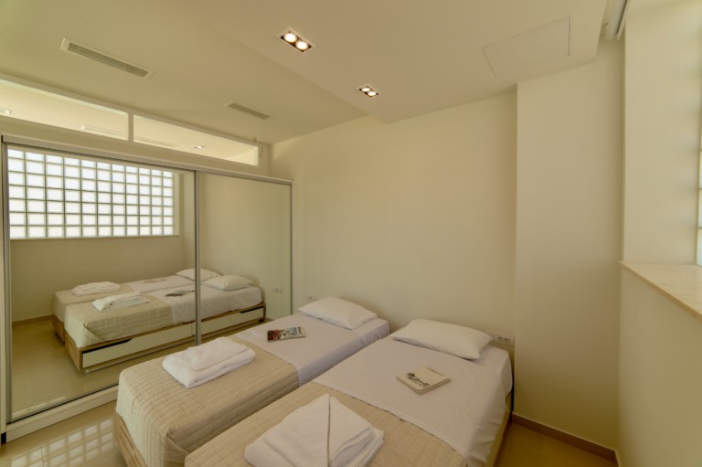 Το ισόγειο διαθέτει ένα σαλόνι διπλού ύψους, μια ευρύχωρη τραπεζαρία, μια πλήρως εξοπλισμένη κουζίνα, ένα μπάνιο επισκεπτών και ένα άνετο υπνοδωμάτιο με δύο μονά κρεβάτια. Το ανώτερο επίπεδο είναι προσβάσιμο μέσω μιας εκπληκτικής σκάλας από ατσάλι και γυαλί και διαθέτει δύο πολυτελή υπνοδωμάτια, το καθένα με ιδιωτικό μπάνιο, ιδιωτική βεράντα και άφθονο χώρο για ντουλάπες.