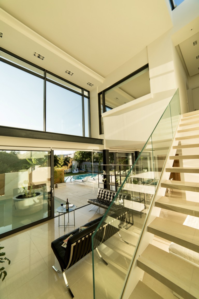 Η χρήση γυαλιού, χάλυβα και σκυροδέματος στο ακίνητο δημιουργεί ένα άψογο μείγμα εσωτερικών και εξωτερικών χώρων διαβίωσης, με το φυσικό φως να κατακλύζει το ανοιχτό εσωτερικό.