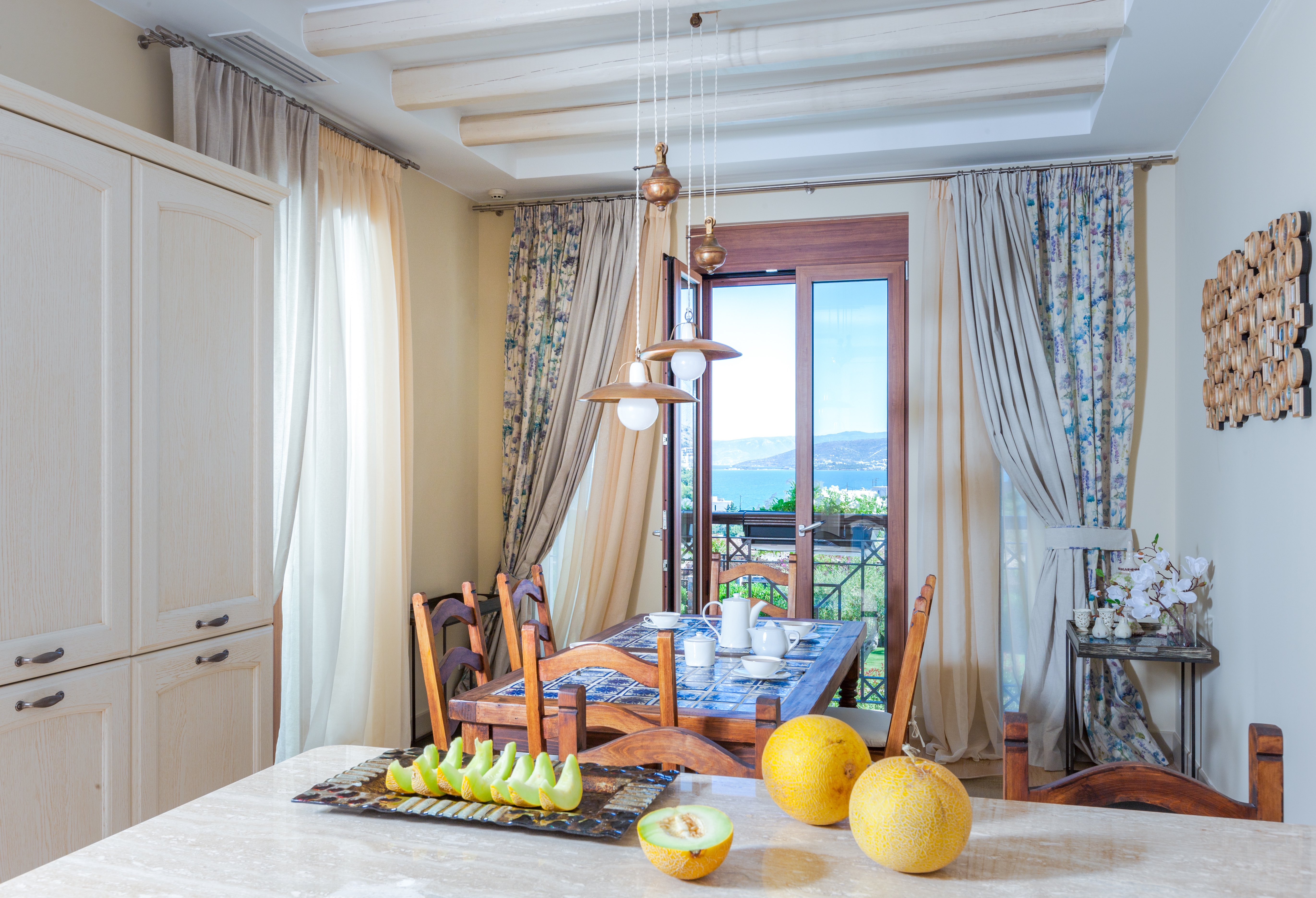 Οι χώροι καθιστικού είναι φωτεινοί και ευάεροι, με θολωτές οροφές και ξύλινα δάπεδα. Οι λευκοί τοίχοι και τα λευκά έπιπλα δημιουργούν μια ξεκούραστη αίσθηση που τονίζεται από πολύχρωμες πινελιές. Για πιο ζεστά βράδια, υπάρχουν καθιστικά γύρω από το αυθεντικό τζάκι.