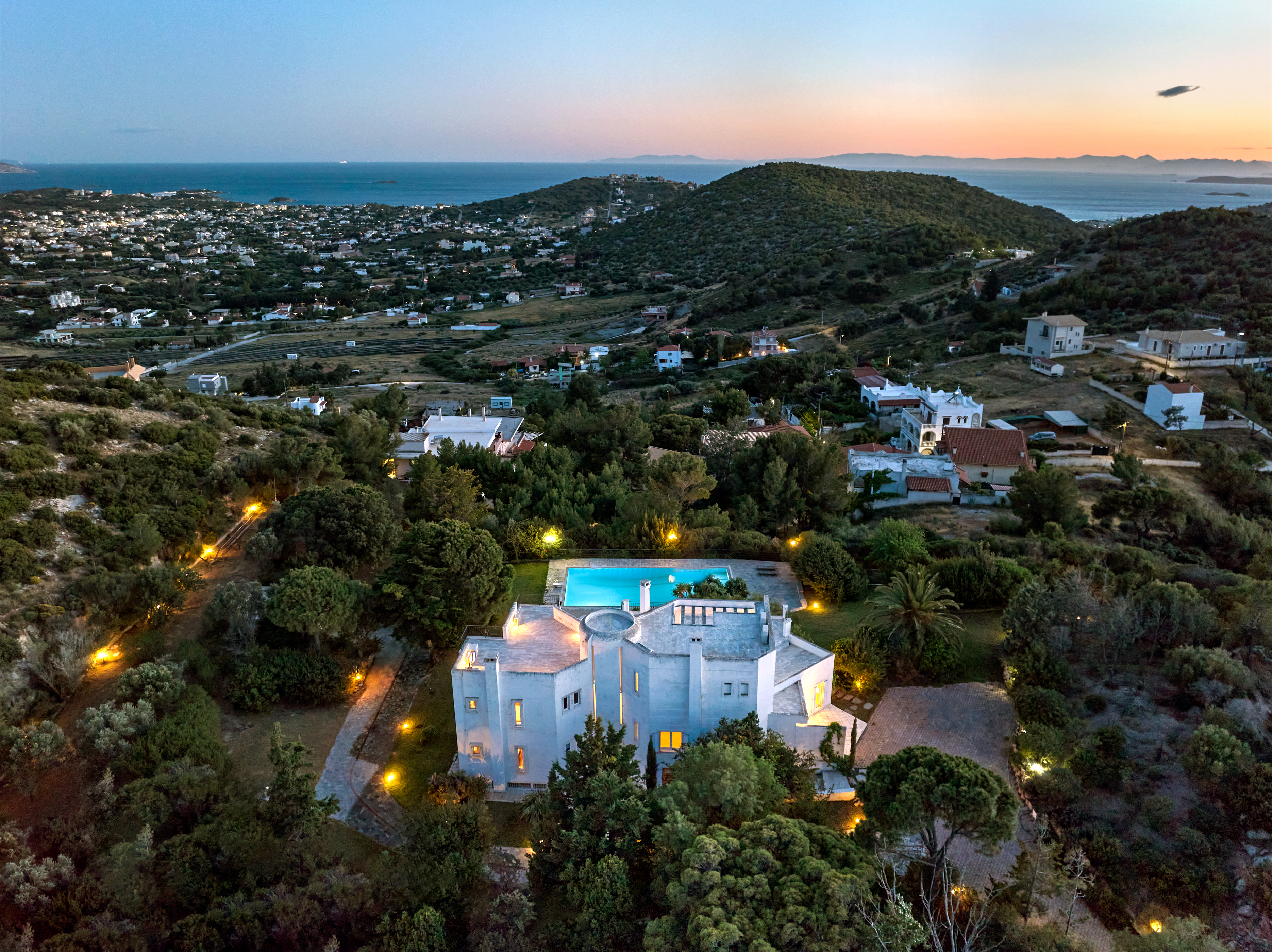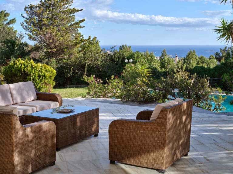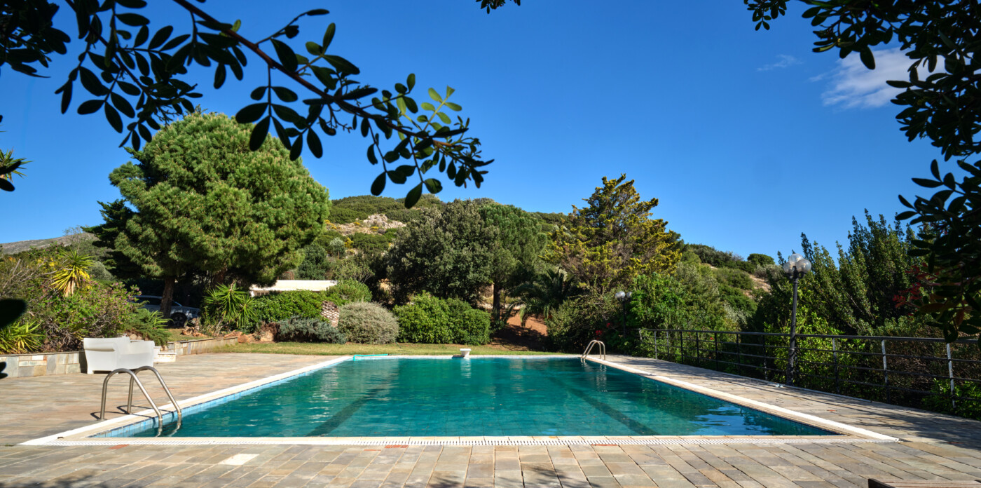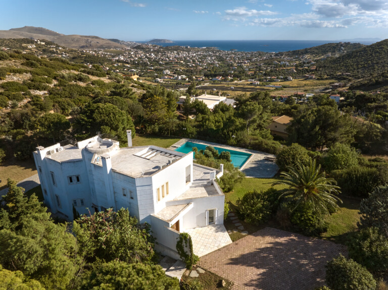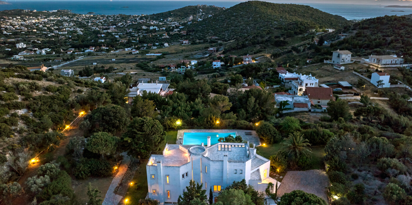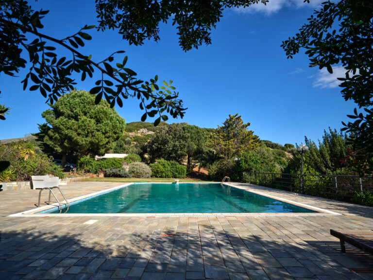 Τοποθετημένο περήφανα στην πλαγιά ενός λόφου, αυτό το αρχοντικό προσφέρει τέλεια θέα στο γαλάζιο του Αιγαίου, τα βουνά και τη θάλασσα.