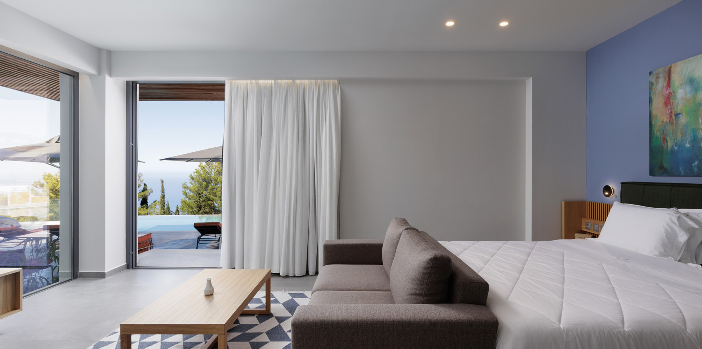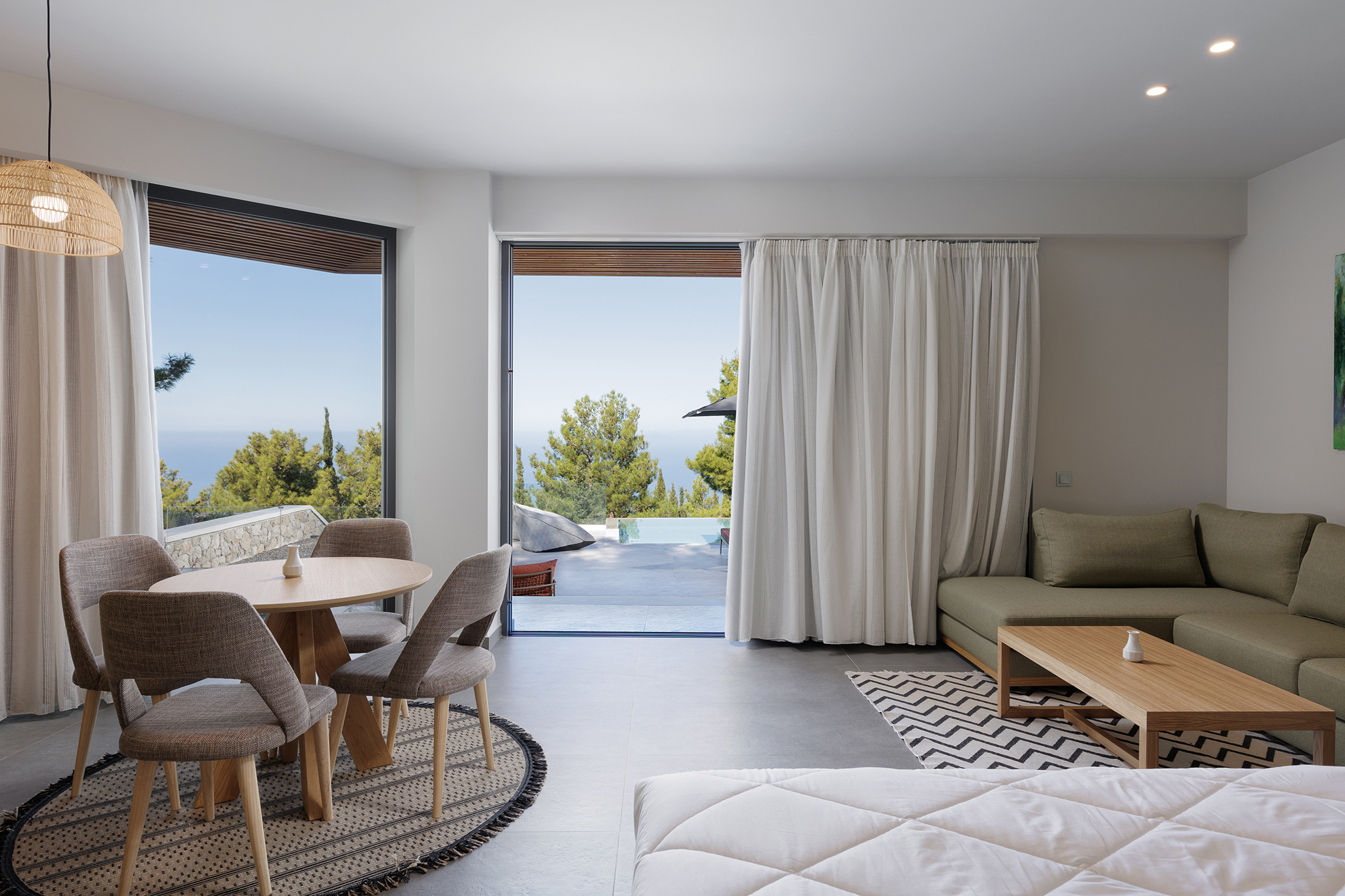 Οι εσωτερικοί χώροι έχουν επίσης σχεδιαστεί με εμπειρογνωμοσύνη με επίκεντρο την υπέροχη θέα. Χτισμένο σε δύο επίπεδα, άνετη μοντέρνα επίπλωση και παράθυρα από το δάπεδο μέχρι την οροφή που επιτρέπουν σε κάθε χώρο να βλέπει προς τη θάλασσα, συνοψίζουν τη συνολική αίσθηση του Cadmus.