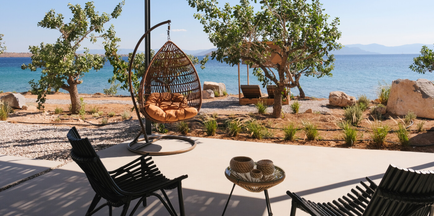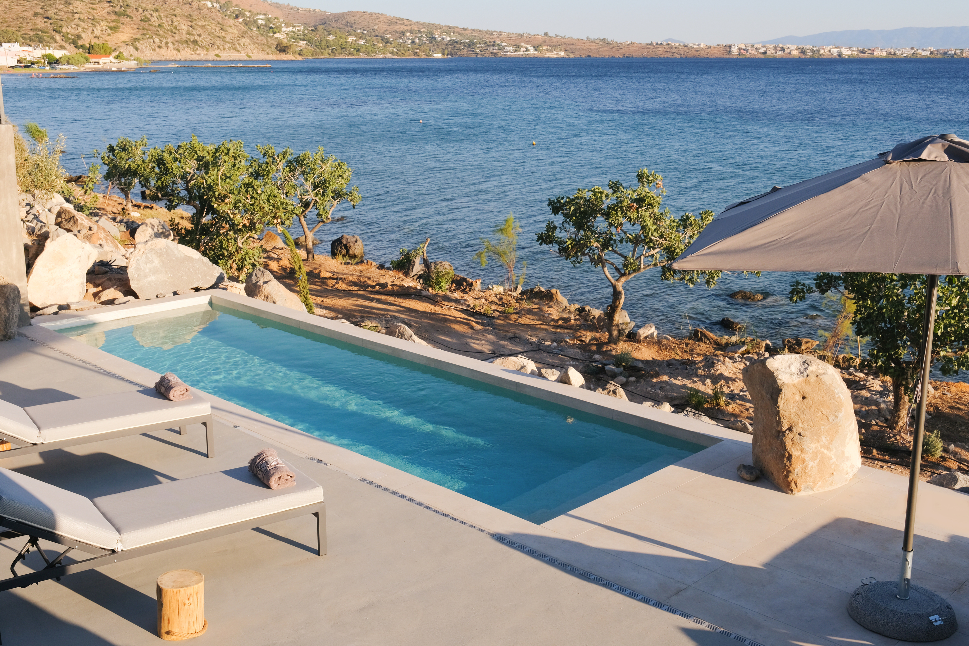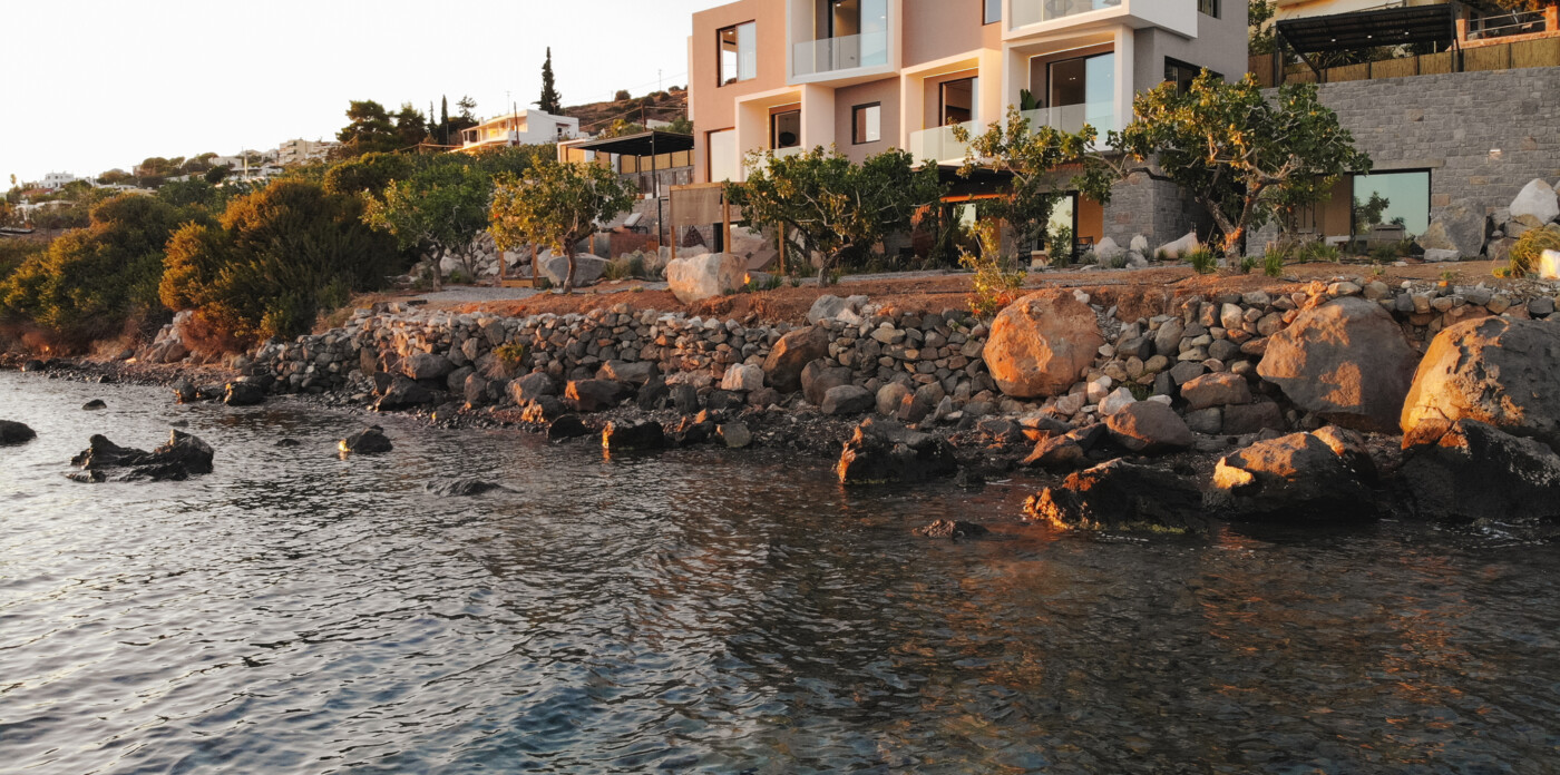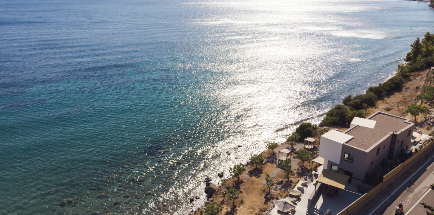 Οι ευρύχωροι εξωτερικοί χώροι προσφέρουν πολύτιμες στιγμές χαλάρωσης με μια πισίνα 23 τ.μ., μια σκεπαστή τραπεζαρία και πολλαπλά σκιερά σαλόνια. Το υπαίθριο σαλόνι, διαθέτει υπαίθριο τζάκι και ανεμπόδιστη θέα στον Σαρωνικό κόλπο. Πέτρινα σκαλοπάτια σας οδηγούν σε μια απομονωμένη παραλία, ολοκληρώνοντας την απολαυστική εμπειρία υπαίθριας διαβίωσης.