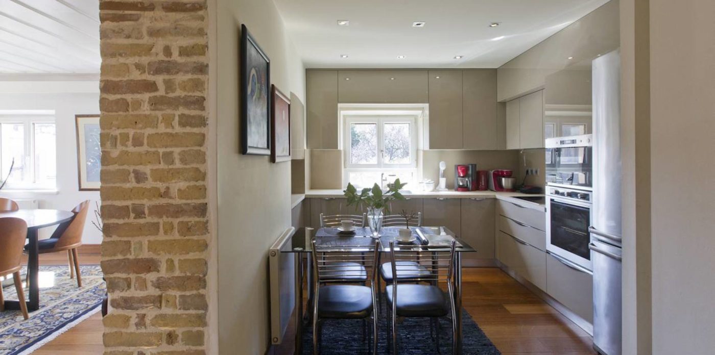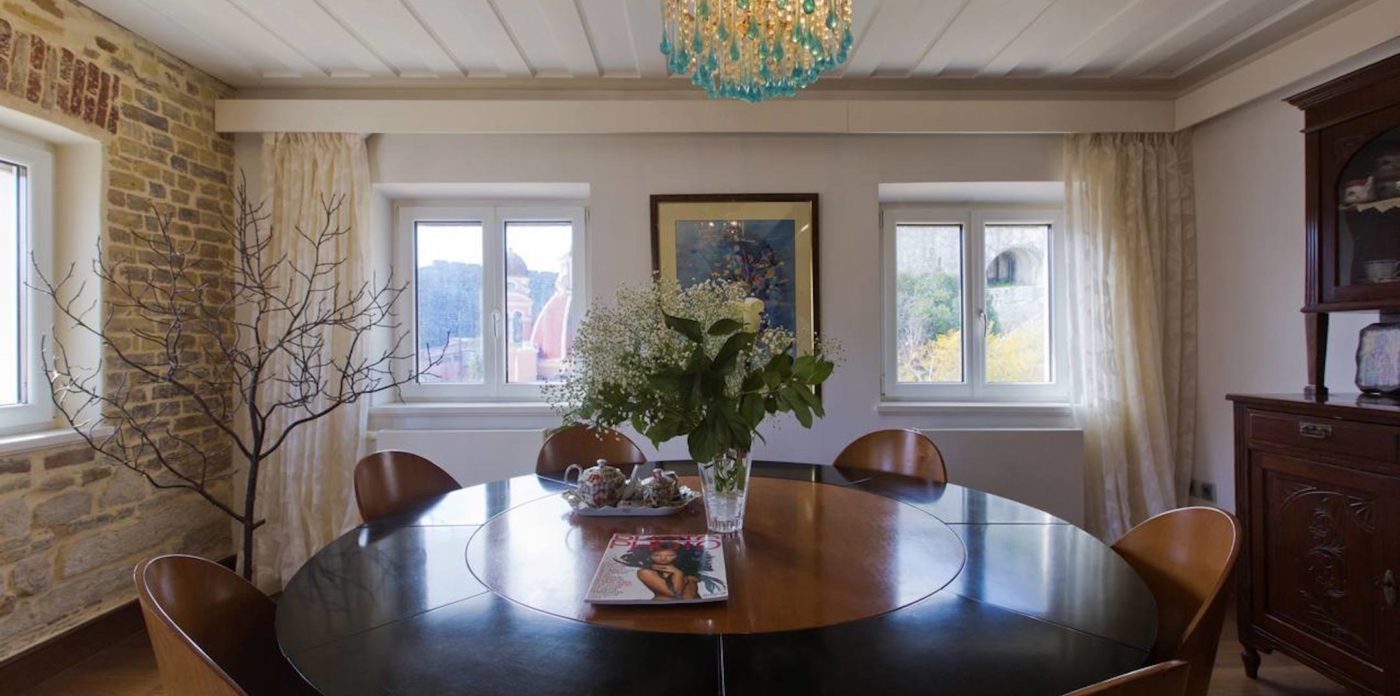 Η τραπεζαρία είναι διακοσμημένη με ξύλινη οροφή κερκυραϊκού στυλ, προσθέτοντας χαρακτήρα σε αυτή τη γωνιά του διαμερίσματος.