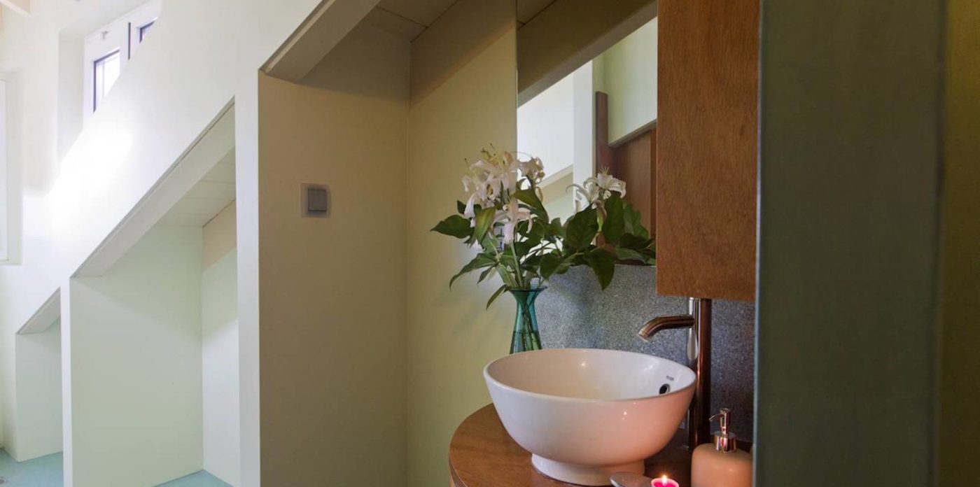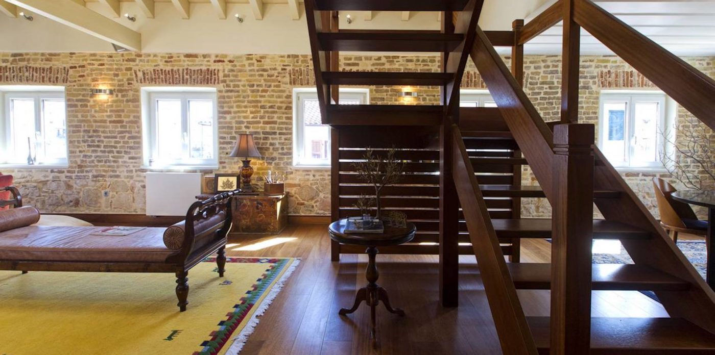 Η επιβλητική ξύλινη σκάλα, φτιαγμένη από αφρικανικά σκαλοπάτια σκληρού ξύλου, οδηγεί στο ανώτερο επίπεδο, όπου υπάρχει ένα εσωτερικό μπαλκόνι, με θέα στο σαλόνι.