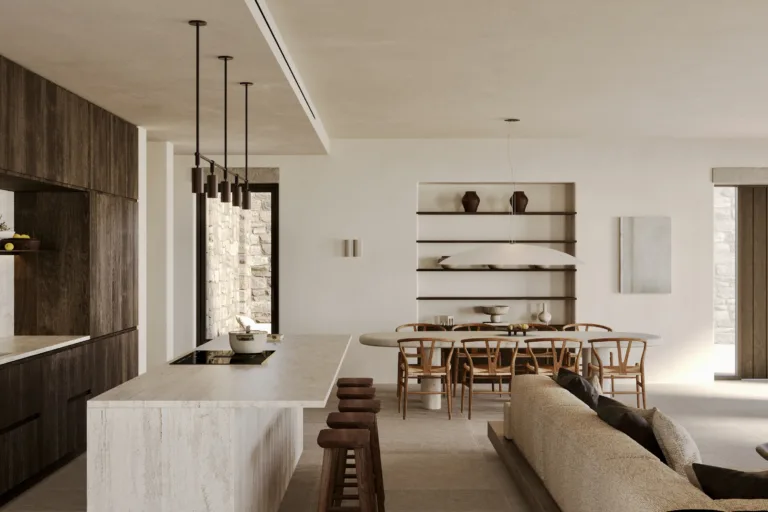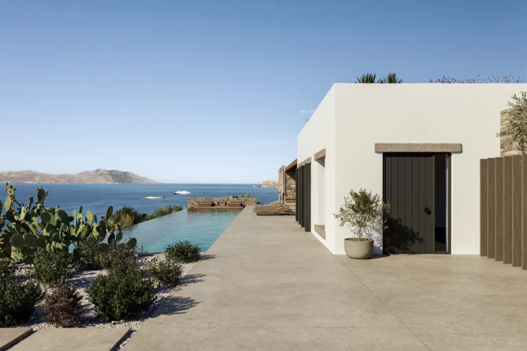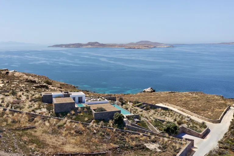 Η έξοχη ενσωμάτωση των φυσικών στοιχείων και της εσωτερικής και εξωτερικής διαβίωσης δημιουργεί αρμονία με το περιβάλλον του Αιγαίου.