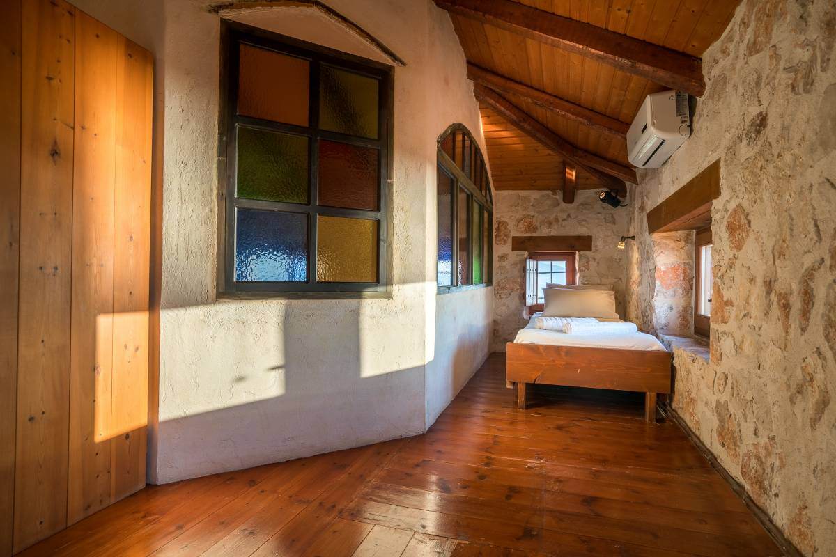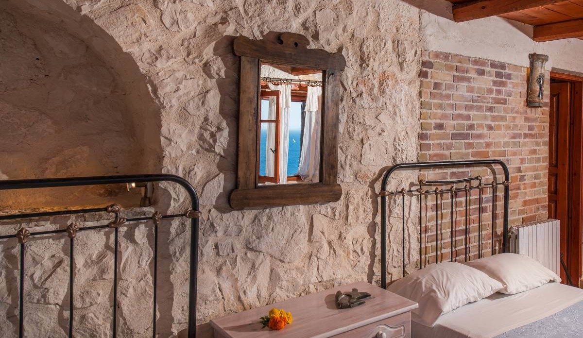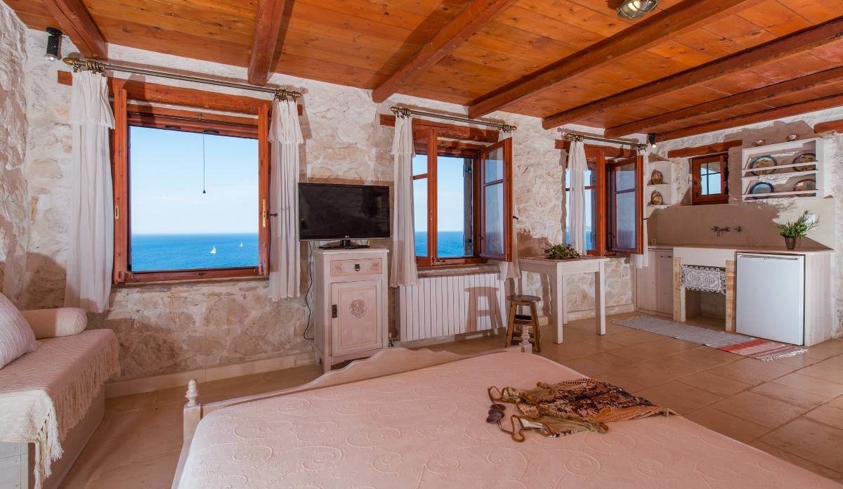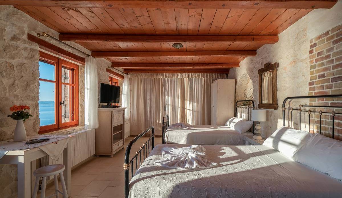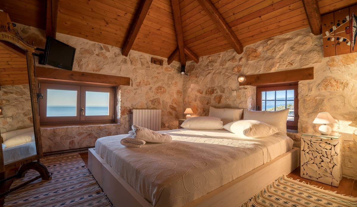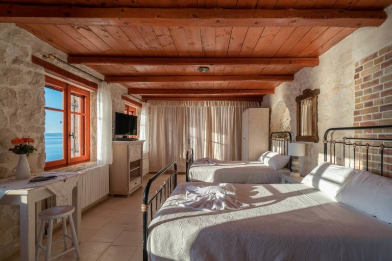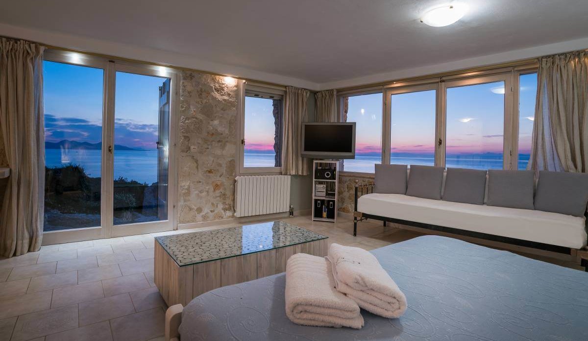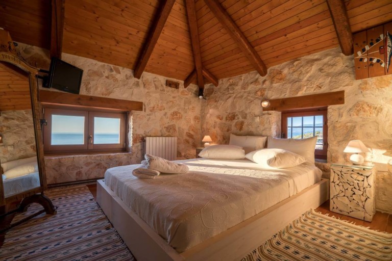Το τέταρτο υπνοδωμάτιο του Evander είναι ένας ιδιωτικός, αυτόνομος ξενώνας με παράθυρα από το δάπεδο μέχρι την οροφή με θέα στη θάλασσα, την πισίνα και την Κεφαλονιά στο βάθος.