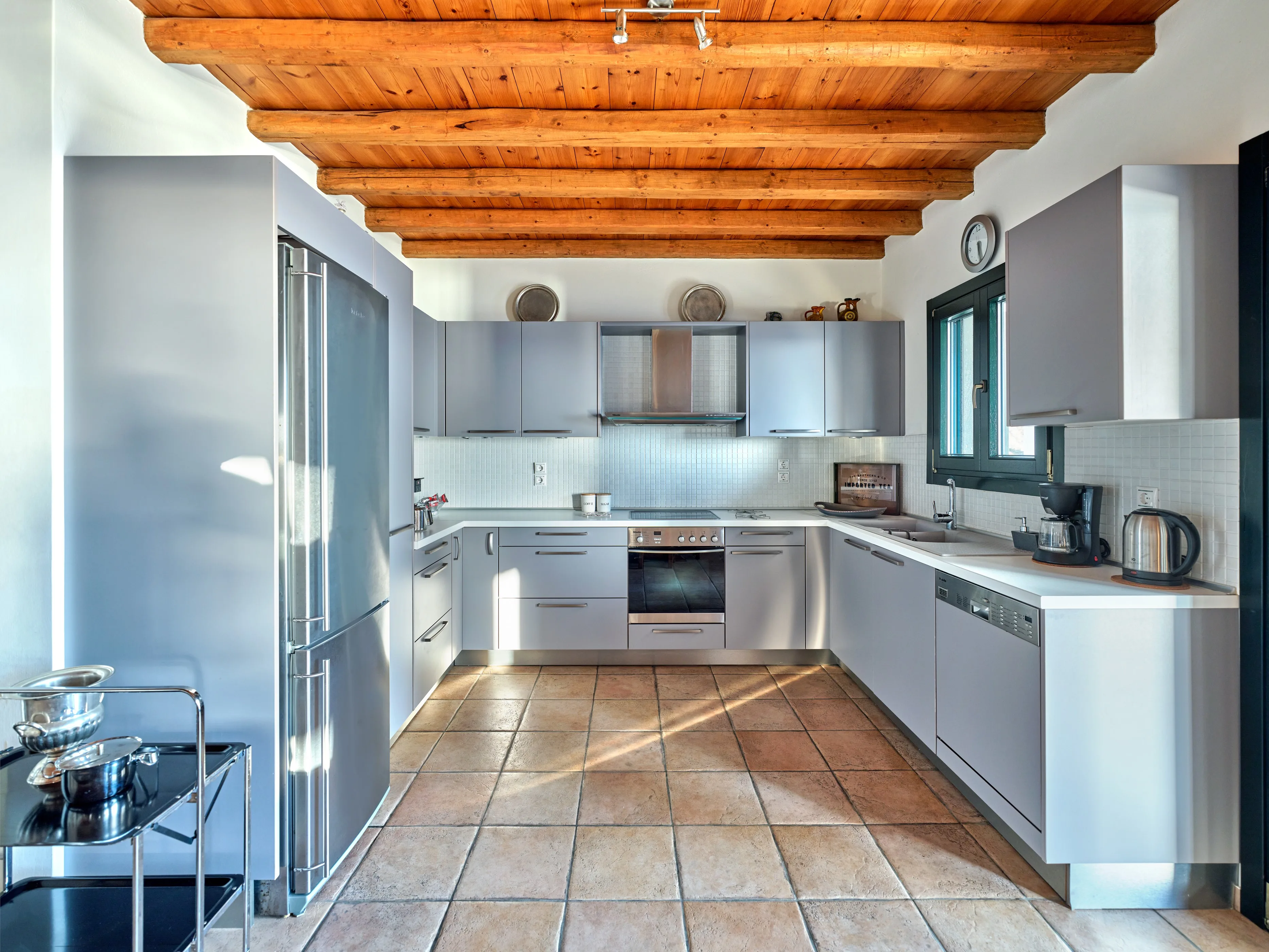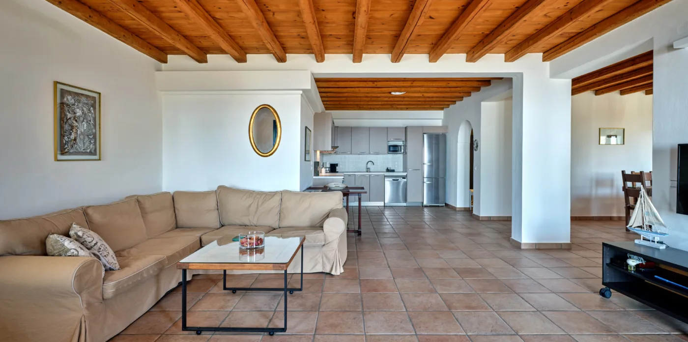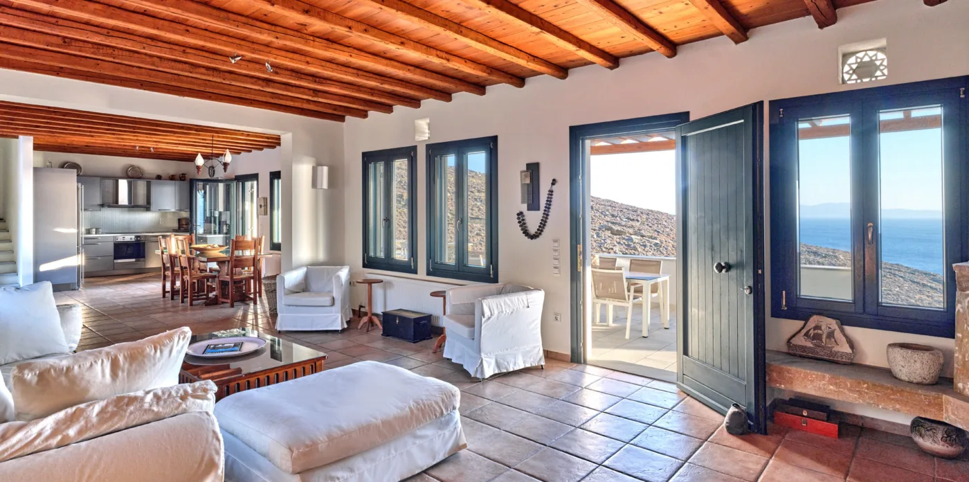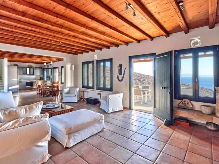 Η ανοιχτή διαρρύθμιση των εσωτερικών χώρων περιλαμβάνει το καθιστικό και την τραπεζαρία, καθώς και μια πλήρως εξοπλισμένη κουζίνα. Οι πόρτες και τα παράθυρα με εικόνες στους χώρους διαβίωσης δημιουργούν έναν οργανικό καμβά που αναδεικνύει τη διαχρονική ομορφιά του νησιού. Τα ξύλινα δοκάρια στις οροφές και το δάπεδο από πλακόστρωτο ενισχύουν τη συνολική ατμόσφαιρα του χώρου, προσθέτοντας όχι μόνο μια νότα ζεστασιάς, αλλά και χαρακτήρα και βάθος.
