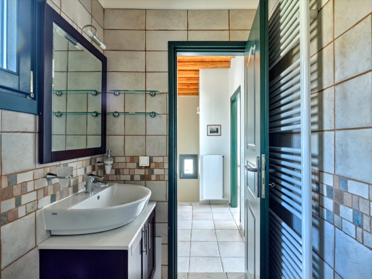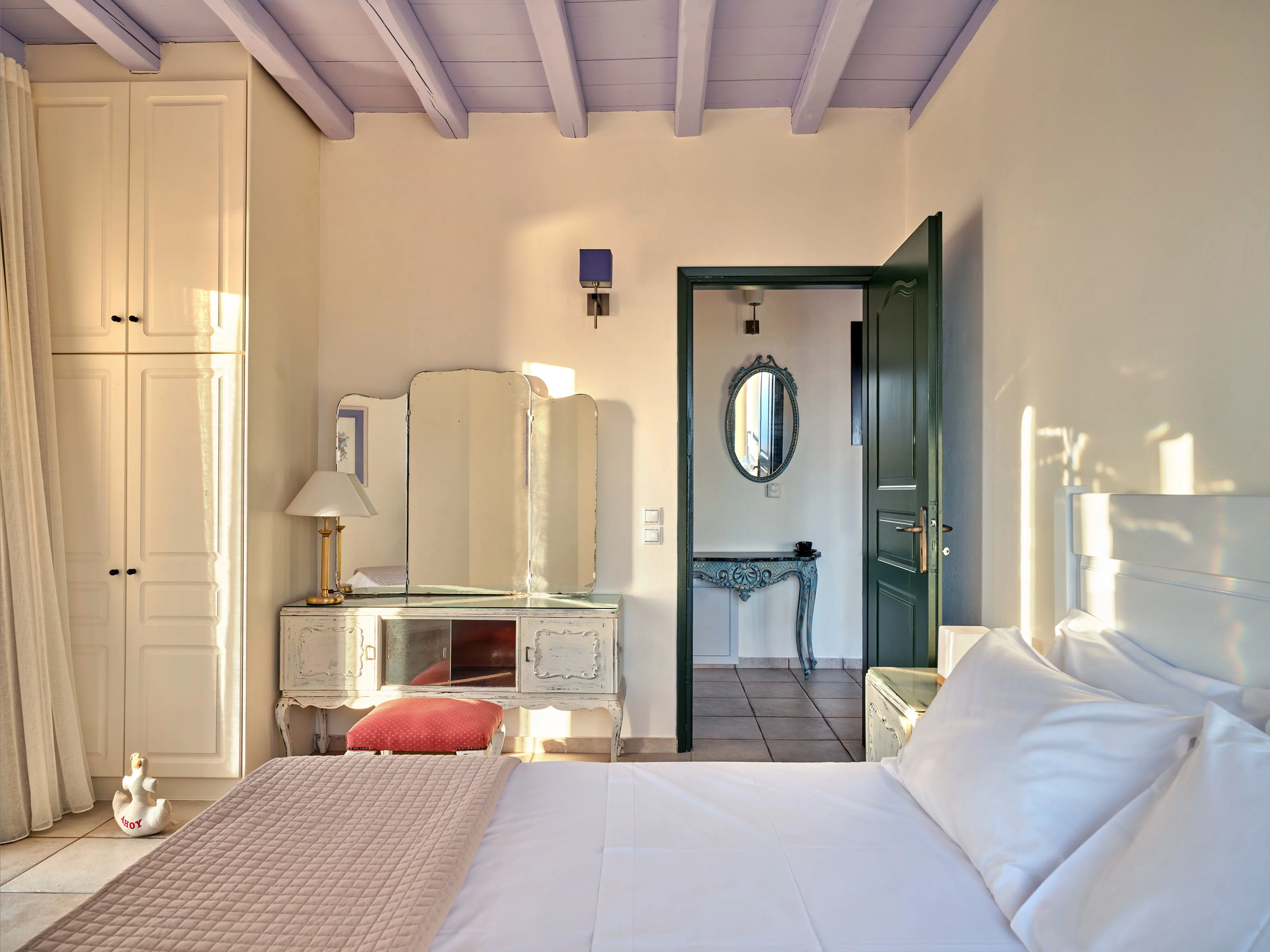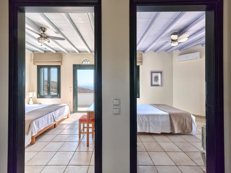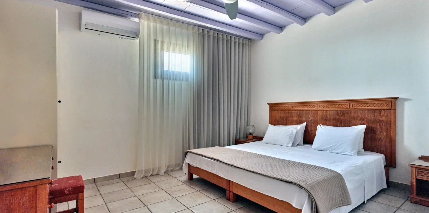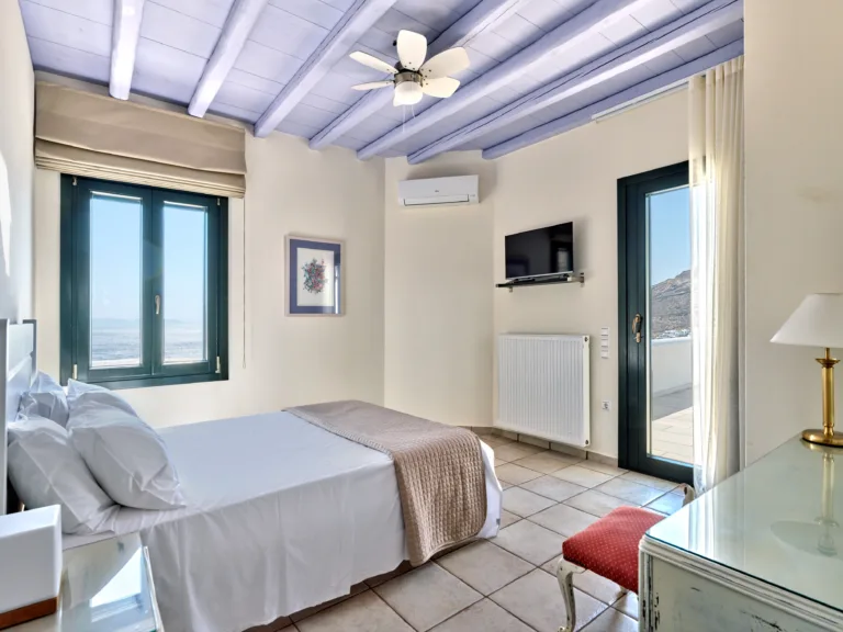 Η ανοιχτή διαρρύθμιση των εσωτερικών χώρων περιλαμβάνει το καθιστικό και την τραπεζαρία, καθώς και μια πλήρως εξοπλισμένη κουζίνα. Οι πόρτες και τα παράθυρα με εικόνες στους χώρους διαβίωσης δημιουργούν έναν οργανικό καμβά που αναδεικνύει τη διαχρονική ομορφιά του νησιού. Τα ξύλινα δοκάρια στις οροφές και το δάπεδο από πλακόστρωτο ενισχύουν τη συνολική ατμόσφαιρα του χώρου, προσθέτοντας όχι μόνο μια νότα ζεστασιάς, αλλά και χαρακτήρα και βάθος.