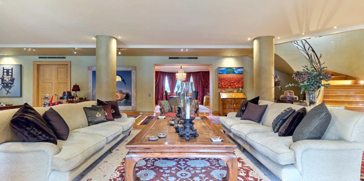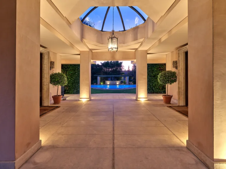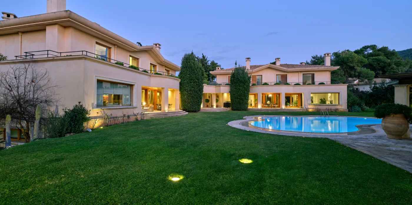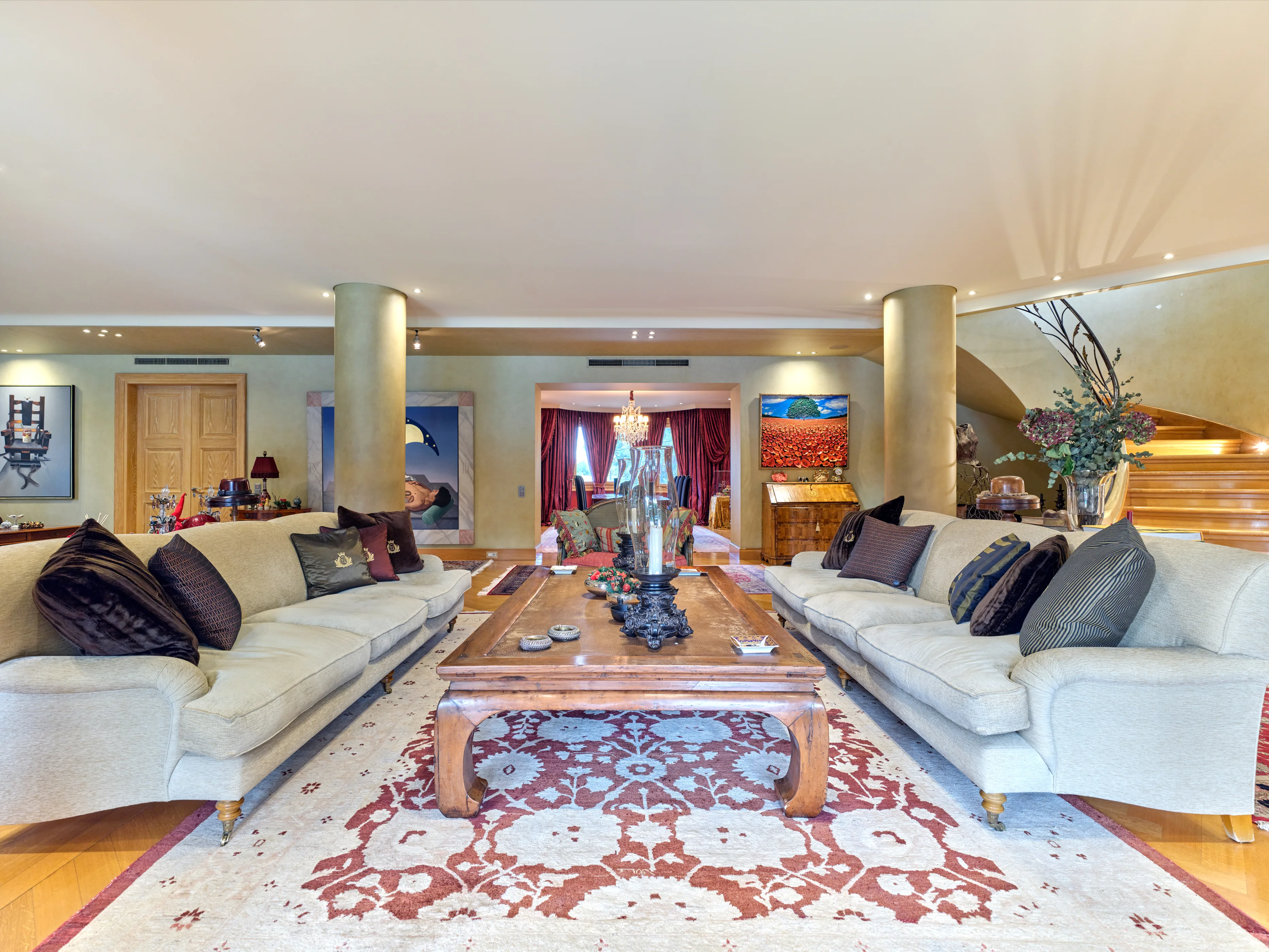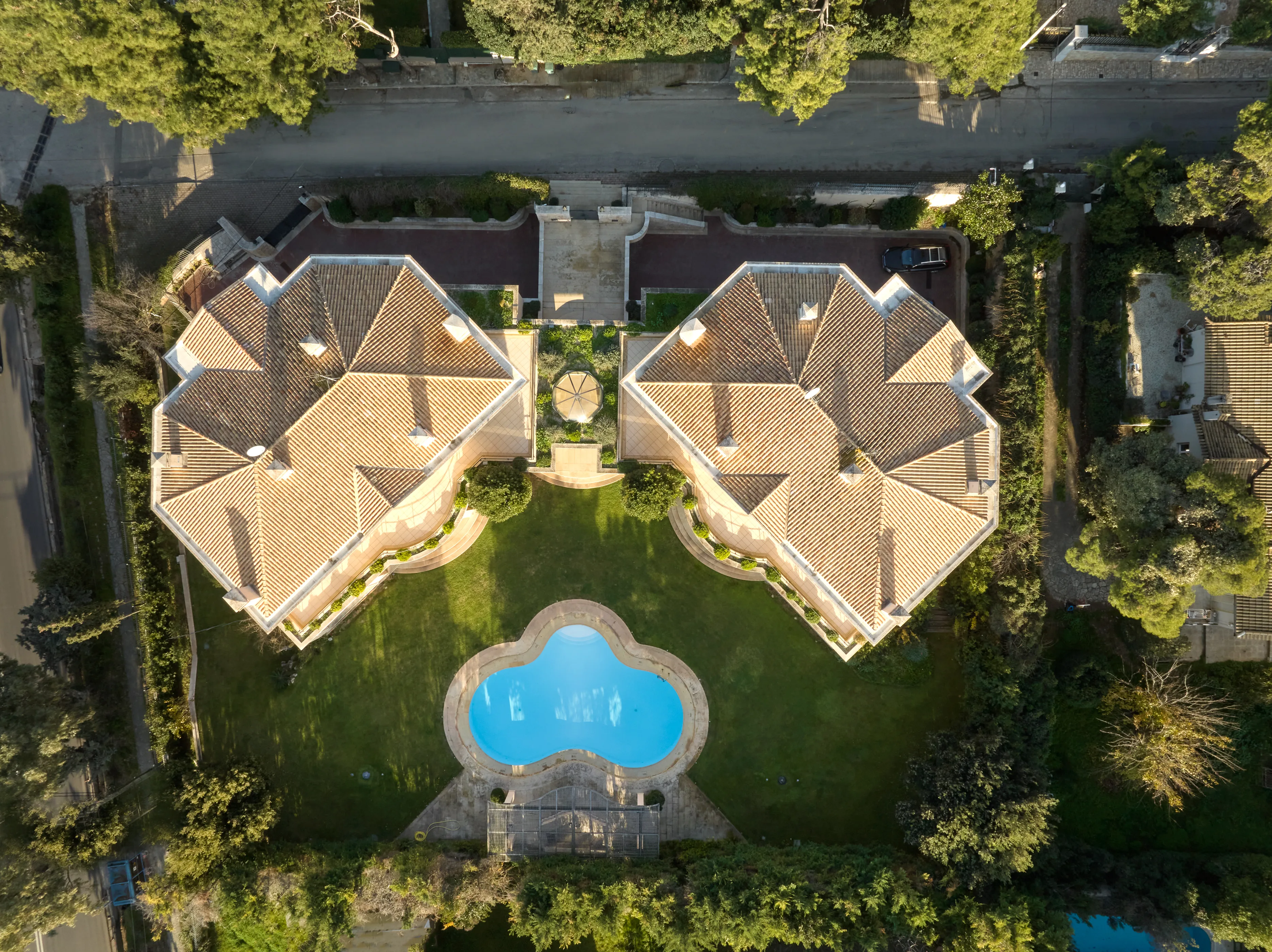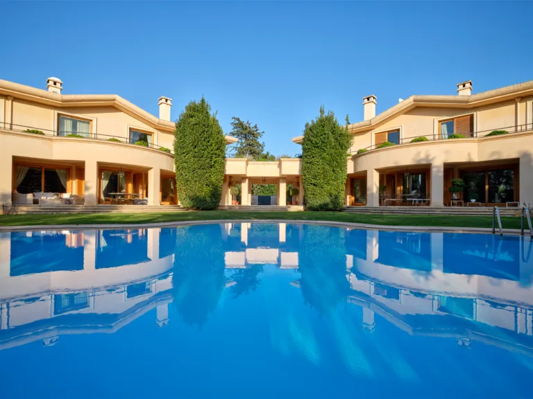 Η πρώτη κατοικία, που καλύπτει 1.021 τετραγωνικά μέτρα, ακτινοβολεί εκλέπτυνση. Το ισόγειο διαθέτει δύο ευρύχωρα καθιστικά που ενισχύονται από ένα τζάκι, μια τραπεζαρία, ένα γραφείο και μια κουζίνα. Στον επάνω όροφο, ένα ήσυχο καθιστικό συμπληρώνει τη σουίτα του ιδιοκτήτη με θέα στην πισίνα, η οποία συνοδεύεται από τρία υπνοδωμάτια με ιδιωτικό μπάνιο.