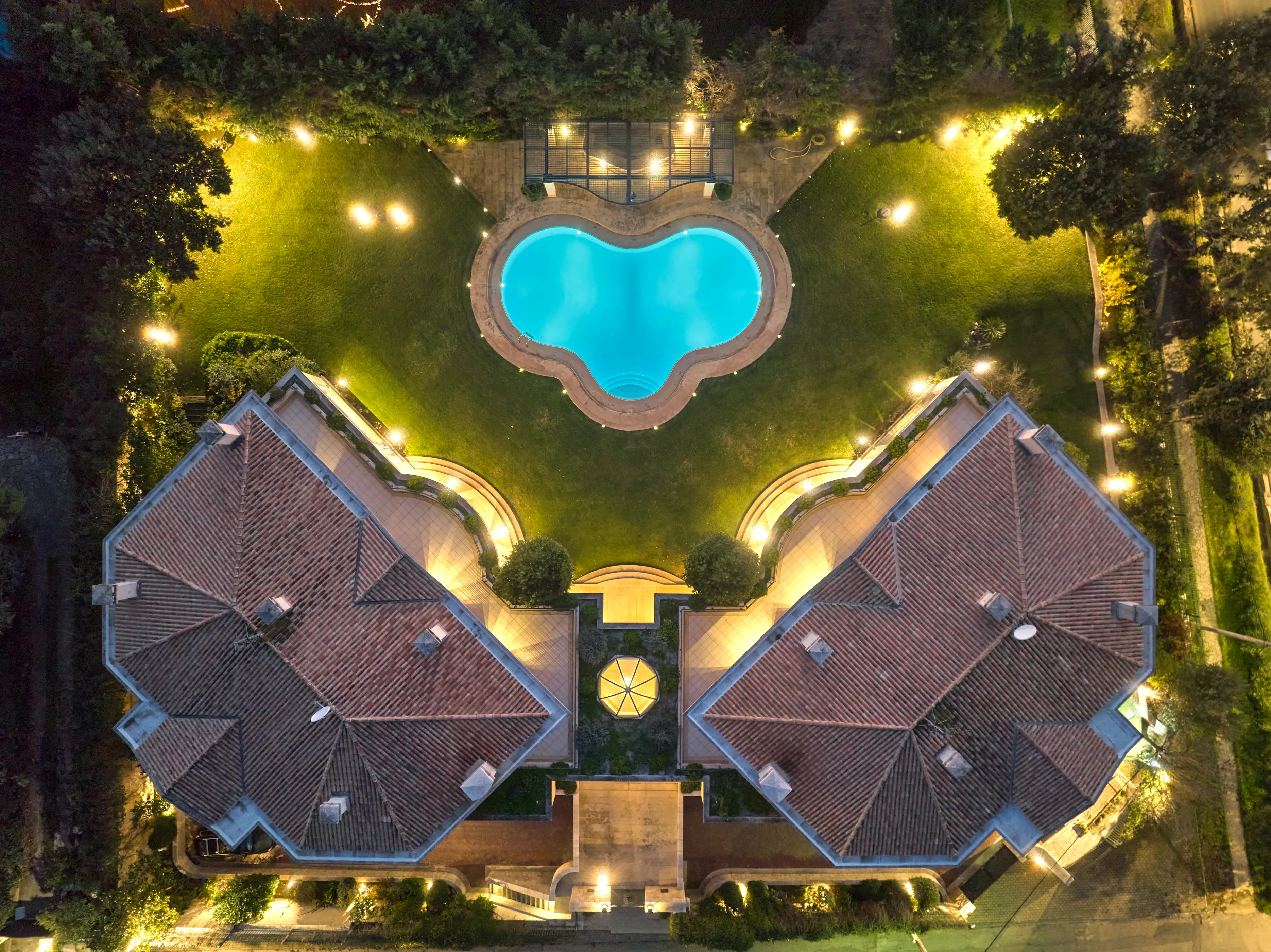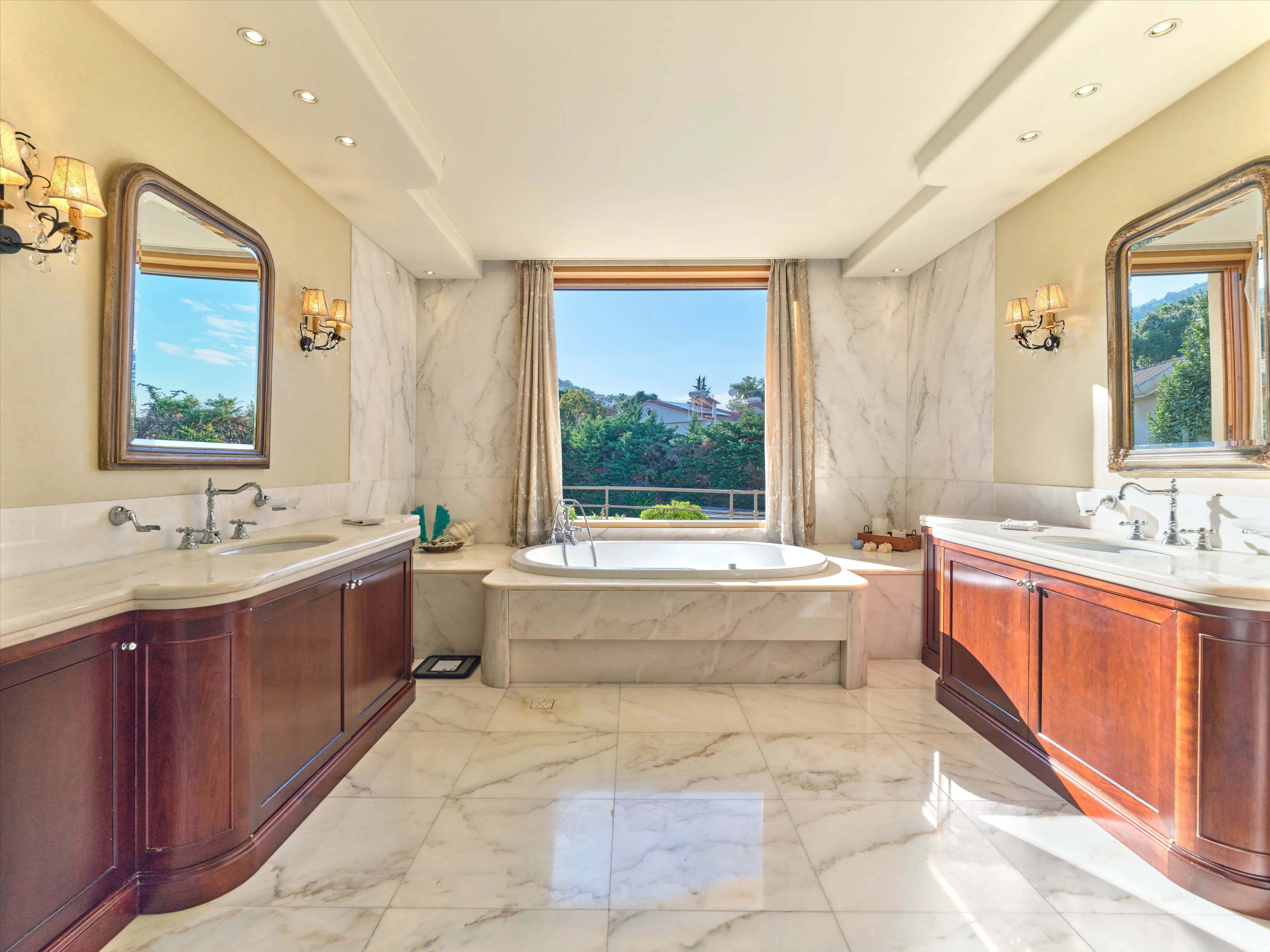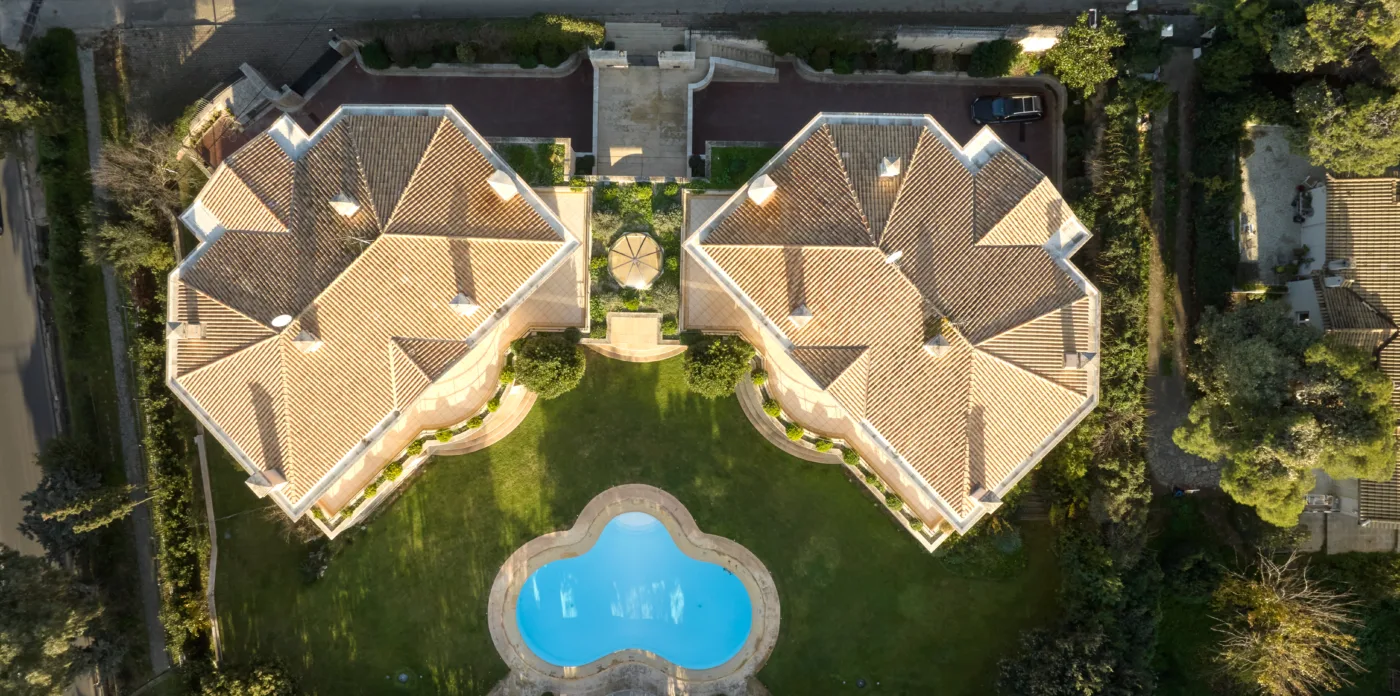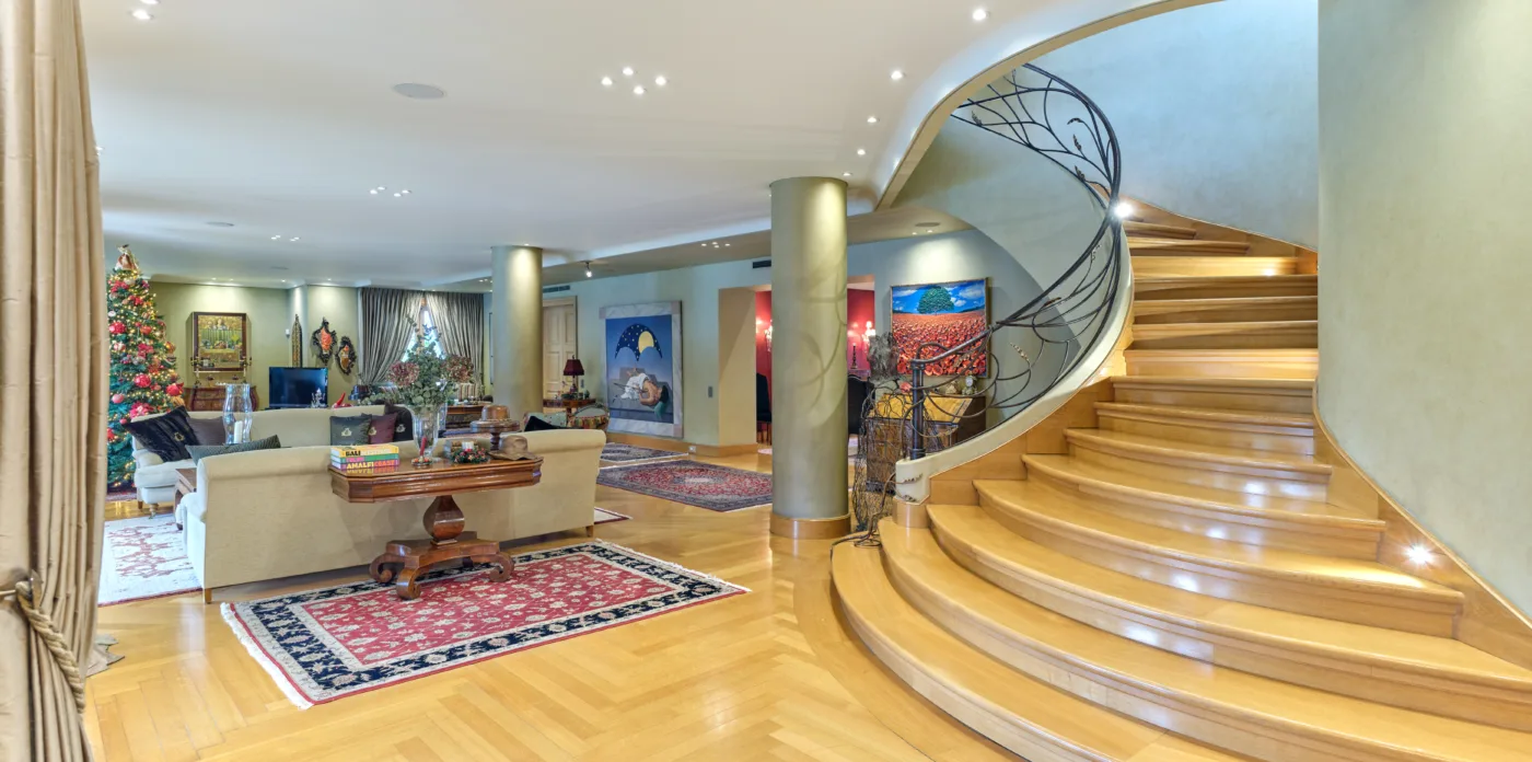 Η πρώτη κατοικία, που καλύπτει 1.021 τετραγωνικά μέτρα, ακτινοβολεί εκλέπτυνση. Το ισόγειο διαθέτει δύο ευρύχωρα καθιστικά που ενισχύονται από ένα τζάκι, μια τραπεζαρία, ένα γραφείο και μια κουζίνα. Στον επάνω όροφο, ένα ήσυχο καθιστικό συμπληρώνει τη σουίτα του ιδιοκτήτη με θέα στην πισίνα, η οποία συνοδεύεται από τρία υπνοδωμάτια με ιδιωτικό μπάνιο.