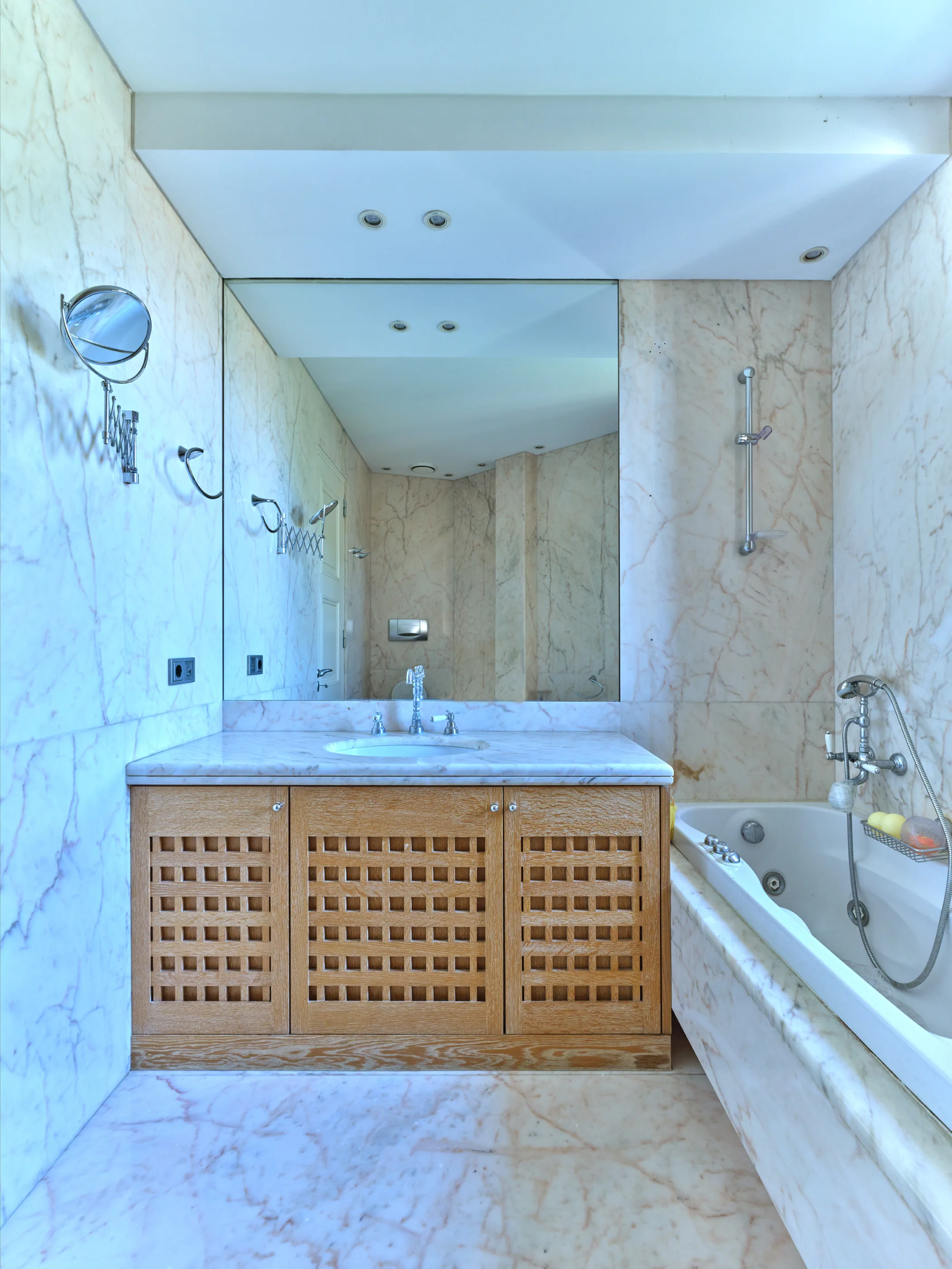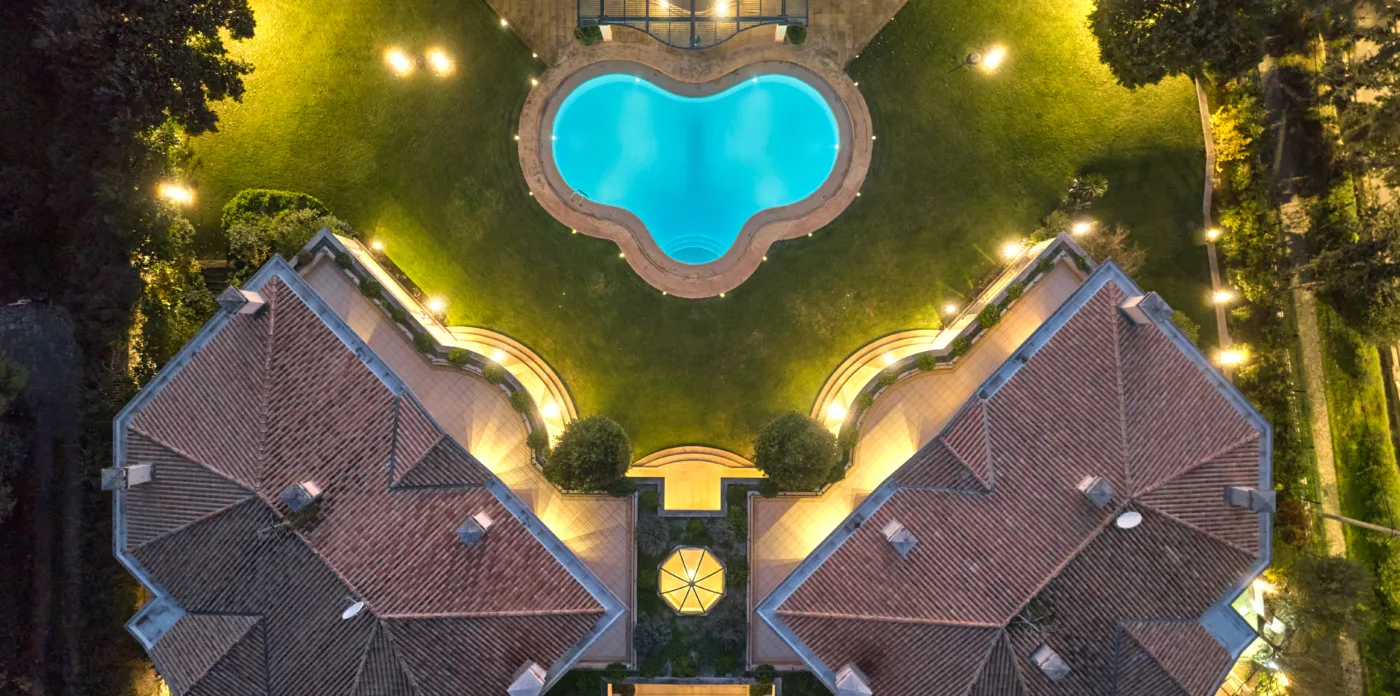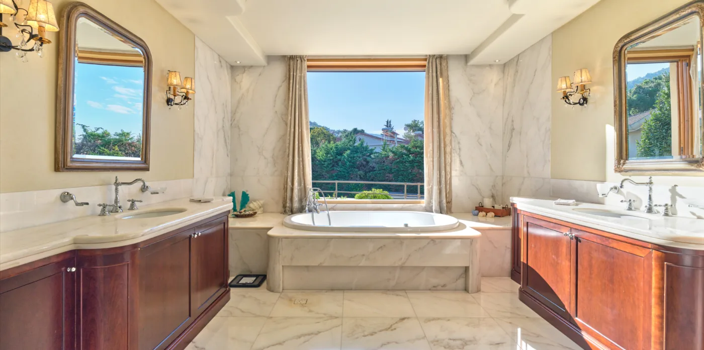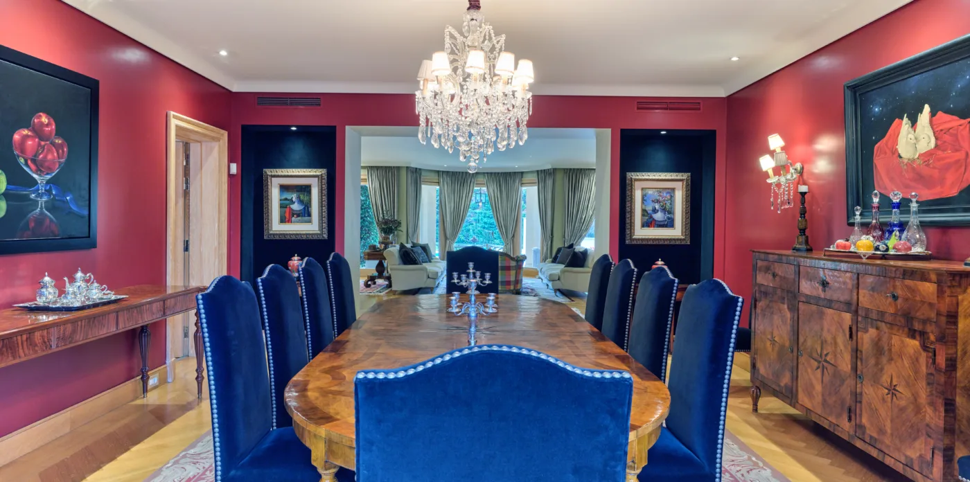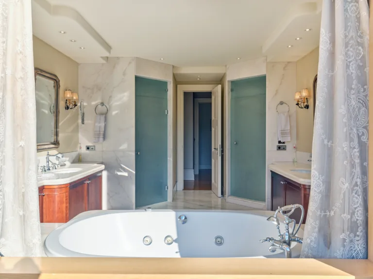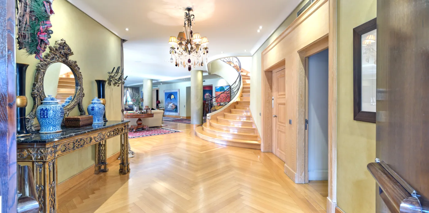 Η πρώτη κατοικία, που καλύπτει 1.021 τετραγωνικά μέτρα, ακτινοβολεί εκλέπτυνση. Το ισόγειο διαθέτει δύο ευρύχωρα καθιστικά που ενισχύονται από ένα τζάκι, μια τραπεζαρία, ένα γραφείο και μια κουζίνα. Στον επάνω όροφο, ένα ήσυχο καθιστικό συμπληρώνει τη σουίτα του ιδιοκτήτη με θέα στην πισίνα, η οποία συνοδεύεται από τρία υπνοδωμάτια με ιδιωτικό μπάνιο.