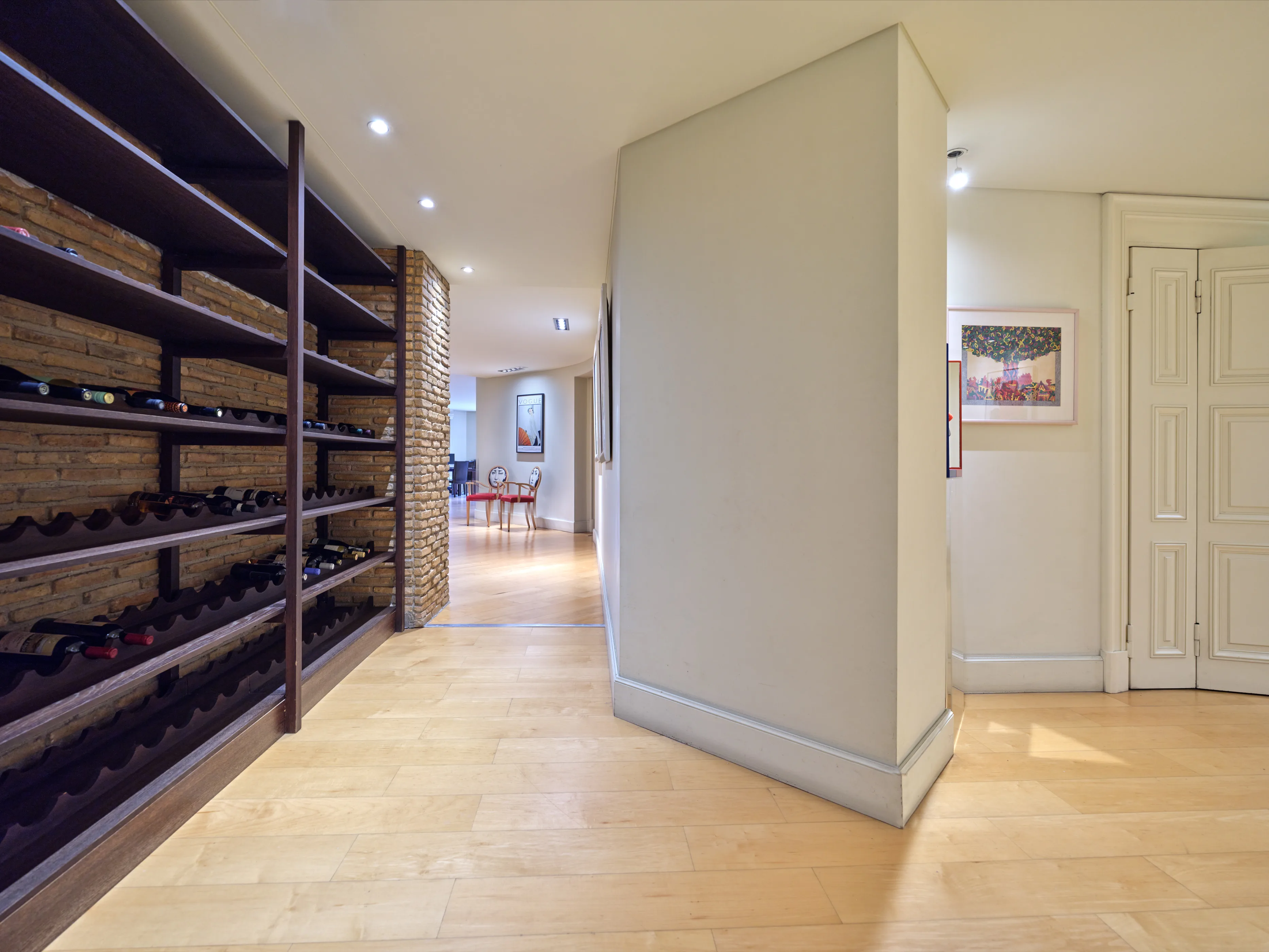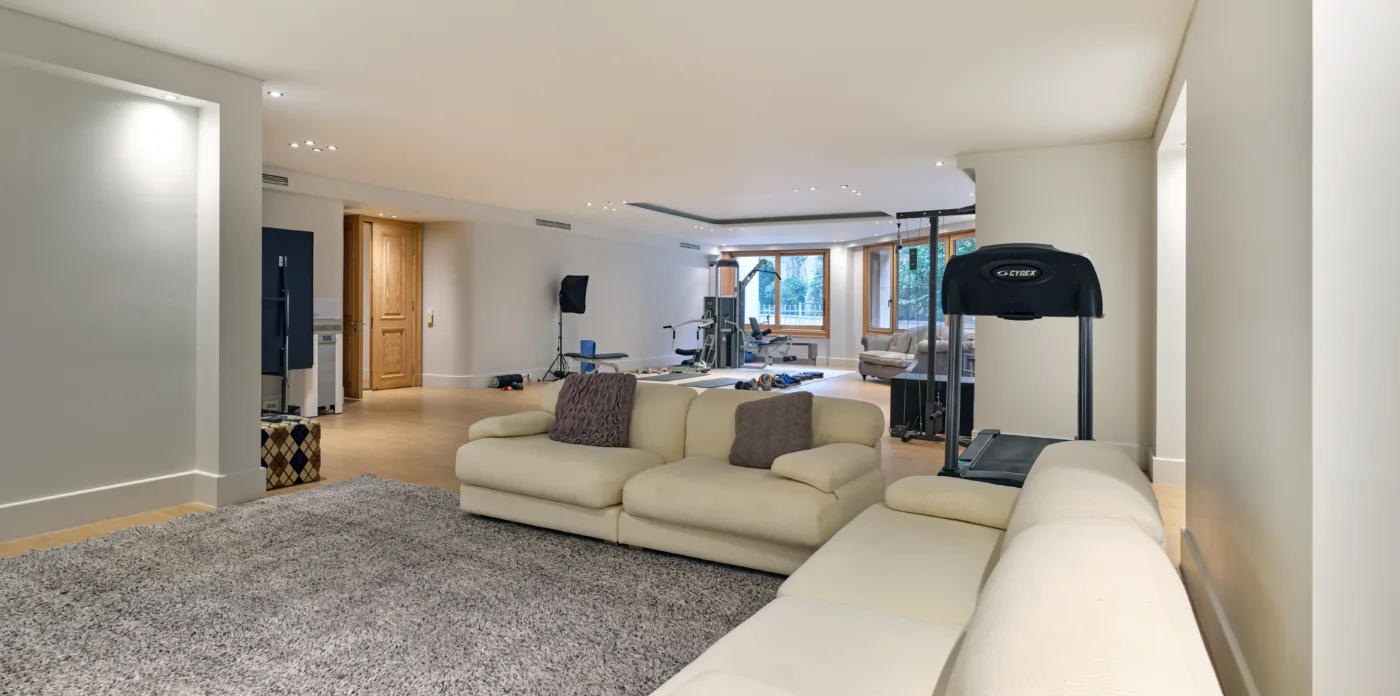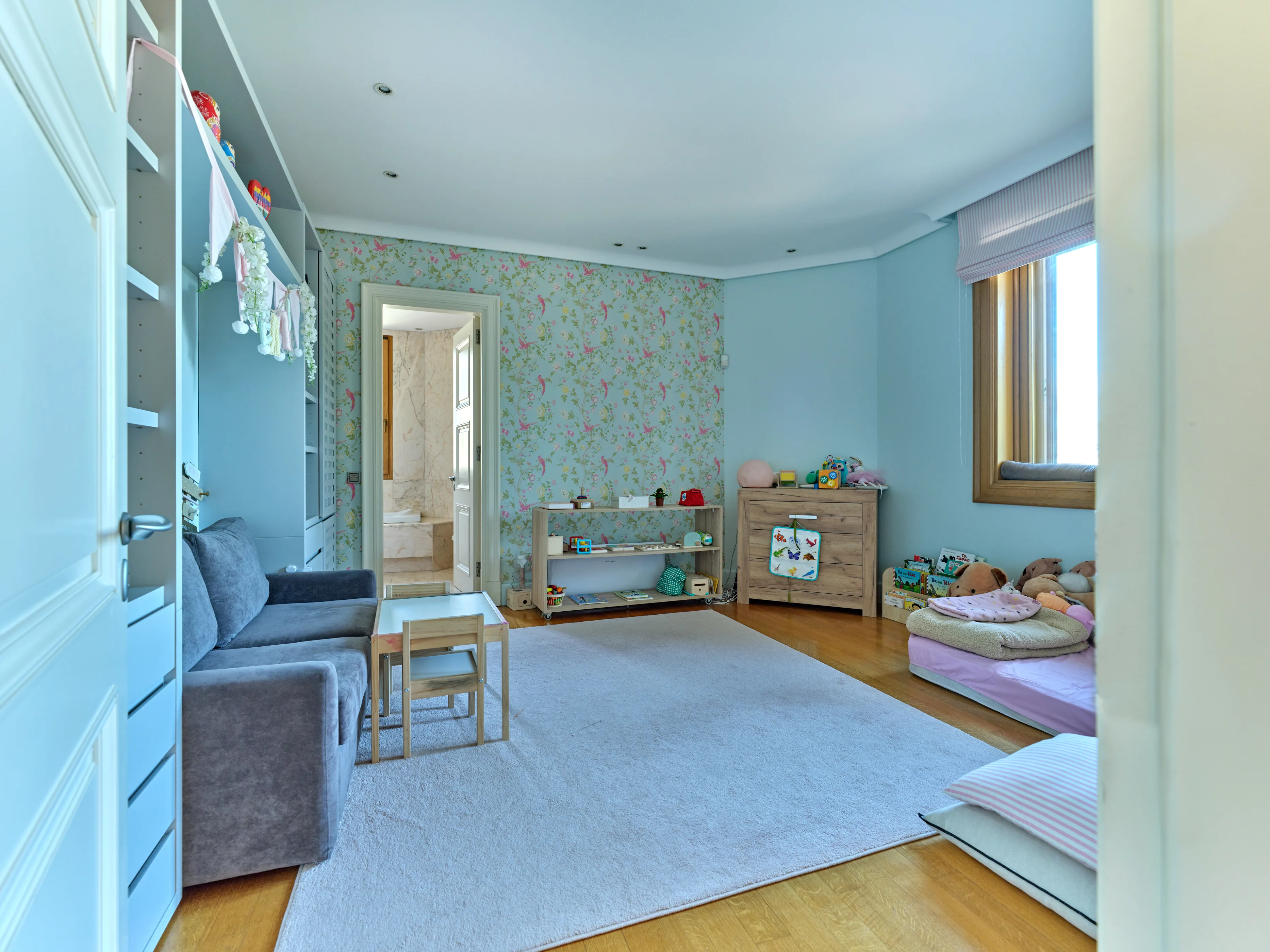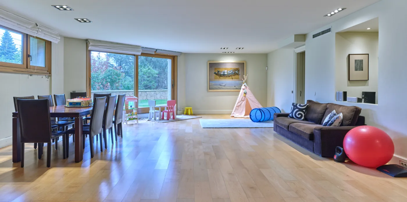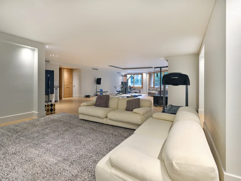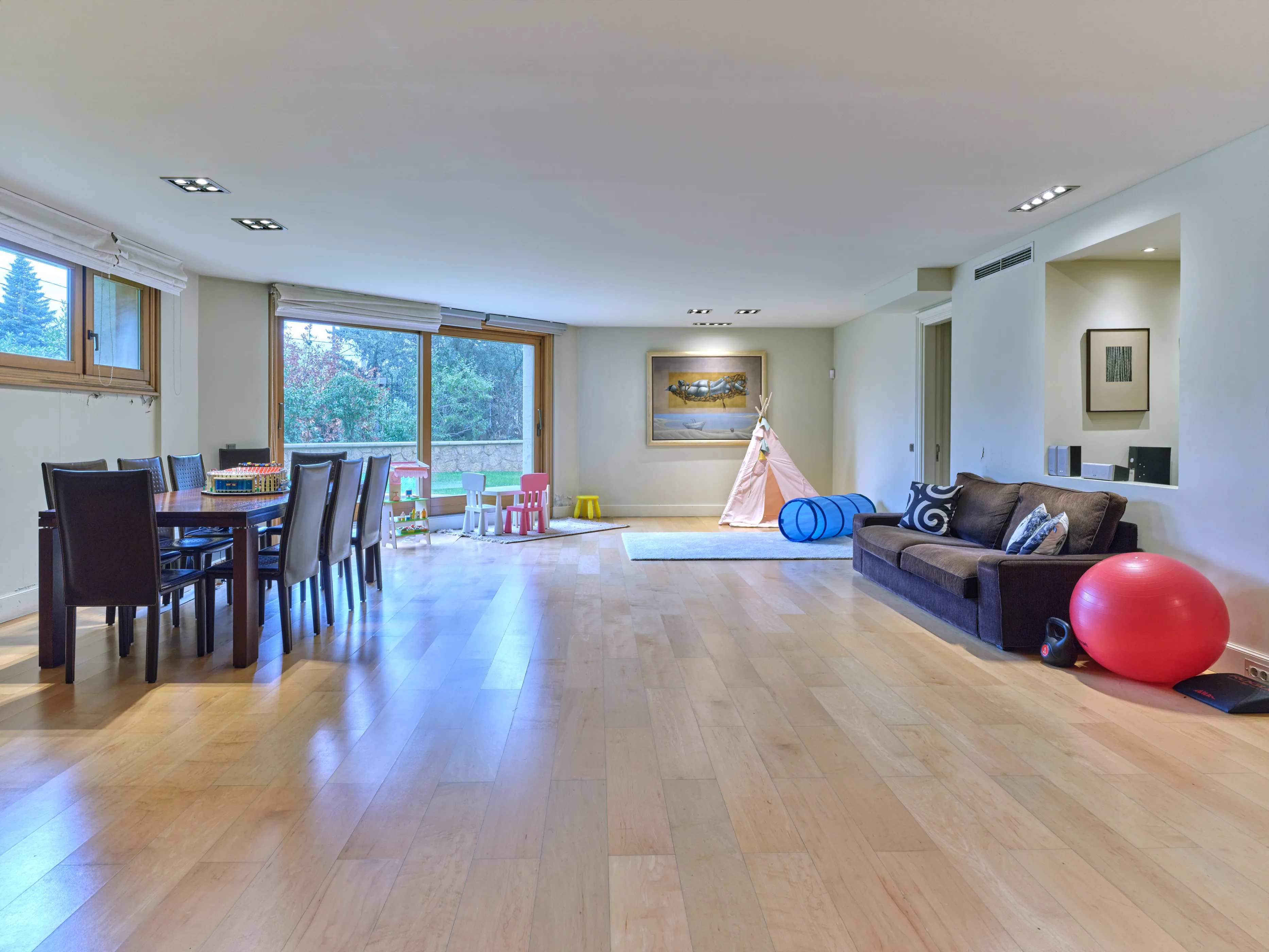 Στο κάτω επίπεδο υπάρχει ένα playroom με πρόσβαση στον κήπο, μια επιπλέον τραπεζαρία και μια κουζίνα με πλυντήριο. Υπάρχει επίσης ένα μπάνιο, ένα δωμάτιο οικονόμου και άνετος χώρος στάθμευσης για 2-3 οχήματα. Ένας ανελκυστήρας συνδέει αβίαστα κάθε όροφο.