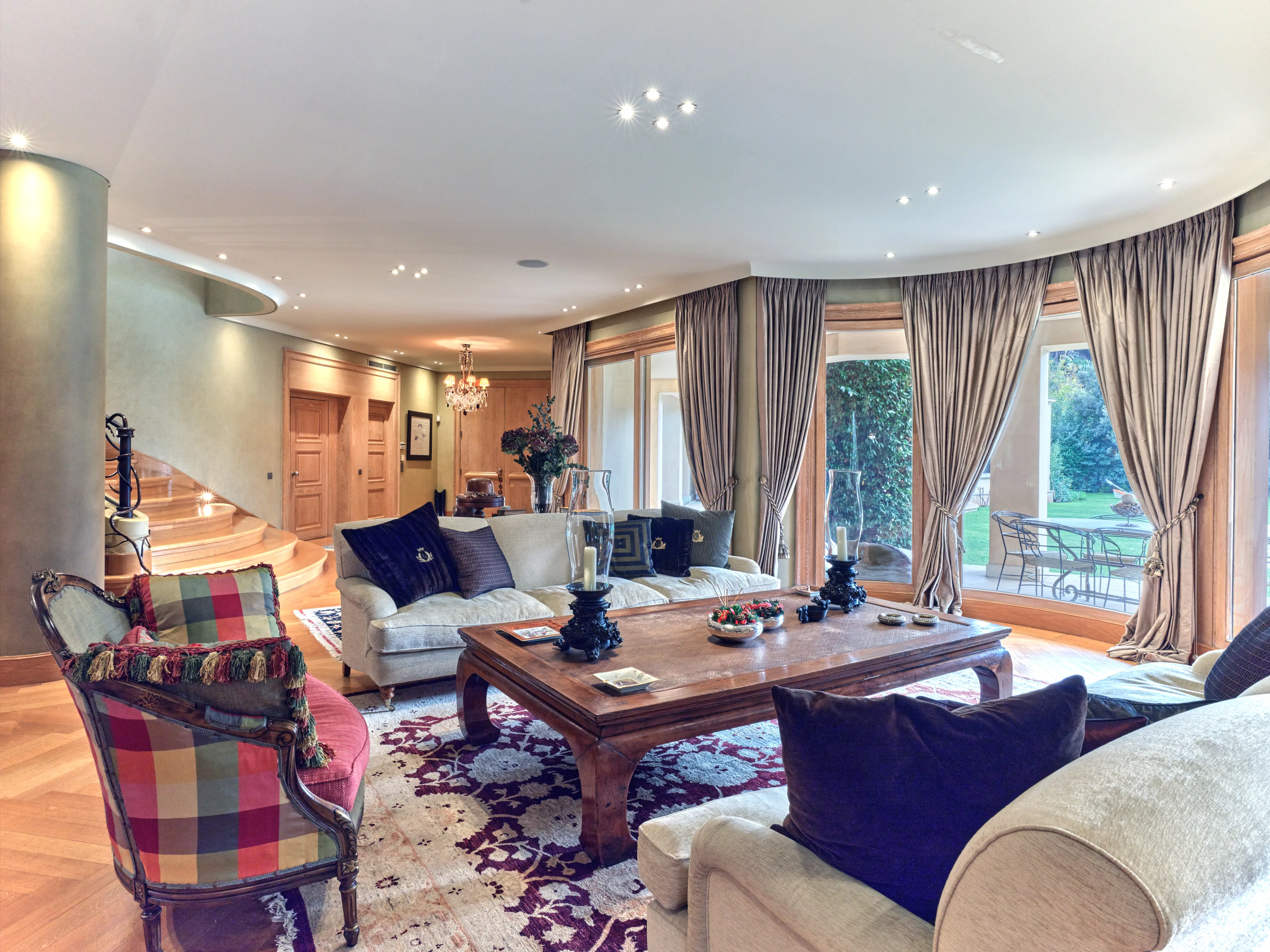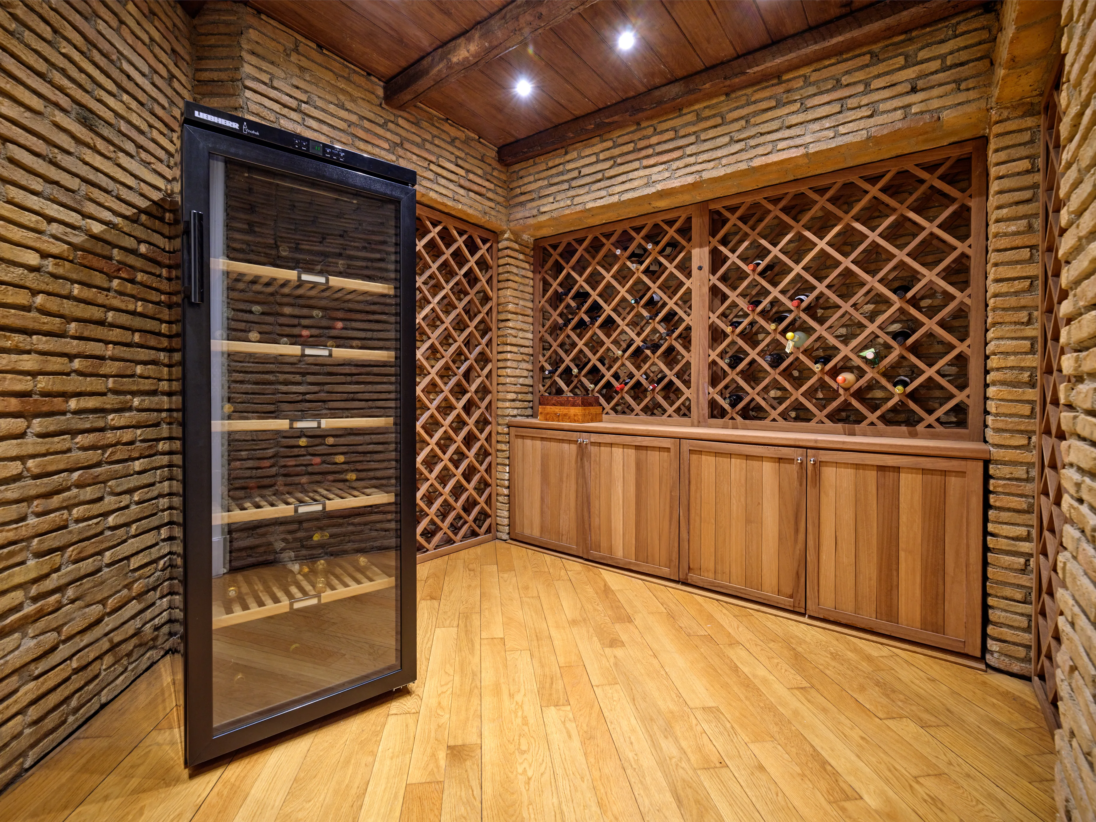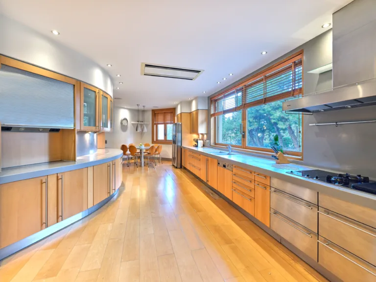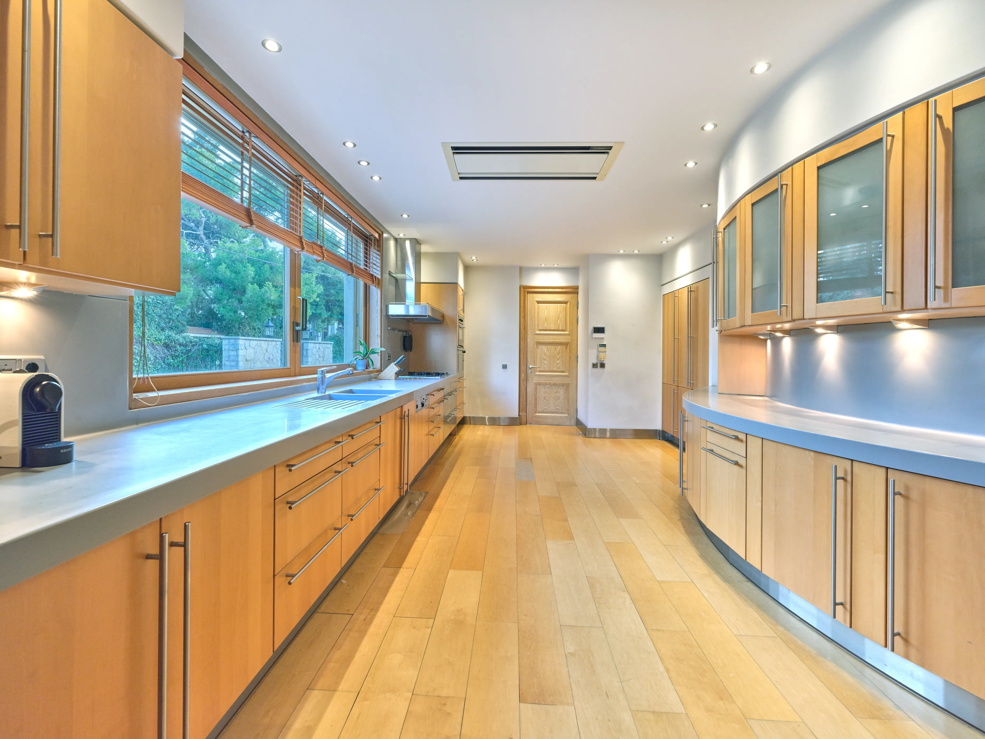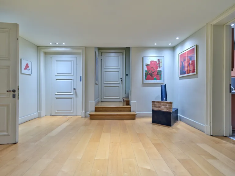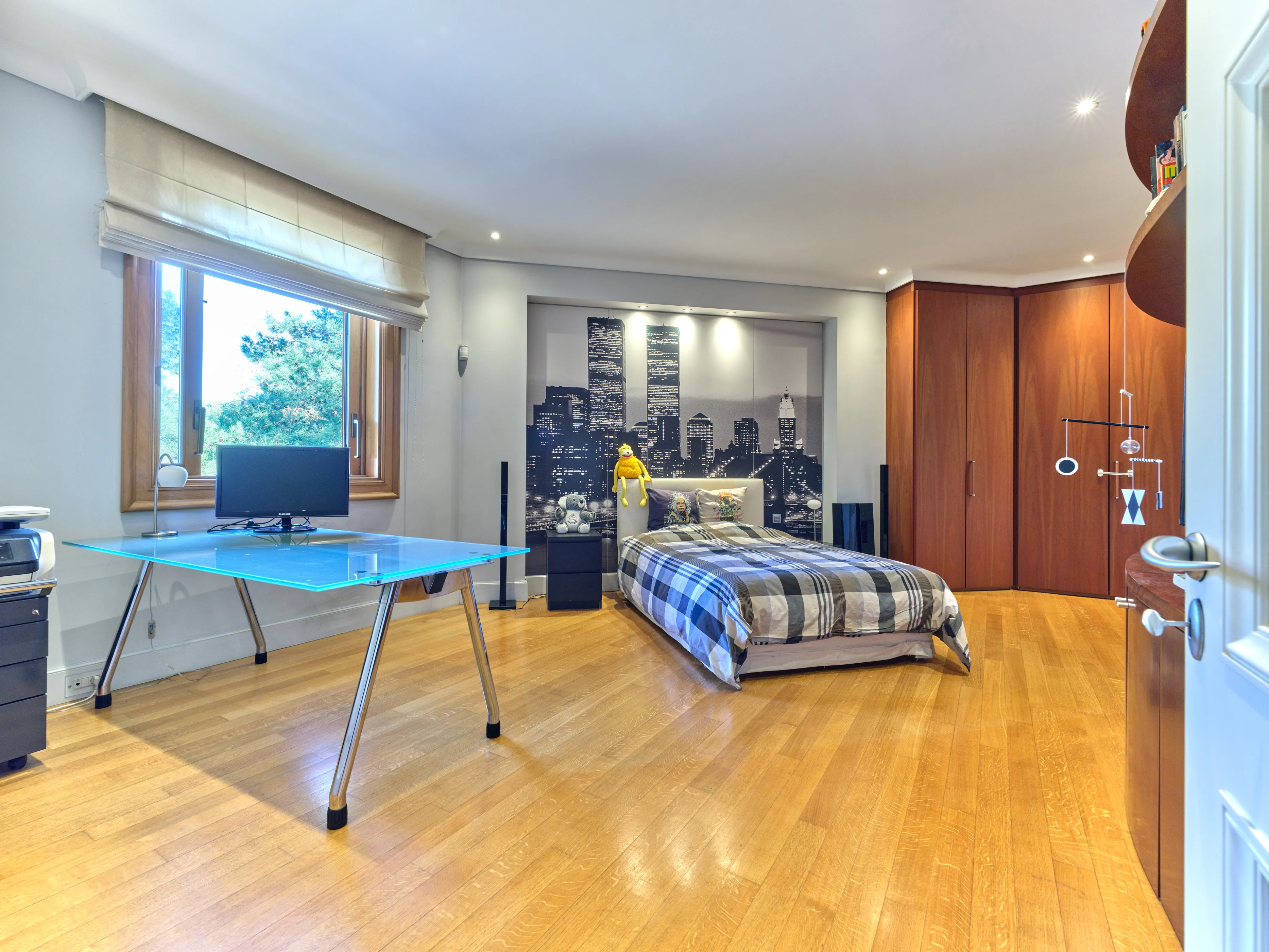 Στο κάτω επίπεδο υπάρχει ένα playroom με πρόσβαση στον κήπο, μια επιπλέον τραπεζαρία και μια κουζίνα με πλυντήριο. Υπάρχει επίσης ένα μπάνιο, ένα δωμάτιο οικονόμου και άνετος χώρος στάθμευσης για 2-3 οχήματα. Ένας ανελκυστήρας συνδέει αβίαστα κάθε όροφο.