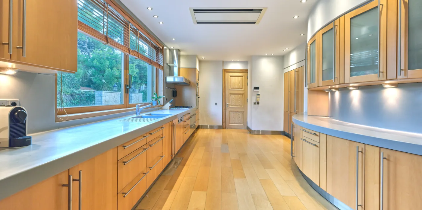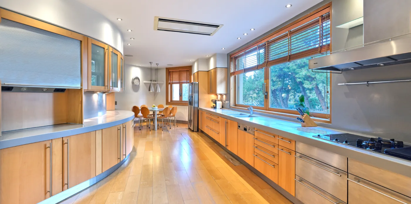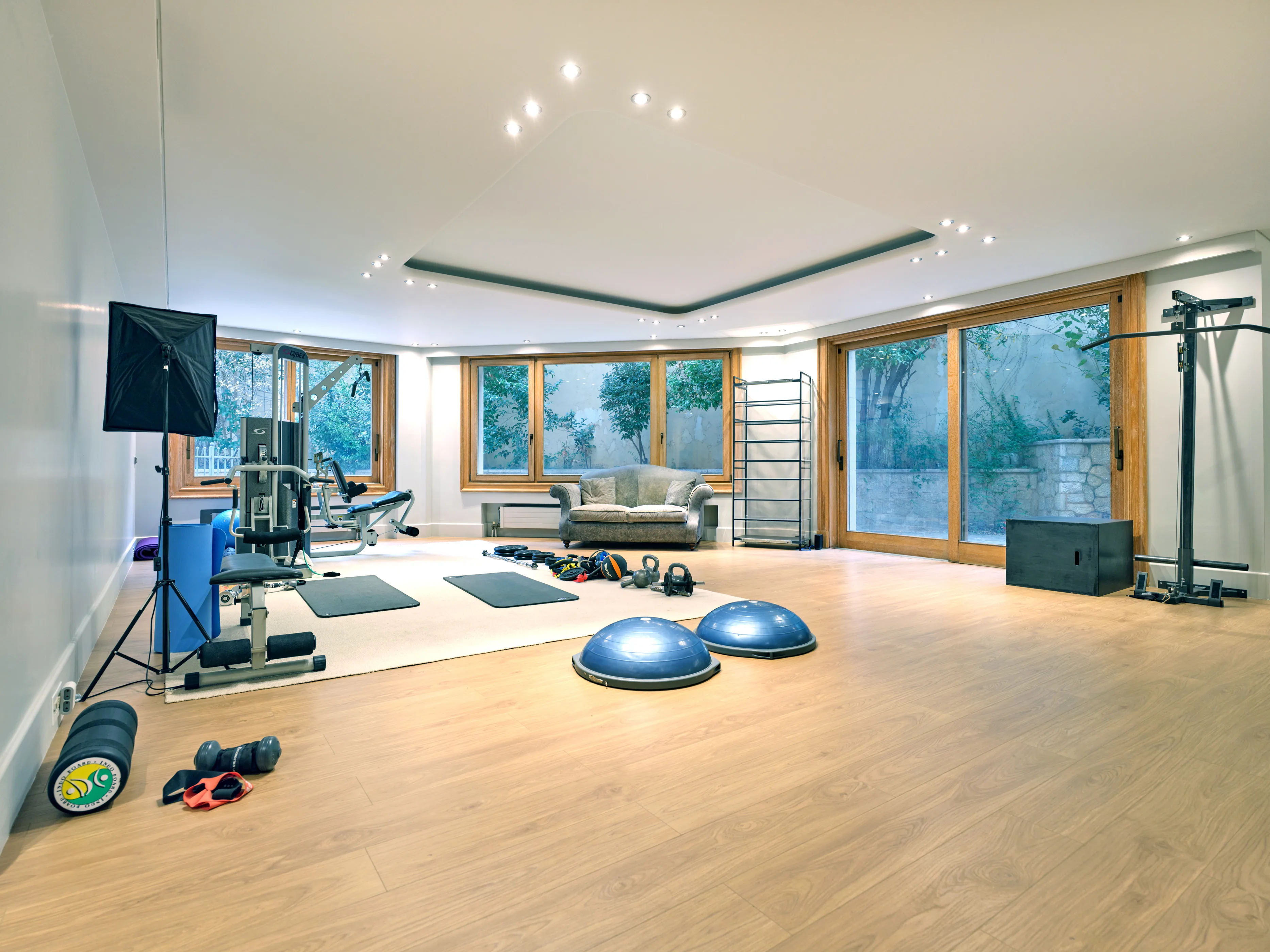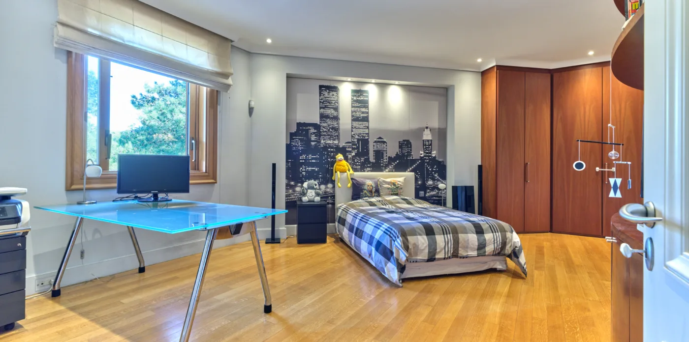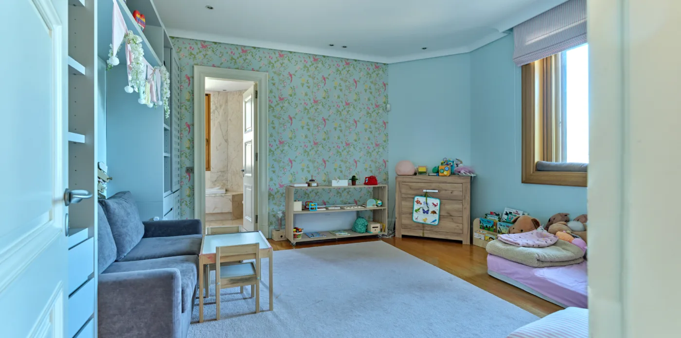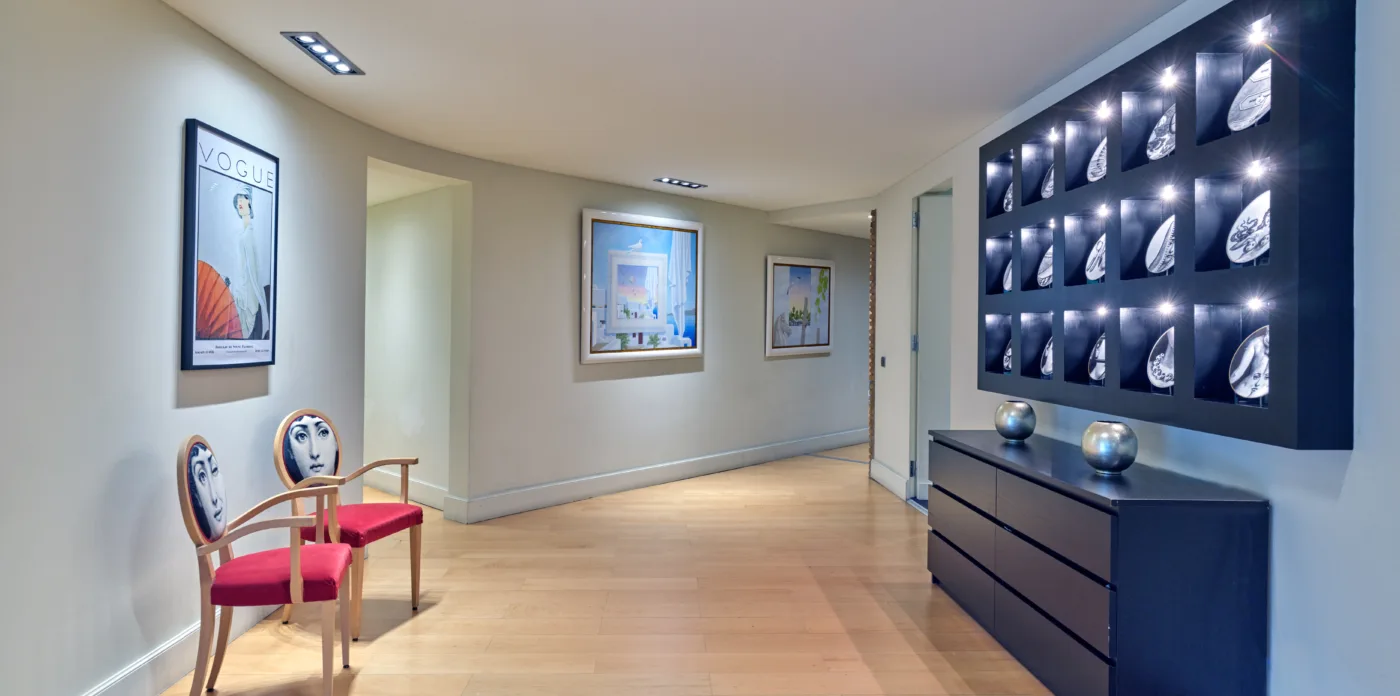 Στο κάτω επίπεδο υπάρχει ένα playroom με πρόσβαση στον κήπο, μια επιπλέον τραπεζαρία και μια κουζίνα με πλυντήριο. Υπάρχει επίσης ένα μπάνιο, ένα δωμάτιο οικονόμου και άνετος χώρος στάθμευσης για 2-3 οχήματα. Ένας ανελκυστήρας συνδέει αβίαστα κάθε όροφο.