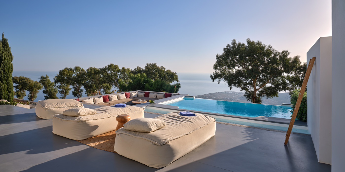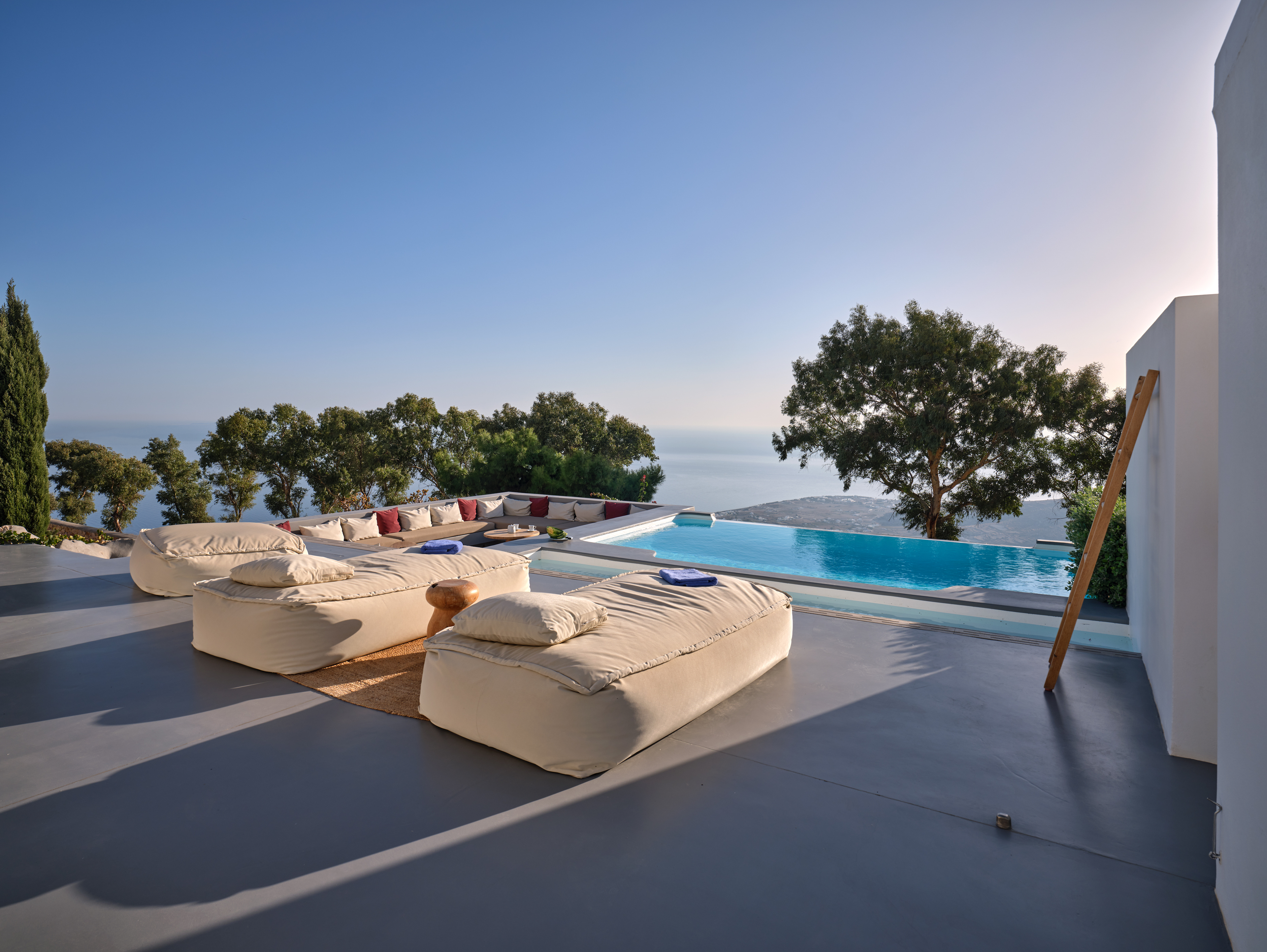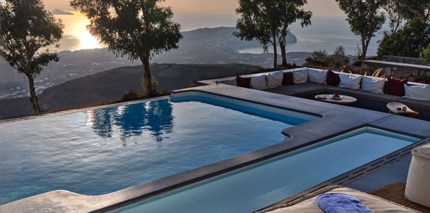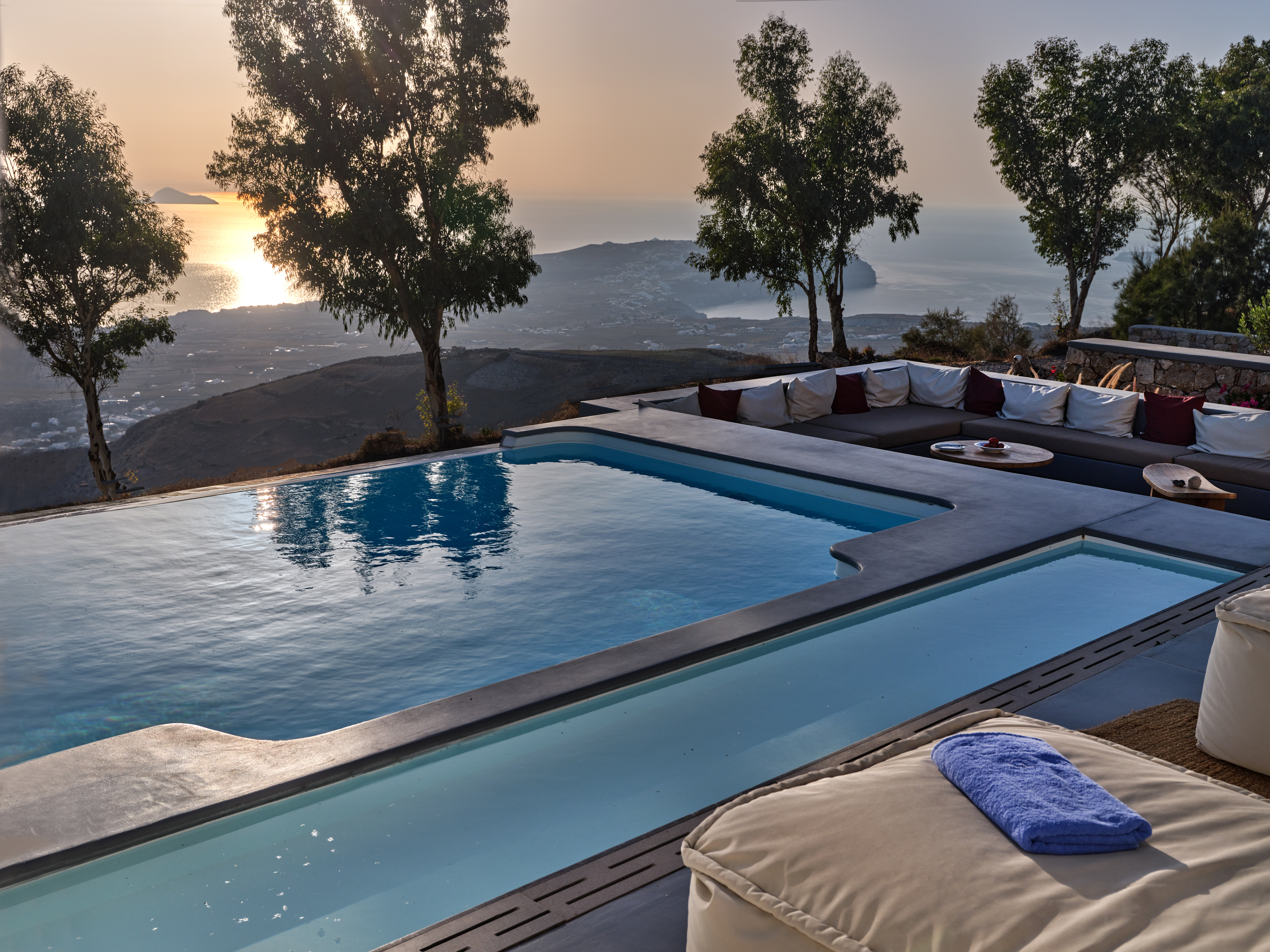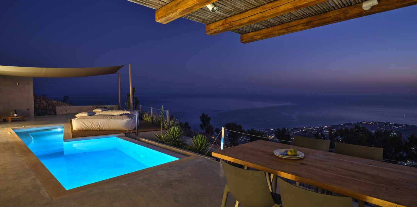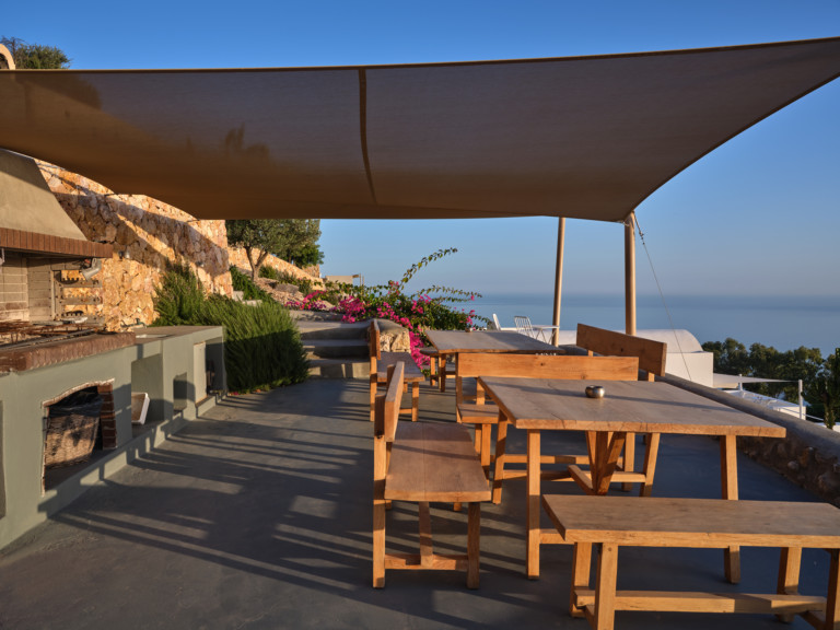 Η θερμαινόμενη πισίνα υπερχείλισης στη βεράντα της βίλας και η σκιερή τραπεζαρία προσφέρουν εκπληκτική θέα στη Σαντορίνη και το Αιγαίο Πέλαγος.