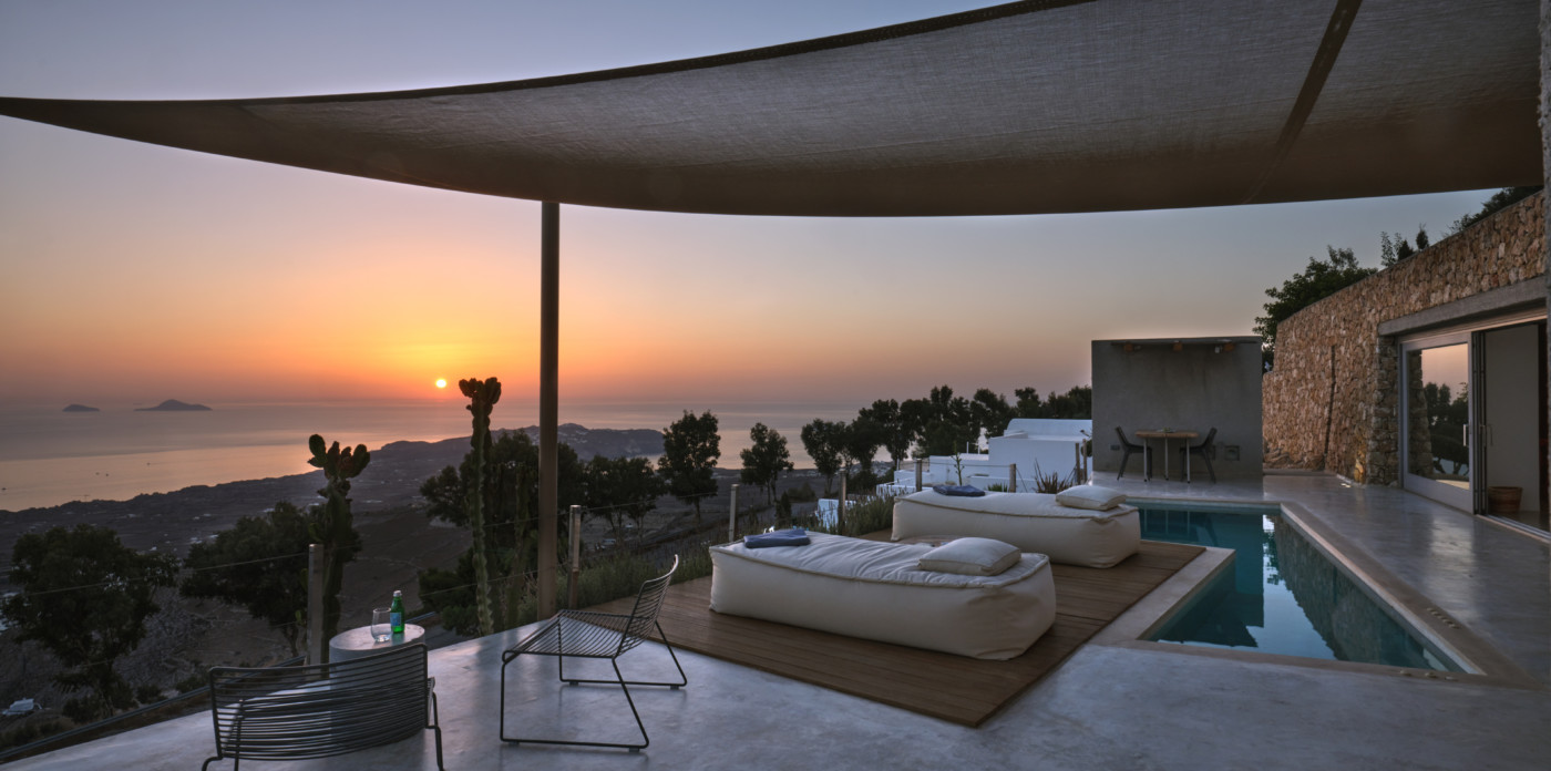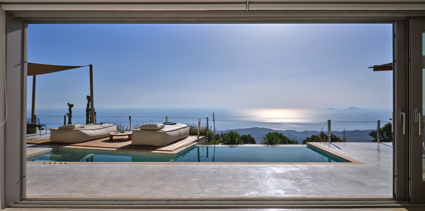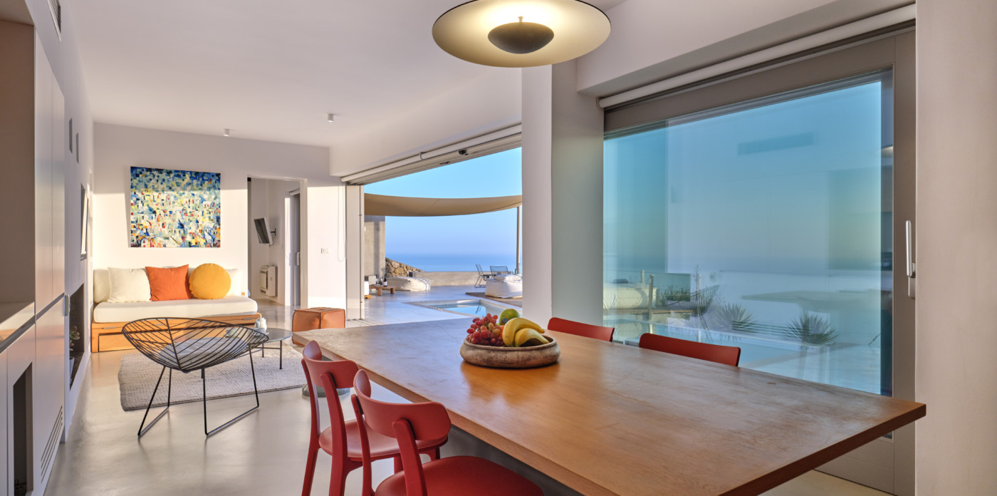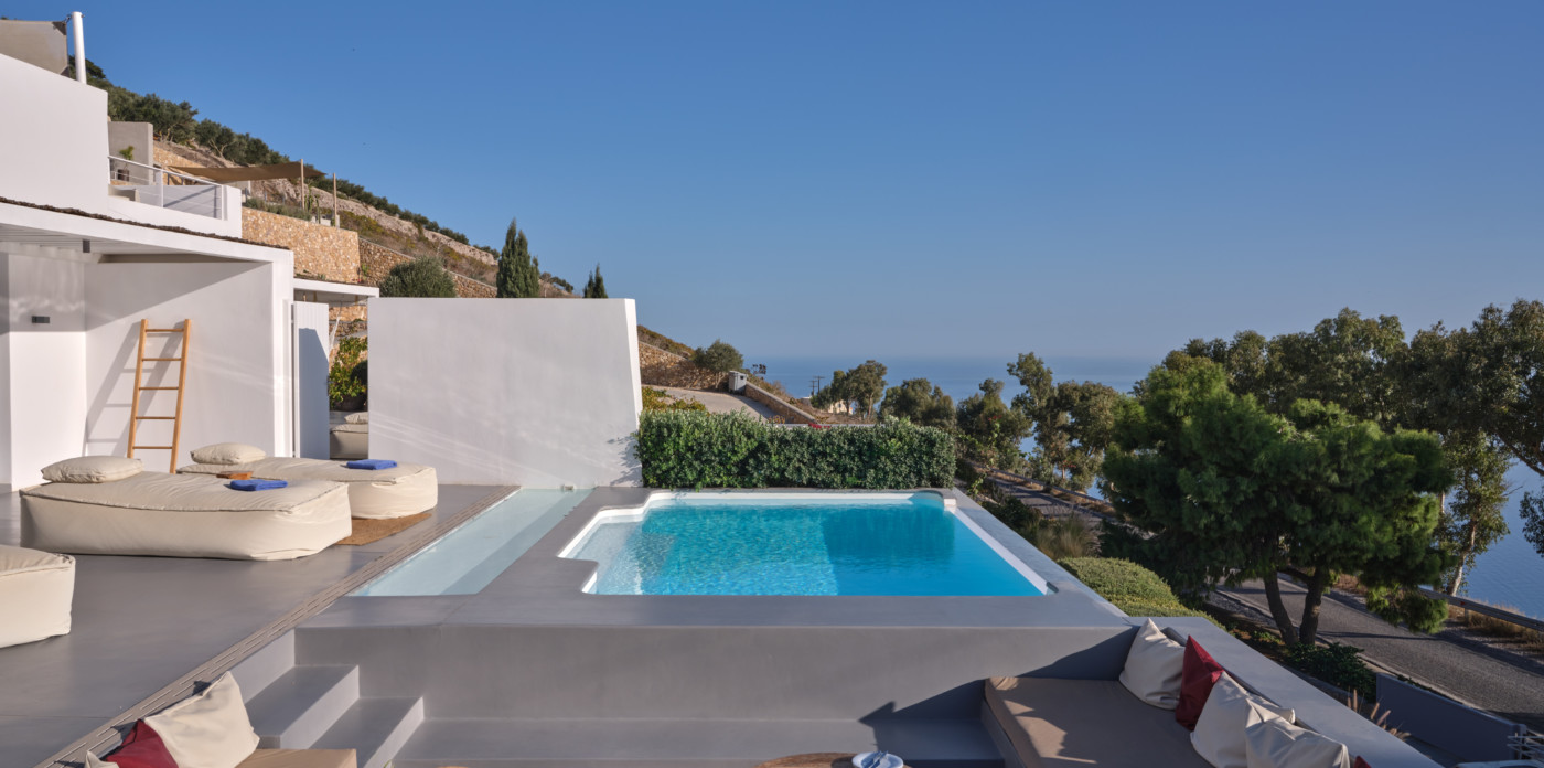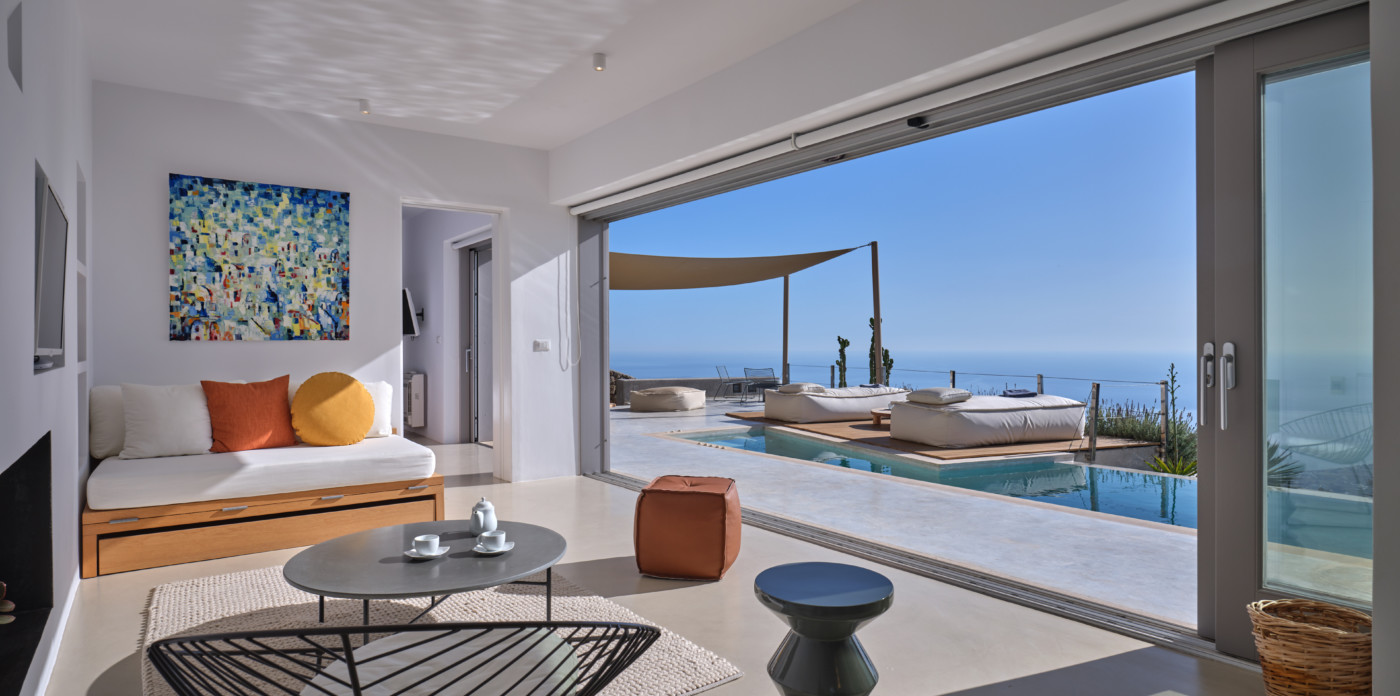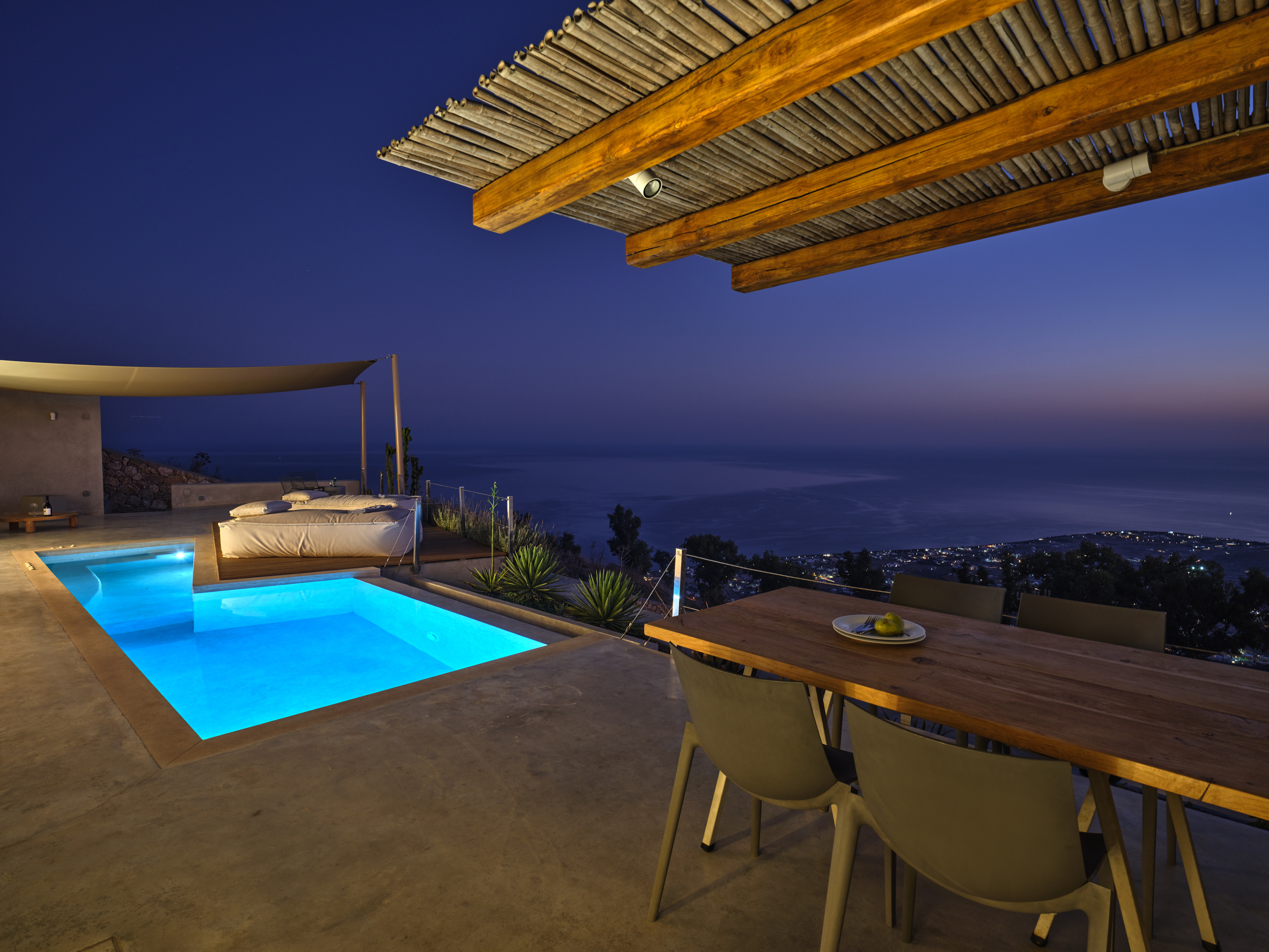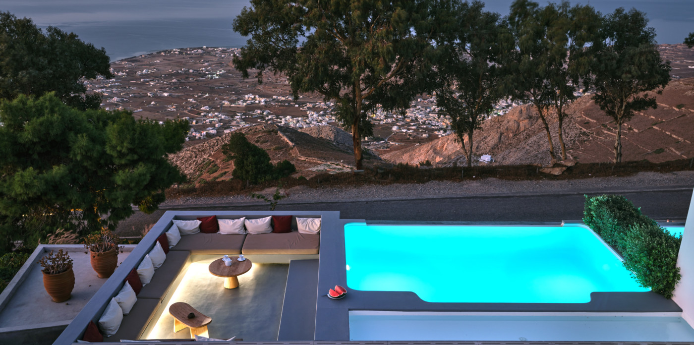 Η θερμαινόμενη πισίνα υπερχείλισης στη βεράντα της βίλας και η σκιερή τραπεζαρία προσφέρουν εκπληκτική θέα στη Σαντορίνη και το Αιγαίο Πέλαγος.