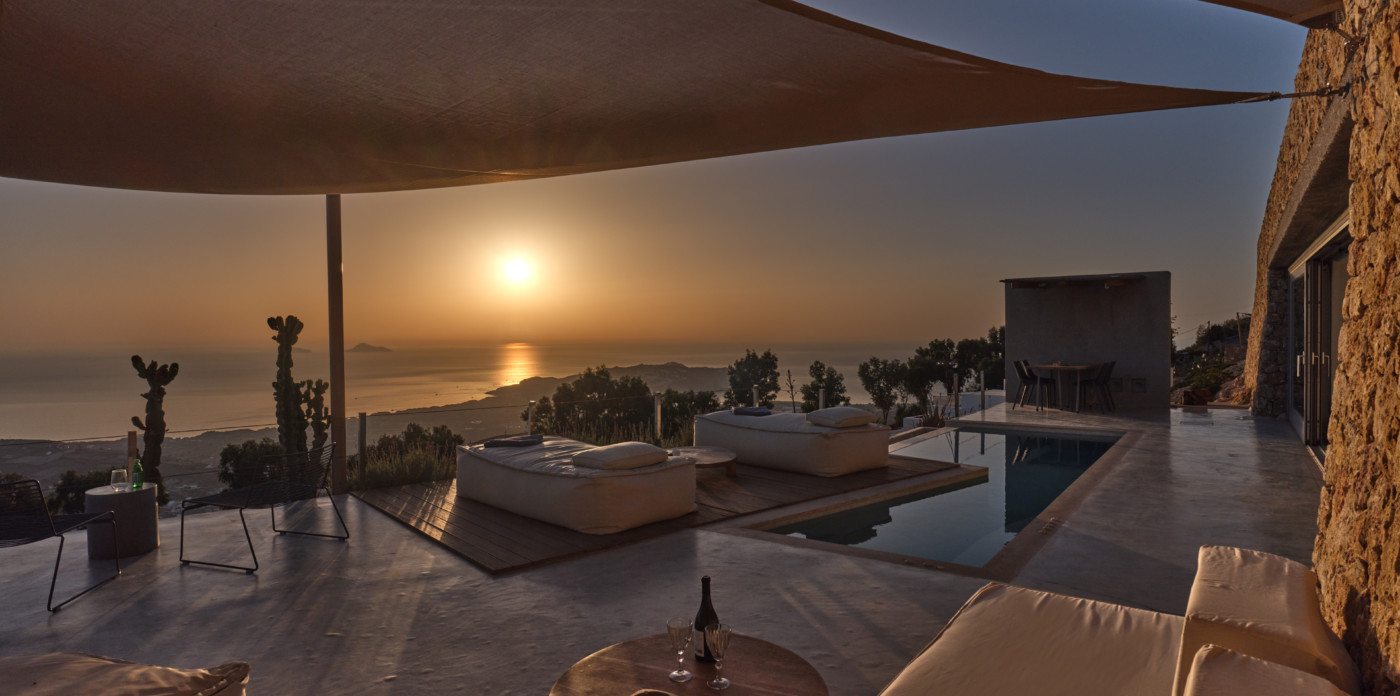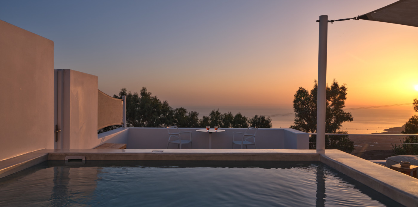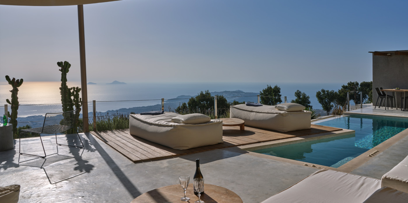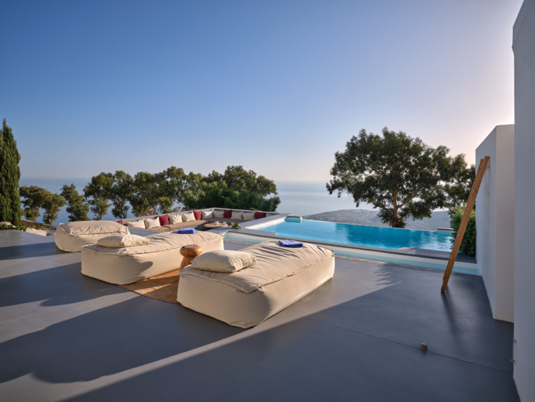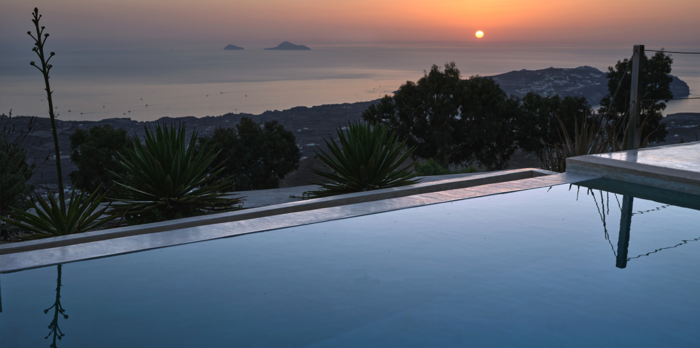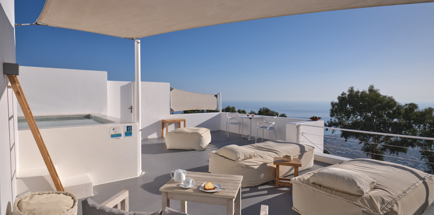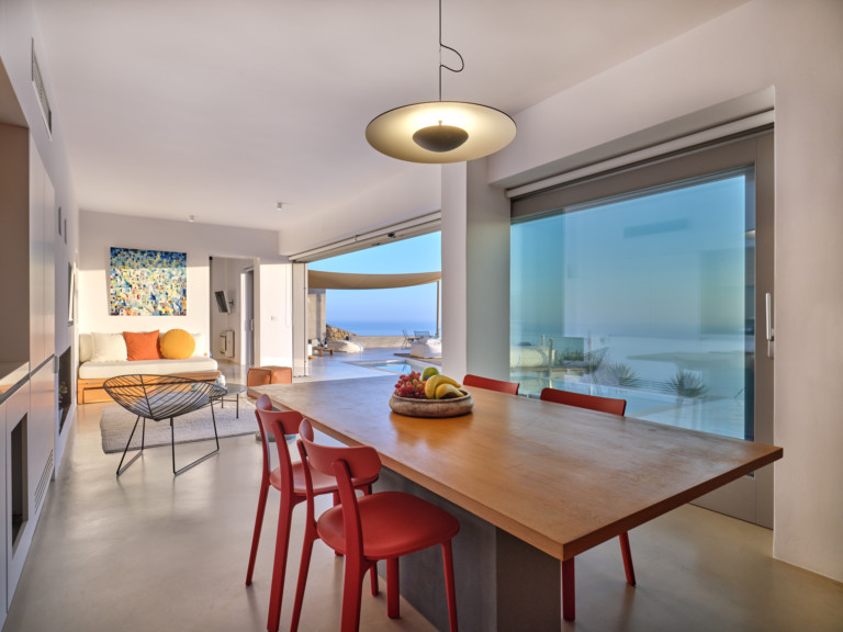 Η θερμαινόμενη πισίνα υπερχείλισης στη βεράντα της βίλας και η σκιερή τραπεζαρία προσφέρουν εκπληκτική θέα στη Σαντορίνη και το Αιγαίο Πέλαγος.