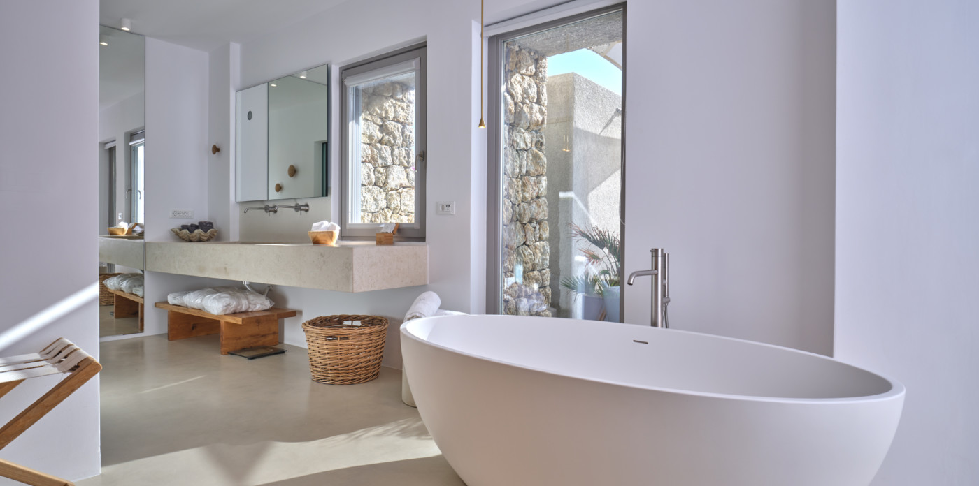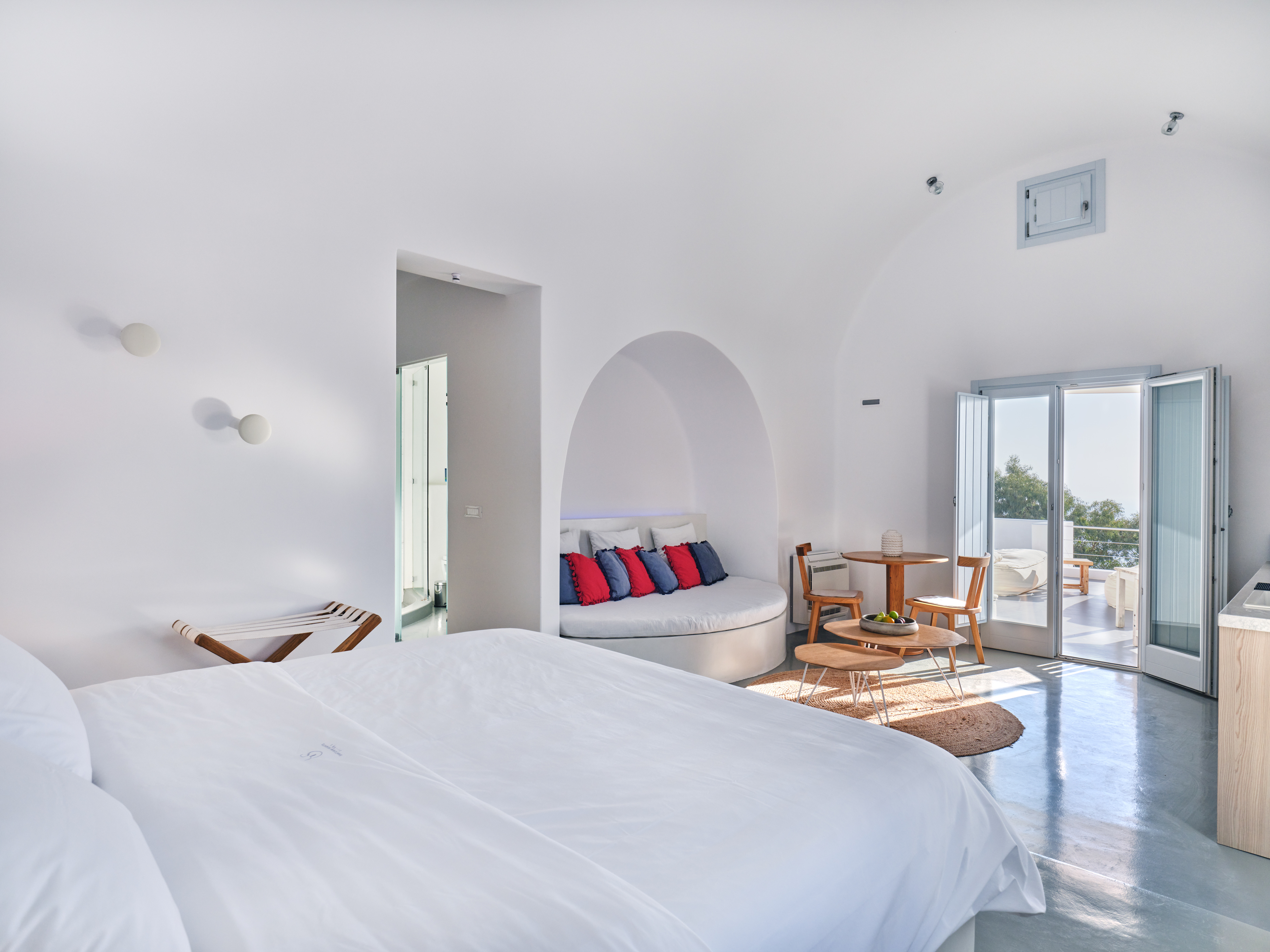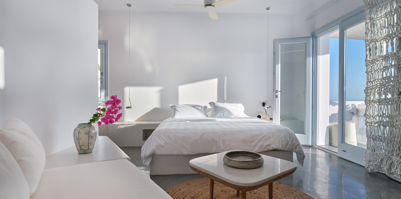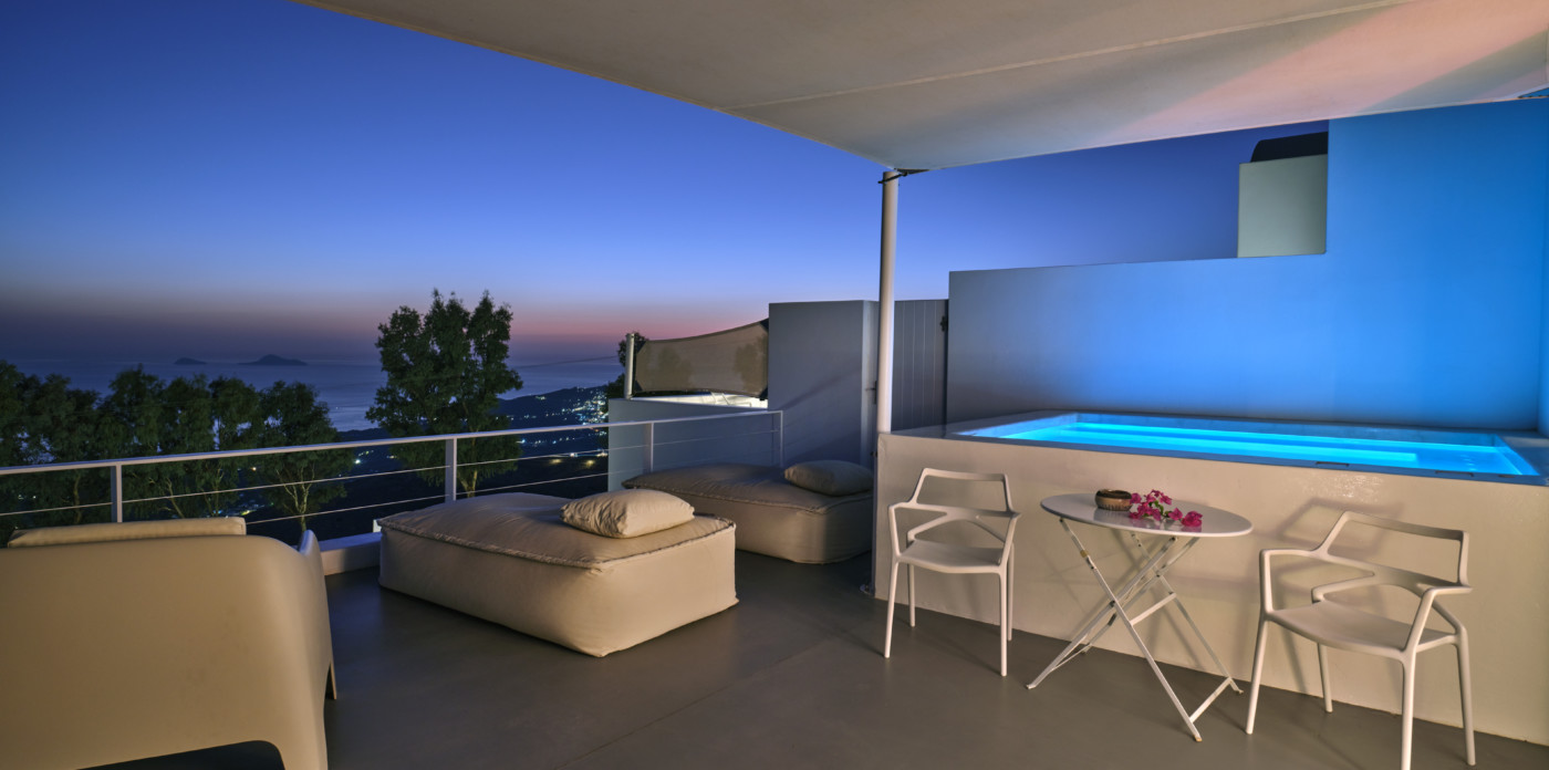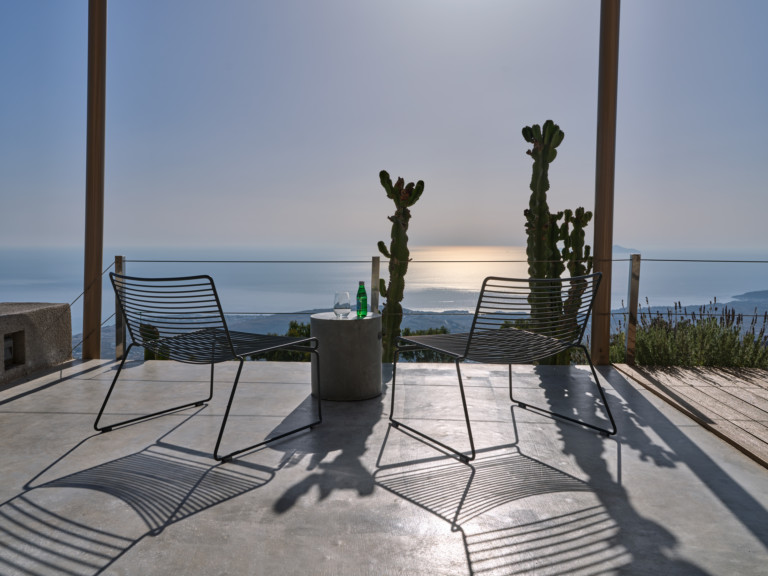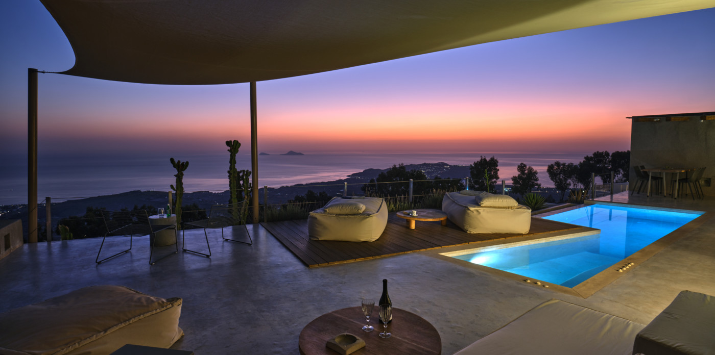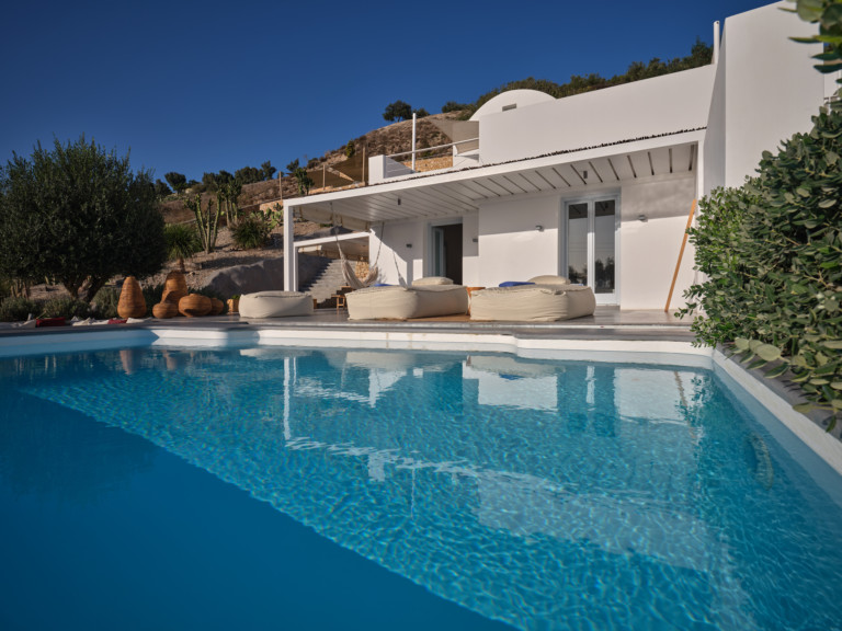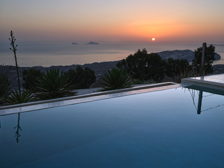 Η θερμαινόμενη πισίνα υπερχείλισης στη βεράντα της βίλας και η σκιερή τραπεζαρία προσφέρουν εκπληκτική θέα στη Σαντορίνη και το Αιγαίο Πέλαγος.