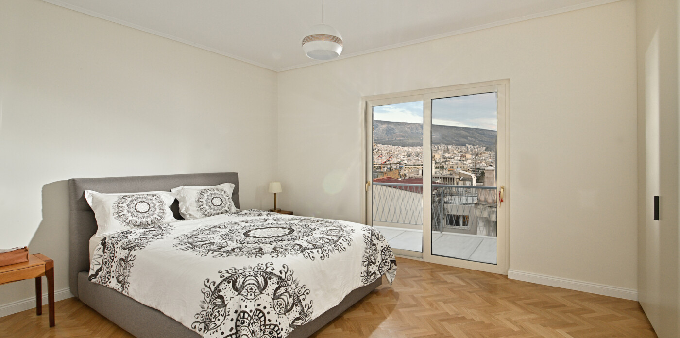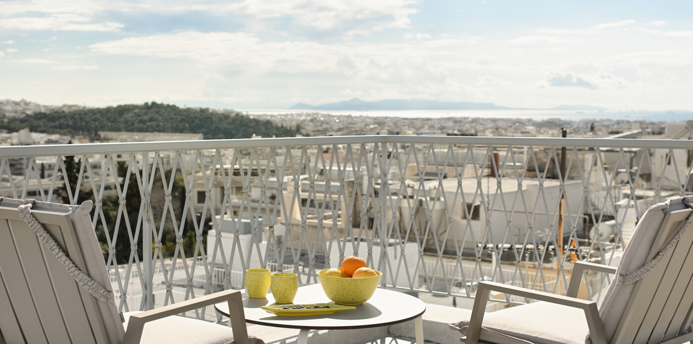 Το ανώτερο επίπεδο, στο οποίο οδηγεί μια μαρμάρινη σκάλα, παρέχει έναν ευέλικτο χώρο με δικό του μπάνιο, που μπορεί να χρησιμοποιηθεί ως γραφείο, σουίτα επισκεπτών ή πρόσθετο υπνοδωμάτιο. Αυτό το επίπεδο επεκτείνεται σε μια γενναιόδωρη ιδιωτική βεράντα στην ταράτσα, με πανοραμική θέα στην πόλη και παρέχοντας έναν εξαιρετικό χώρο για χαλάρωση, φαγητό ή διασκέδαση κάτω από τον αθηναϊκό ουρανό.