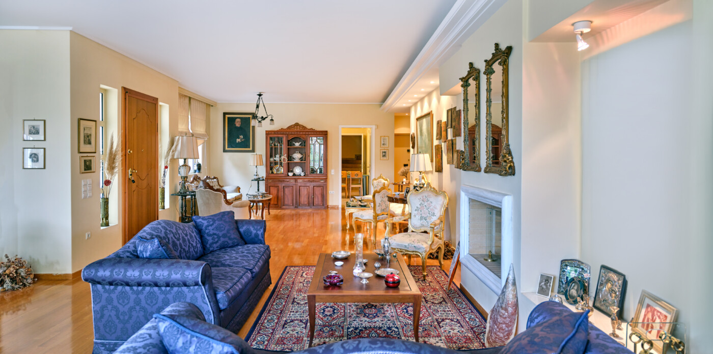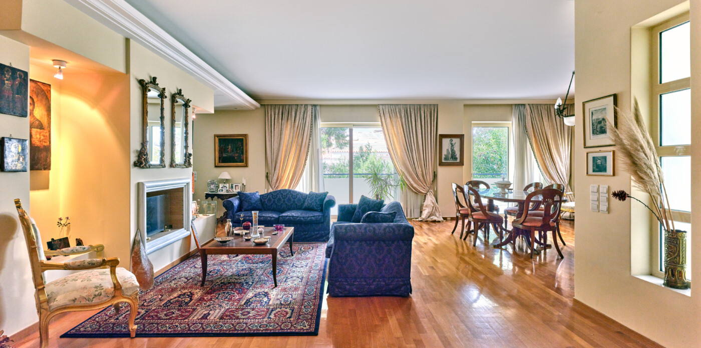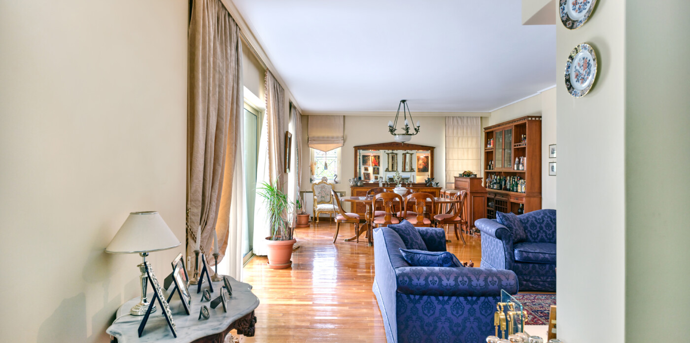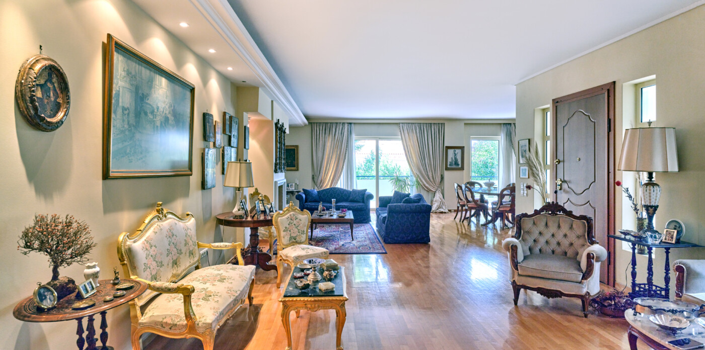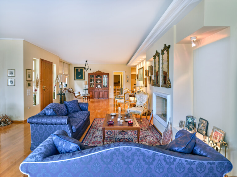 Το εσωτερικό του διαμερίσματος είναι προσεκτικά σχεδιασμένο, με εκτεταμένους και όμορφα διαμορφωμένους χώρους υποδοχής. Η διαρρύθμιση σε ενιαίο χώρο περιλαμβάνει ένα ευρύχωρο καθιστικό με ένα γοητευτικό τζάκι, μια επίσημη τραπεζαρία και ένα πρόσθετο καθιστικό, τα οποία συνδέονται αρμονικά μεταξύ τους για να δημιουργήσουν μια ζεστή και φιλόξενη ατμόσφαιρα. Ένα βολικά τοποθετημένο μπάνιο επισκεπτών ενισχύει περαιτέρω την άνεση και την πρακτικότητα αυτού του χώρου διαβίωσης.