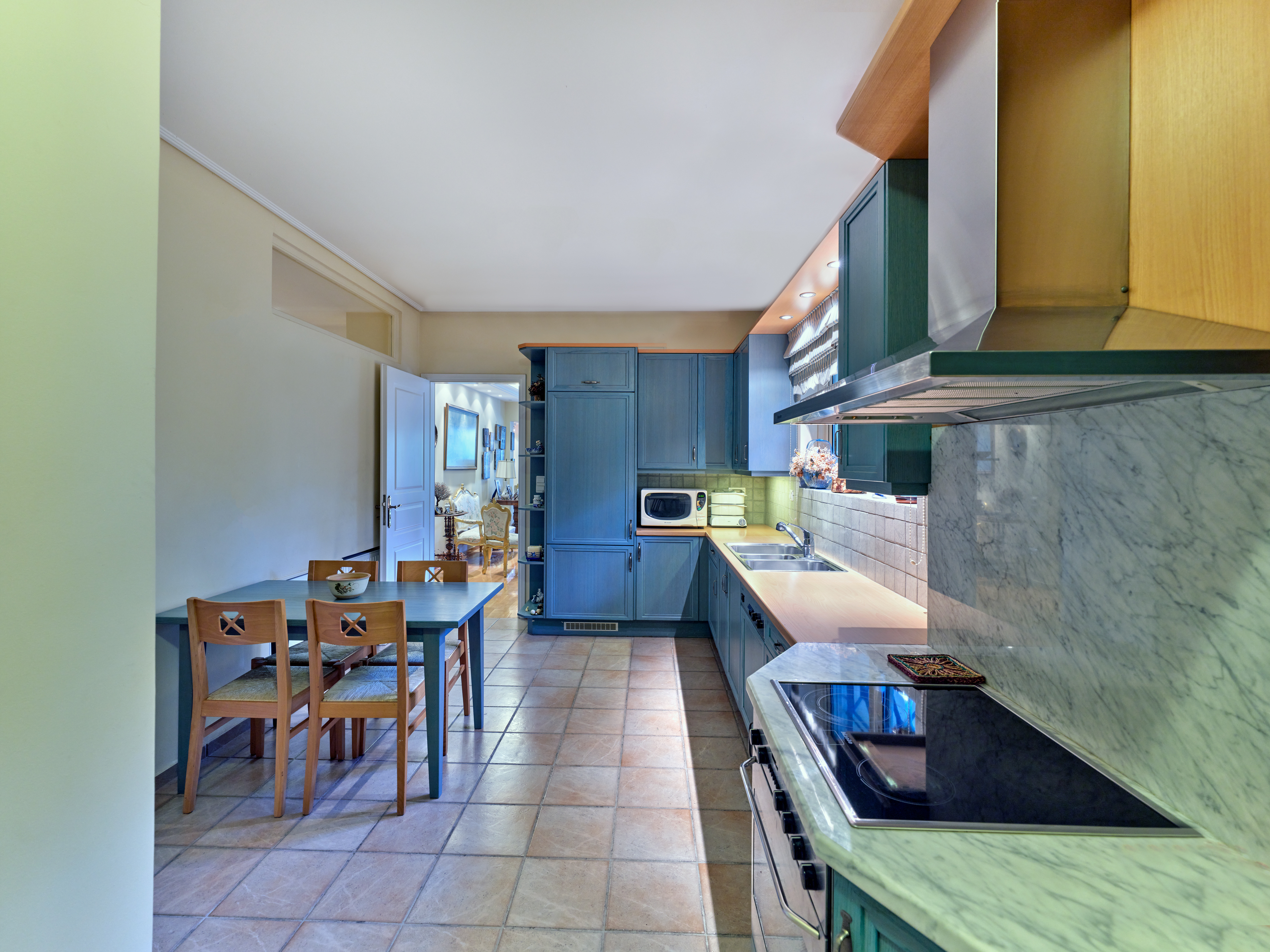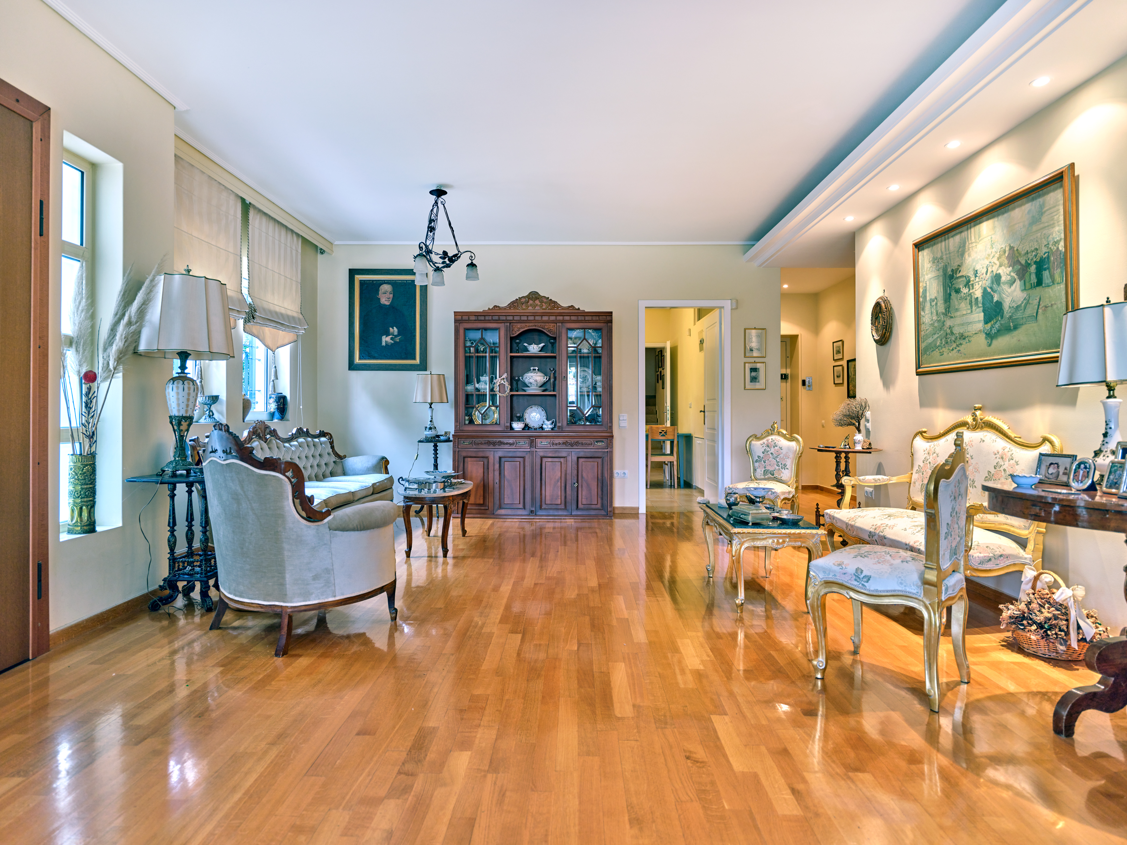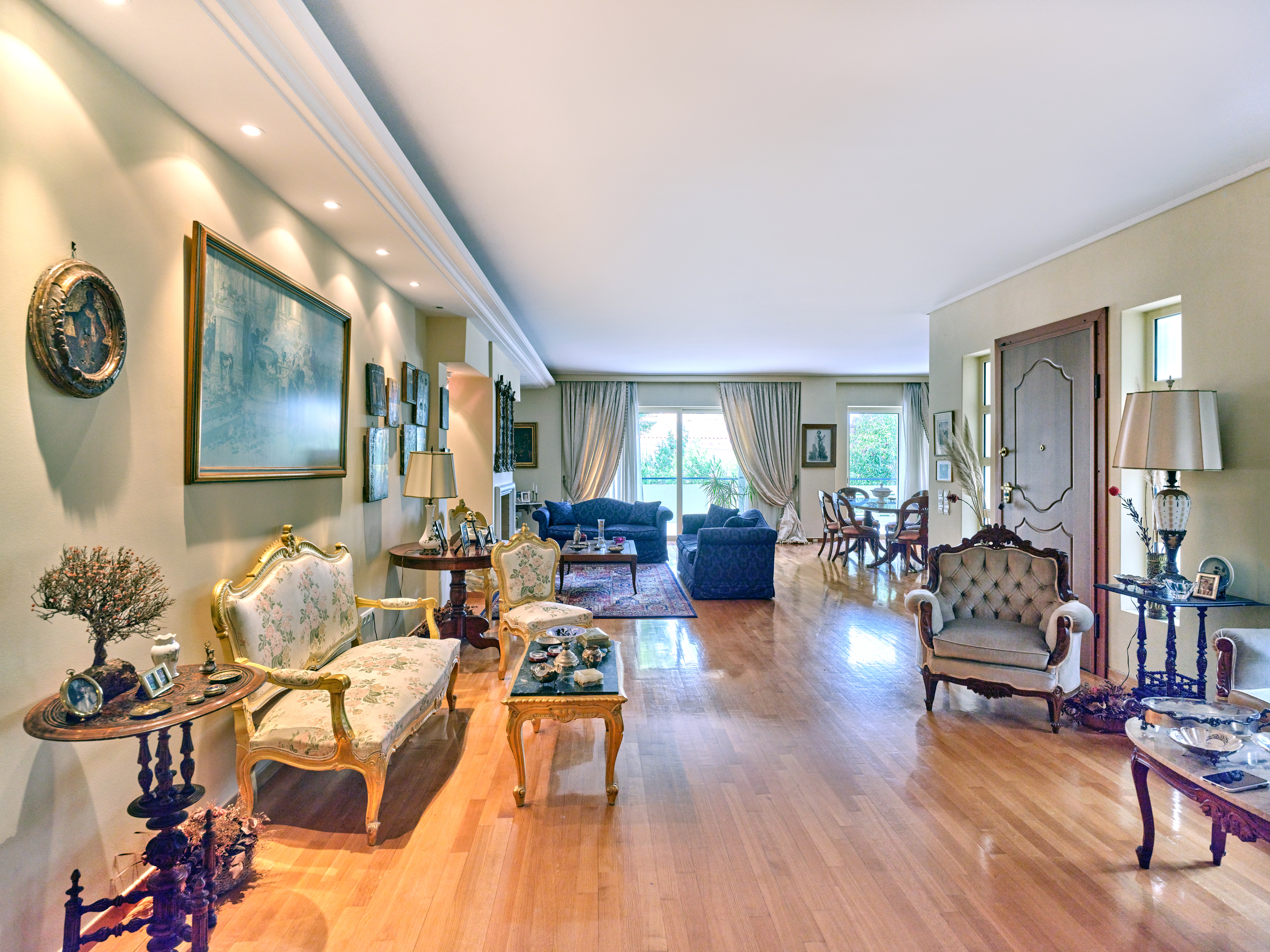 Το εσωτερικό του διαμερίσματος είναι προσεκτικά σχεδιασμένο, με εκτεταμένους και όμορφα διαμορφωμένους χώρους υποδοχής. Η διαρρύθμιση σε ενιαίο χώρο περιλαμβάνει ένα ευρύχωρο καθιστικό με ένα γοητευτικό τζάκι, μια επίσημη τραπεζαρία και ένα πρόσθετο καθιστικό, τα οποία συνδέονται αρμονικά μεταξύ τους για να δημιουργήσουν μια ζεστή και φιλόξενη ατμόσφαιρα. Ένα βολικά τοποθετημένο μπάνιο επισκεπτών ενισχύει περαιτέρω την άνεση και την πρακτικότητα αυτού του χώρου διαβίωσης.
