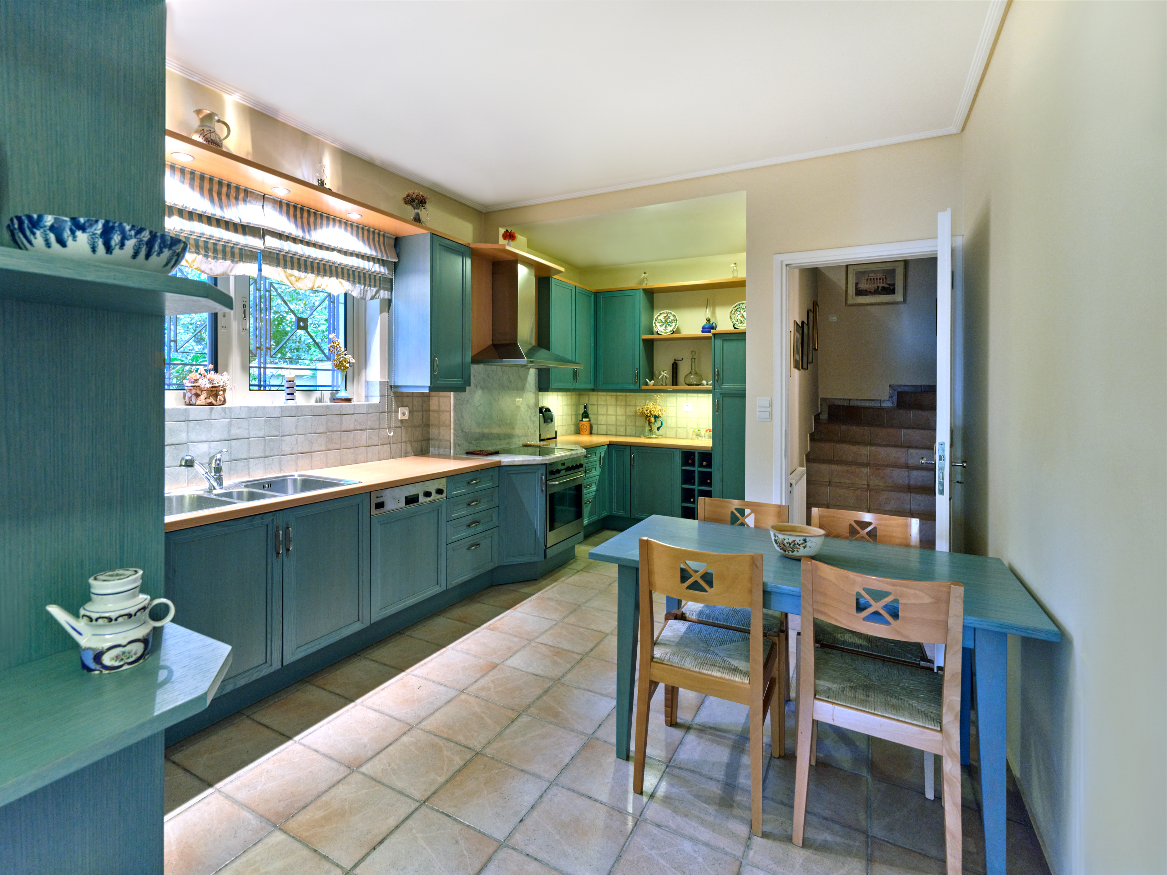 Μια πρακτική αλλά κομψή κουζίνα διαθέτει πράσινα ξύλινα ντουλάπια και ξύλινους πάγκους εργασίας σε αντίθεση, παρέχοντας άφθονο χώρο αποθήκευσης και προετοιμασίας. Ένα ταιριαστό ξύλινο τραπέζι και ανοιχτά ράφια ολοκληρώνουν την εμφάνιση, ιδανικά για την προβολή βιβλίων μαγειρικής και άλλων διακοσμητικών αντικειμένων.