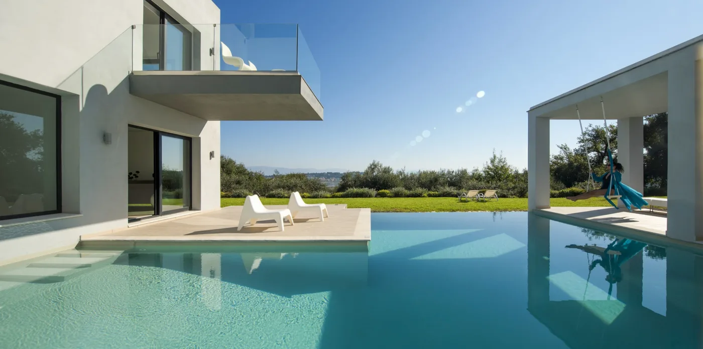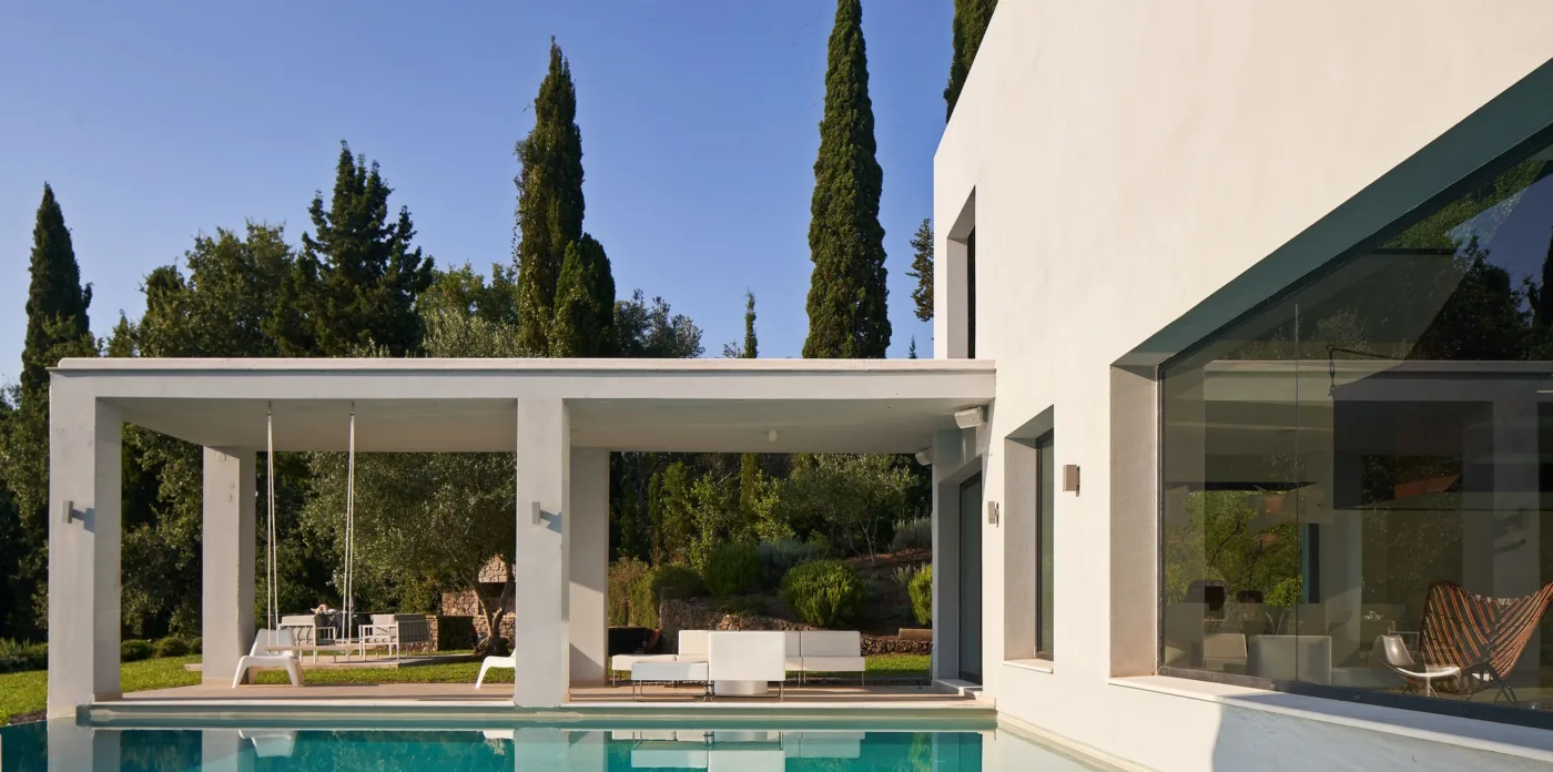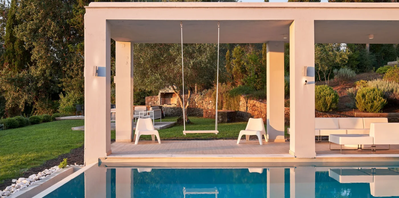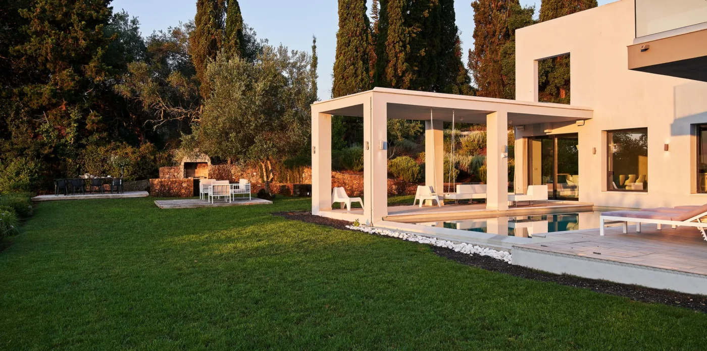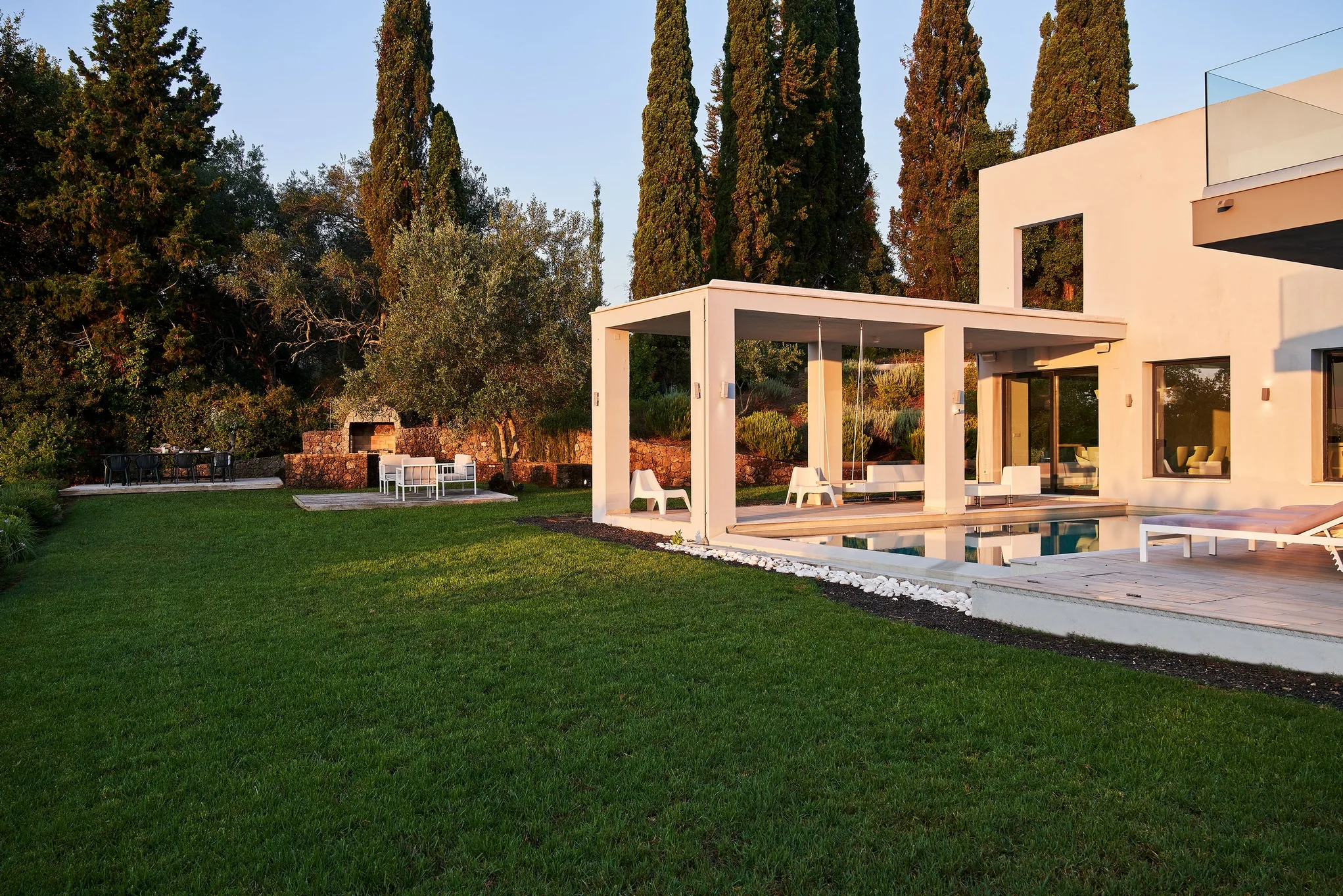 Οι εξωτερικοί χώροι είναι εξίσου εντυπωσιακοί με τους εσωτερικούς, με εκπληκτική ιδιωτική πισίνα σε σχήμα L που περιβάλλεται από ξαπλώστρες, υπαίθριο σαλόνι και σκεπαστή υπαίθρια τραπεζαρία.
