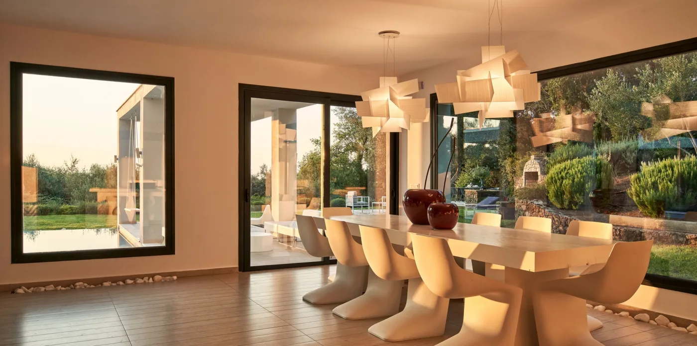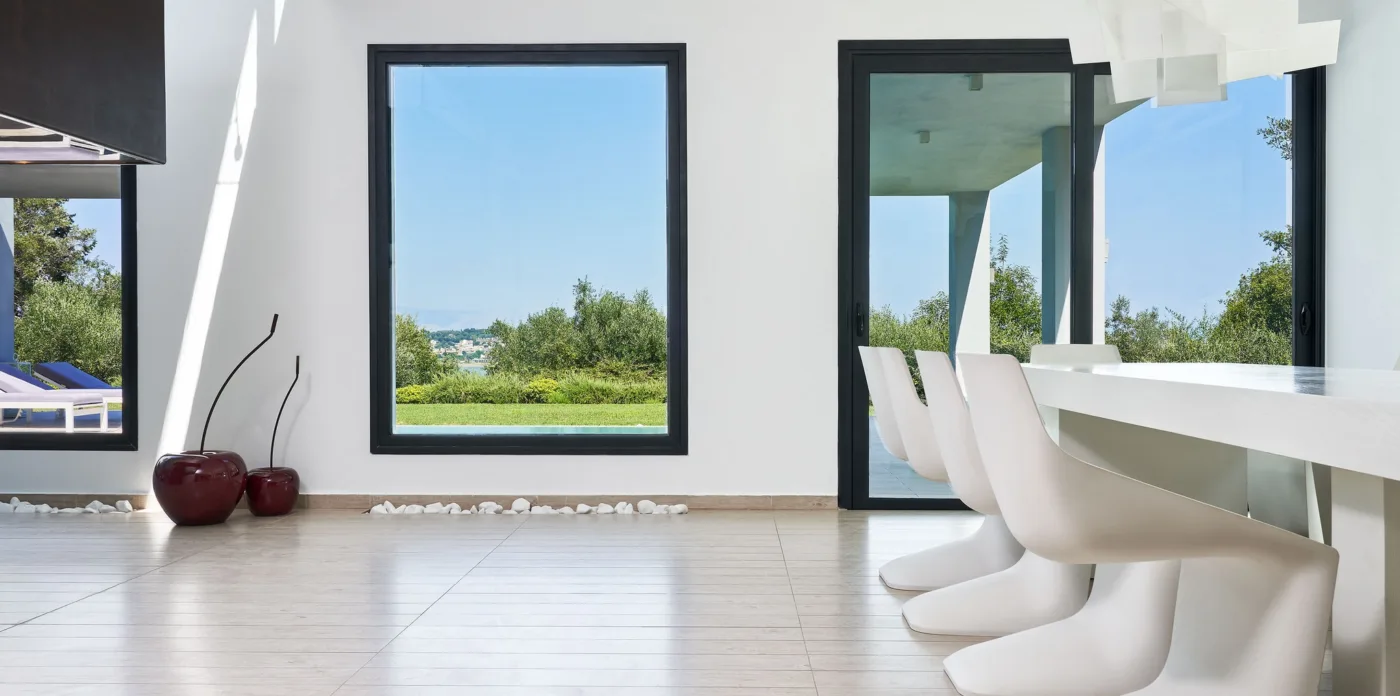 Η κύρια είσοδος ανοίγει στον κύριο καθιστικό χώρο, με παράθυρα από το δάπεδο μέχρι την οροφή που συνδέουν άψογα τους εξωτερικούς με τους εσωτερικούς χώρους και επιτρέπουν στον χώρο να πλημμυρίζει από φυσικό φως.
